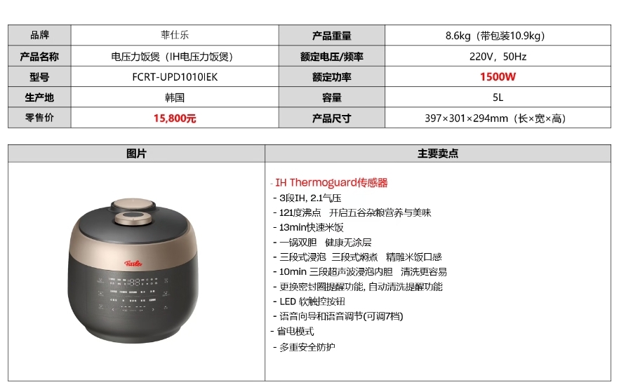 【春上新】10楼菲仕乐 谷物大师电压力饭煲(IH电压力饭煲) 零售价15800~16800元 活动价11880~12880元