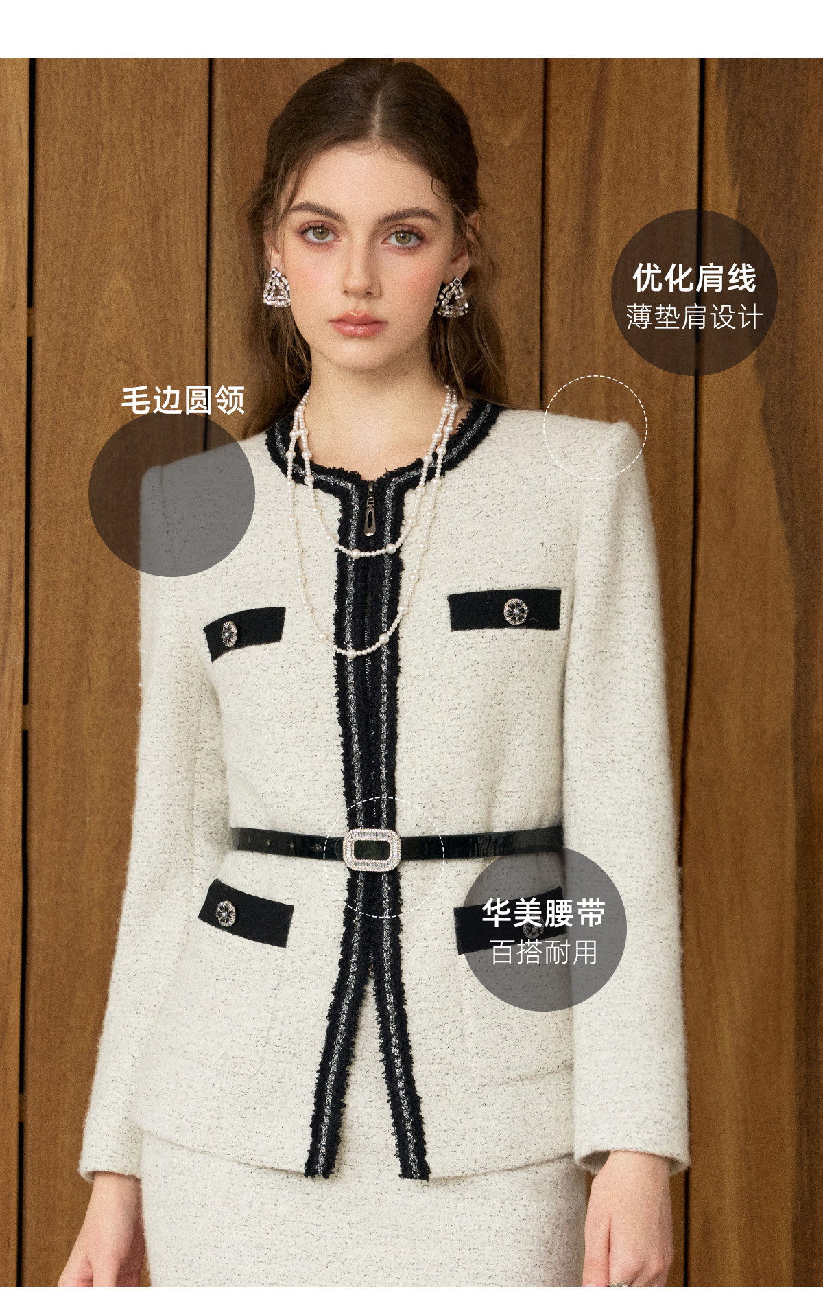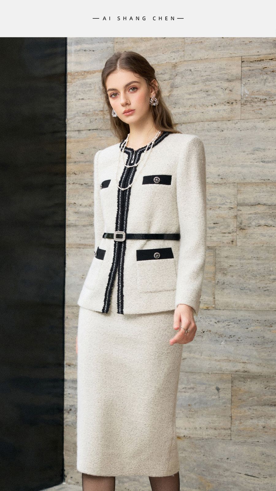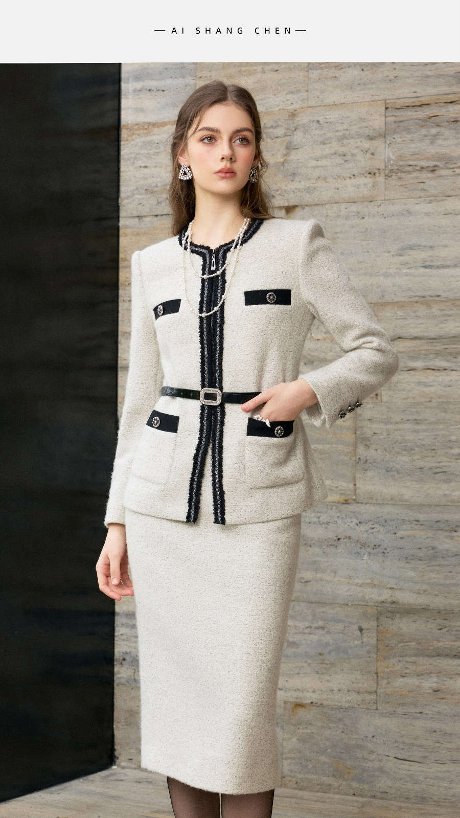 艾尚臣手编织带月光灰羊毛粗花呢小香风短外套女气质套裙两件套冬