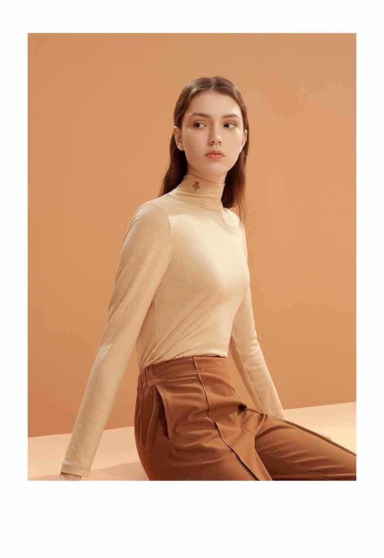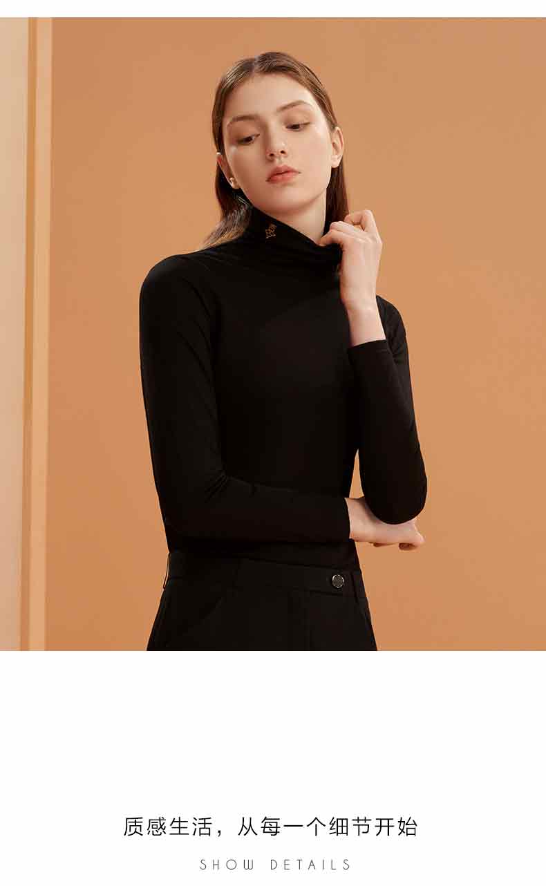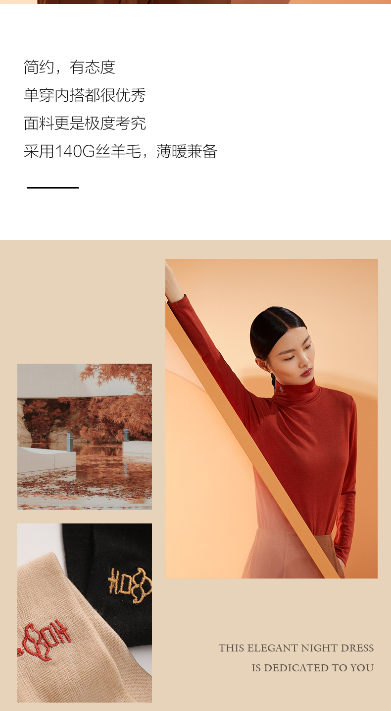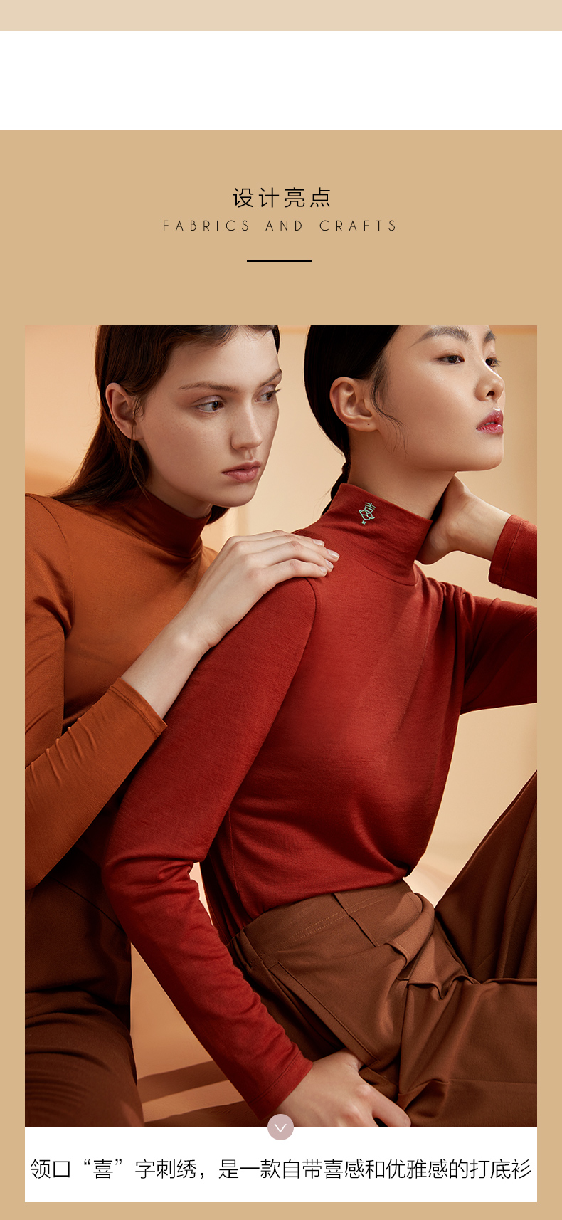 金三塔桑蚕丝上衣女士秋冬新品羊毛高领刺绣内搭保暖打底衫 NZFBD722