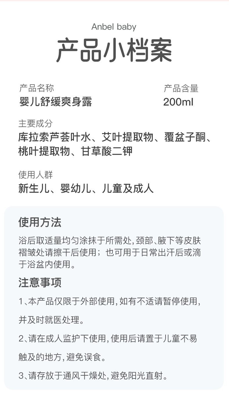 【飒姐专属】安贝儿婴儿舒缓爽身露200ml买一送一