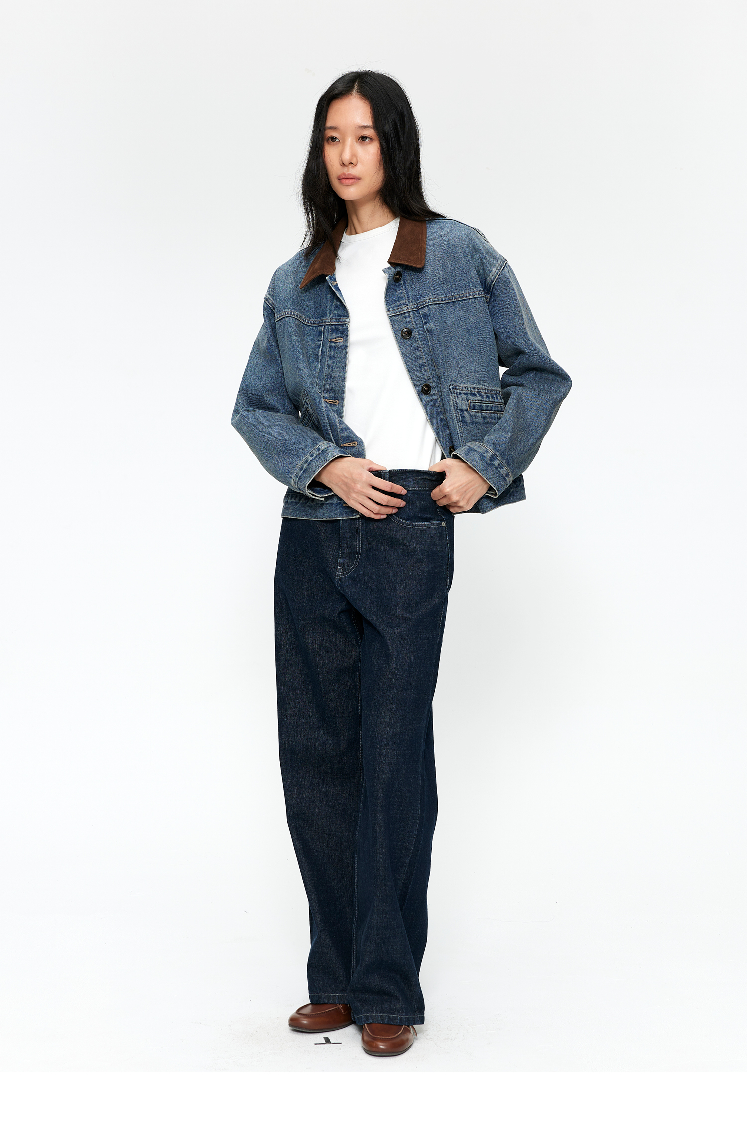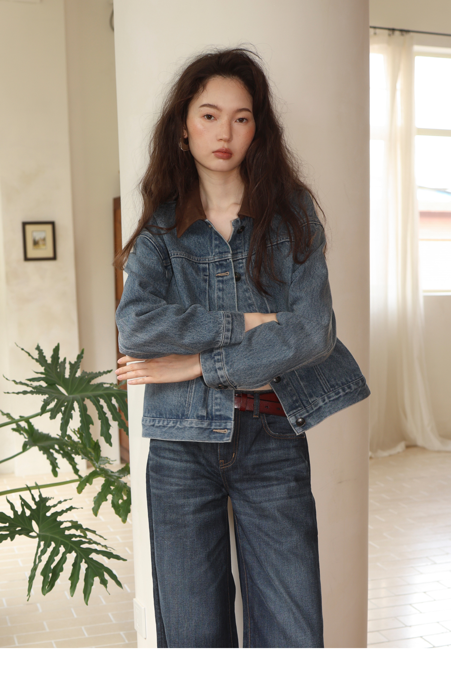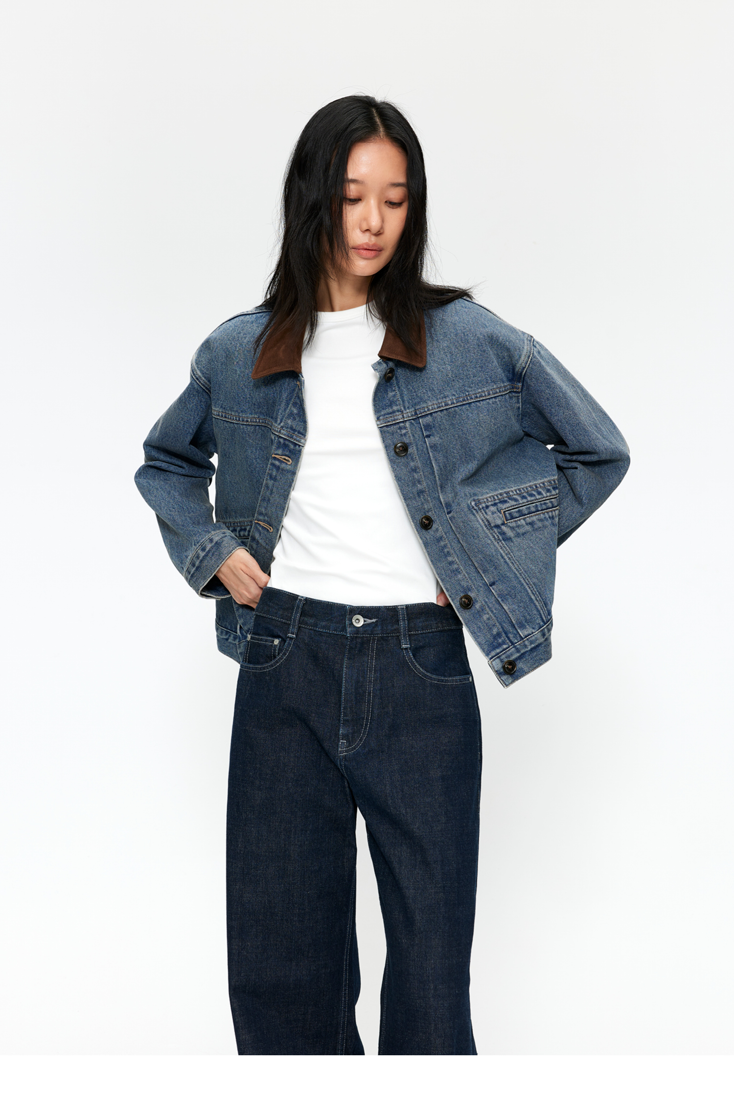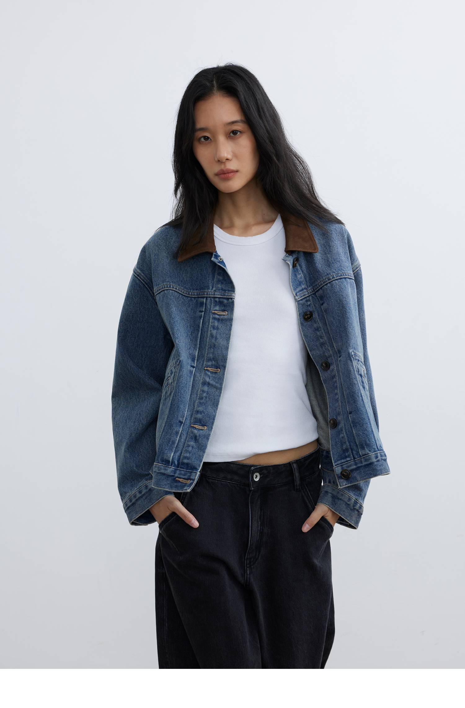 【8/25新品】素舶 纯棉防皱防缩防变形阔版麂皮翻领塔克箱型复古水洗牛仔外套