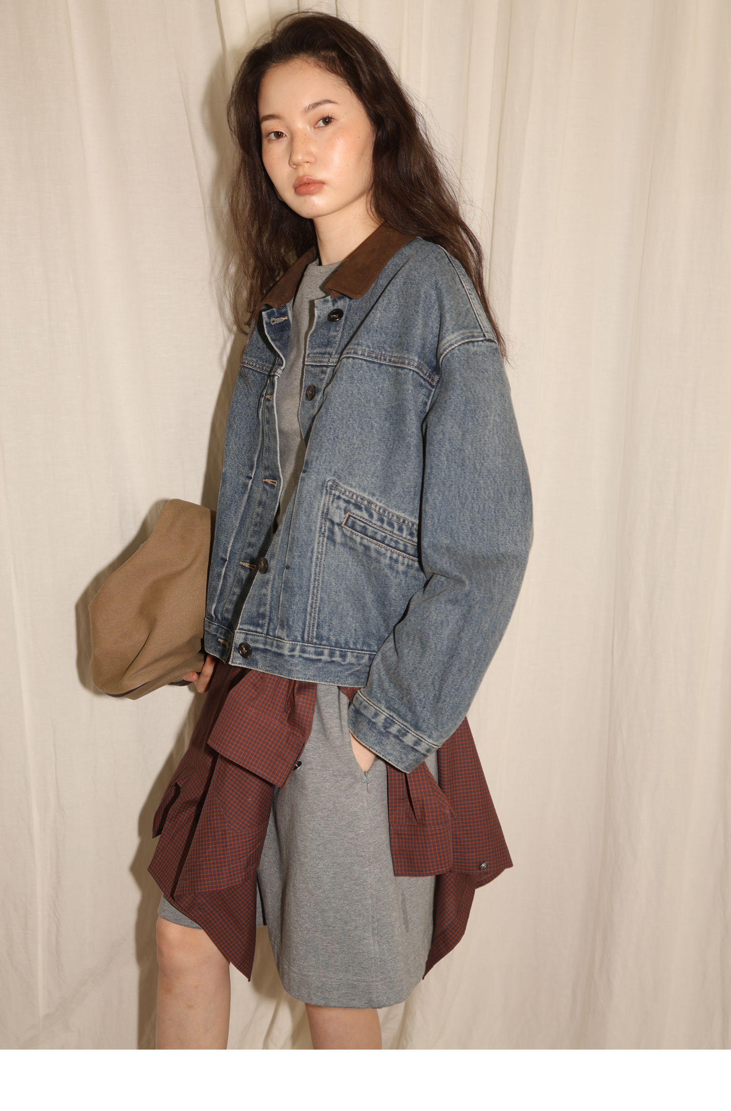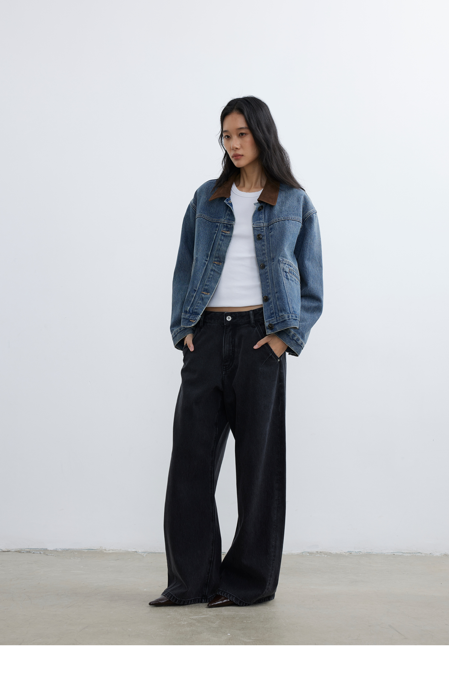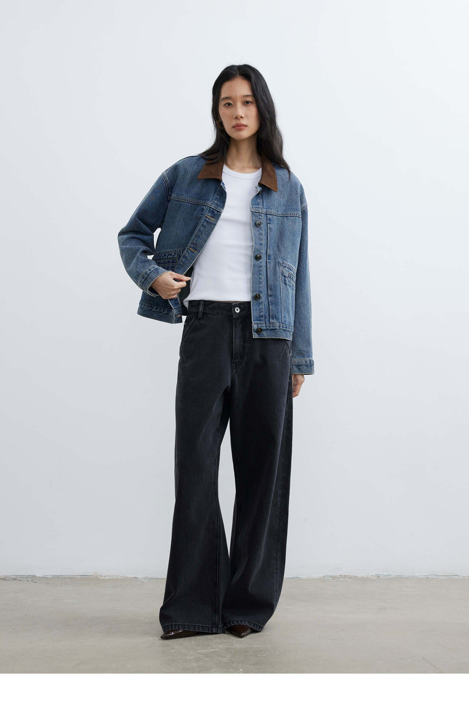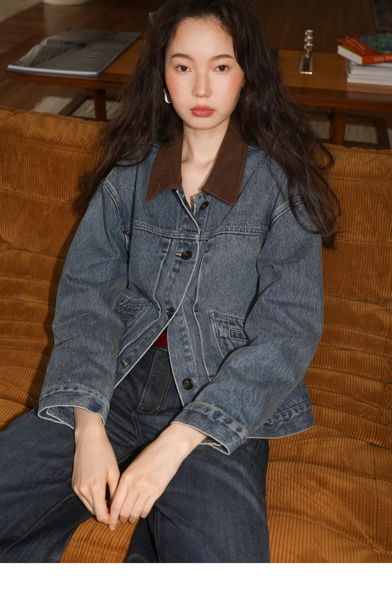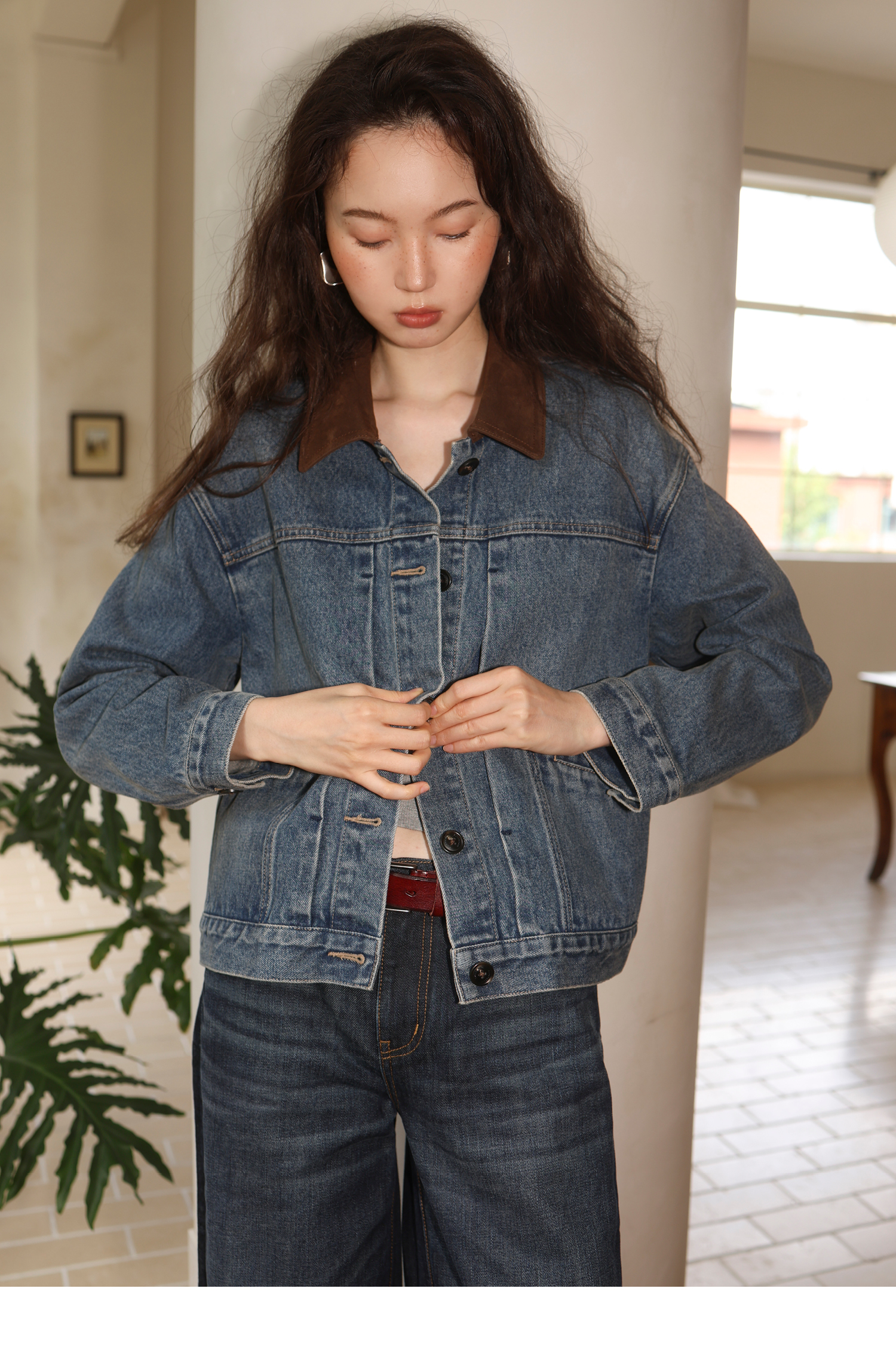 【8/25新品】素舶 纯棉防皱防缩防变形阔版麂皮翻领塔克箱型复古水洗牛仔外套