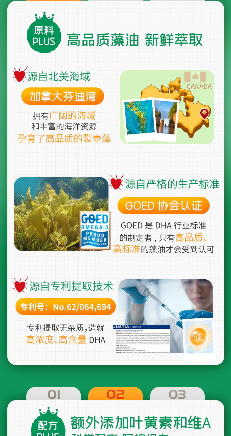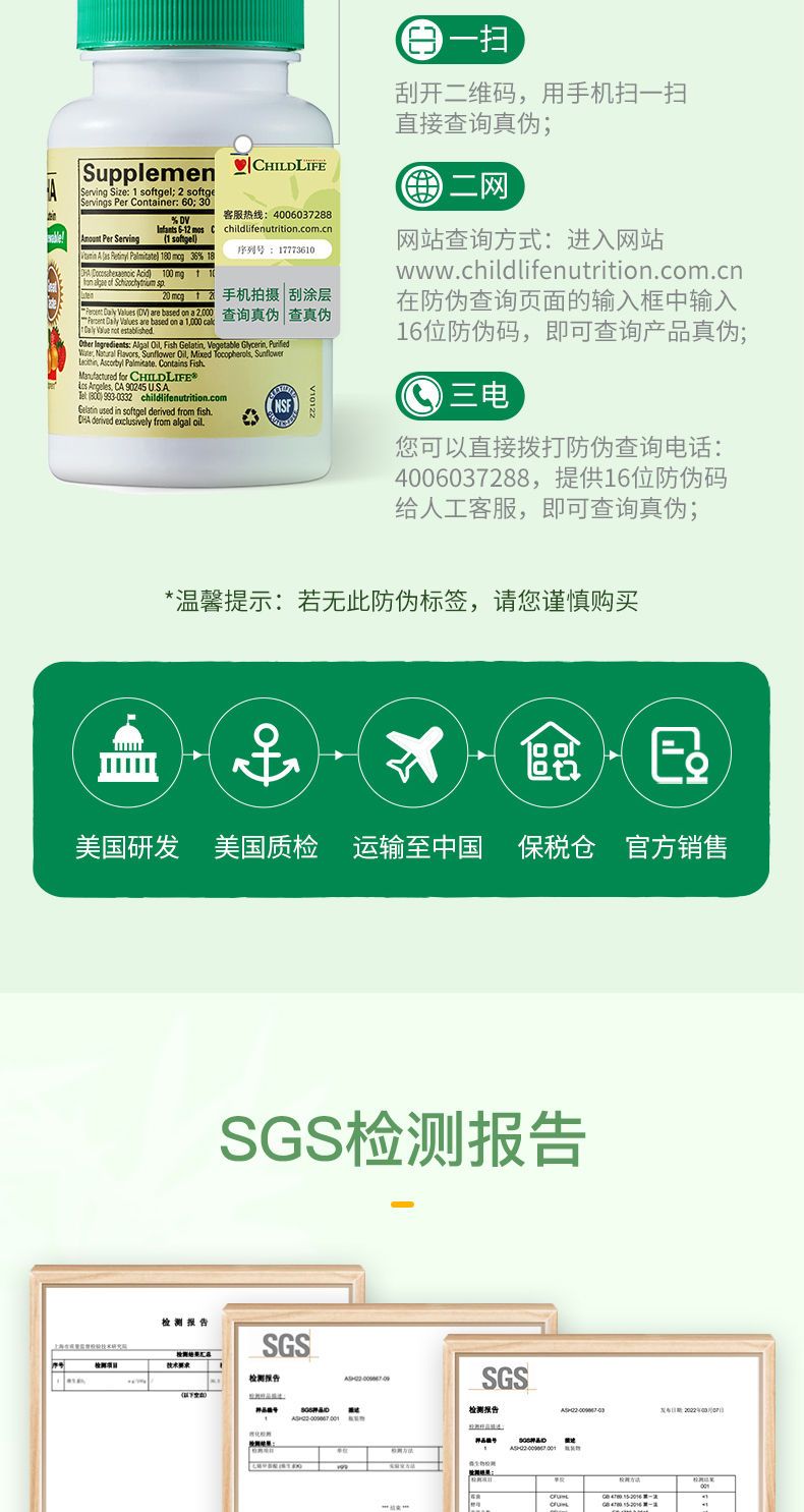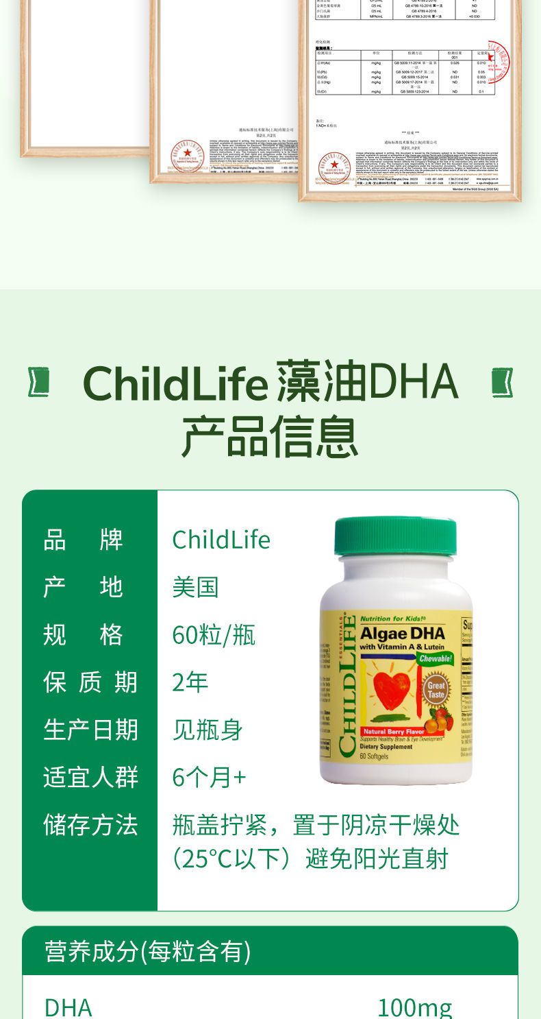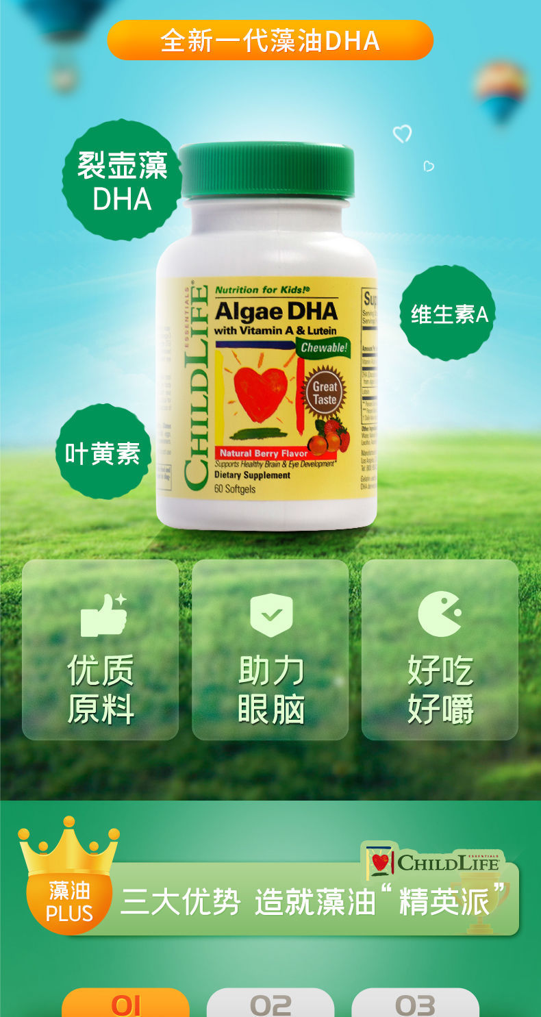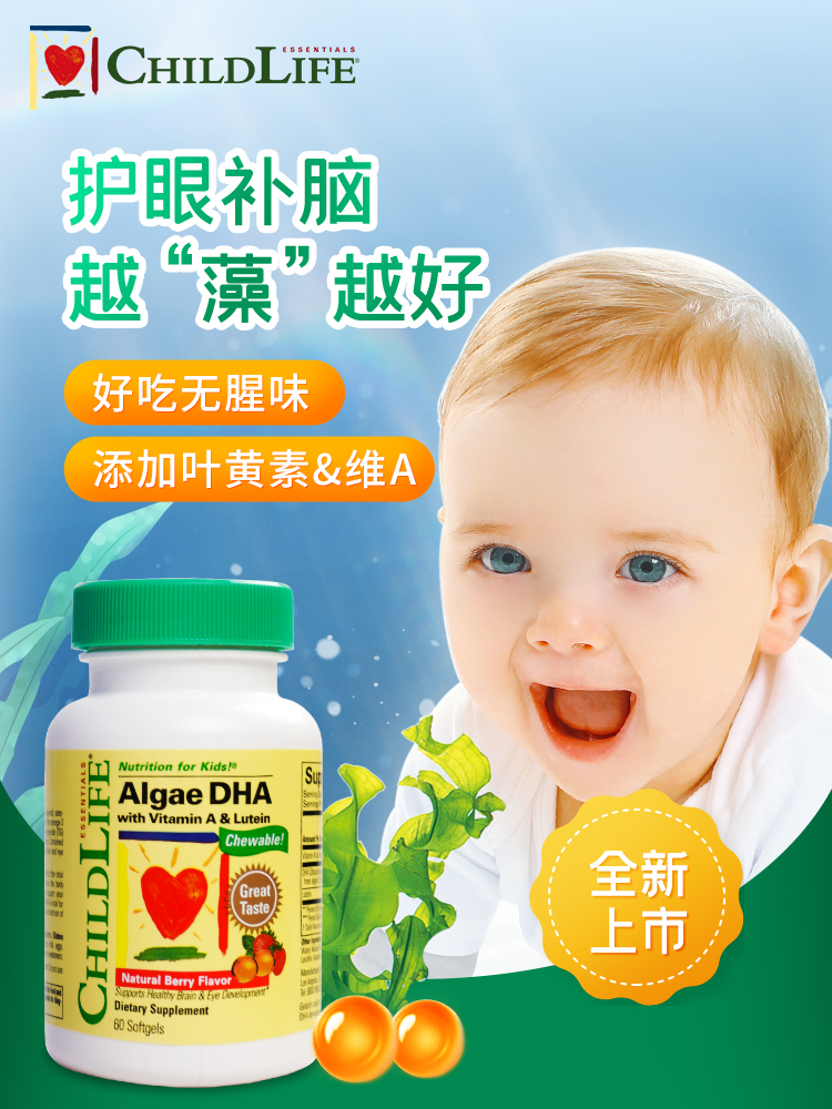 【保税仓】美国童年时光ChildLife儿童藻油DHA软胶囊 60粒/瓶 藻油DHA添加叶黄素&维A