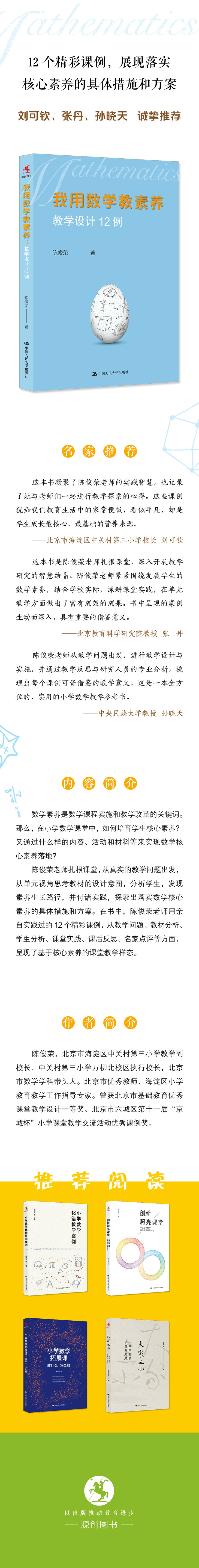 这本书是陈俊荣老师扎根课堂,深入开展教学研究的智慧结晶。陈俊荣老师紧紧围绕发展学生的数学素养,结合学校实际,深耕课堂实践,在单元教学方面做出了富有成效的成果。书中呈现的案例生动而深入,具有重要的借鉴意义。