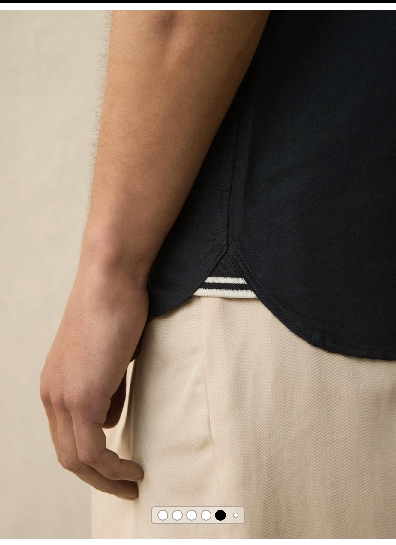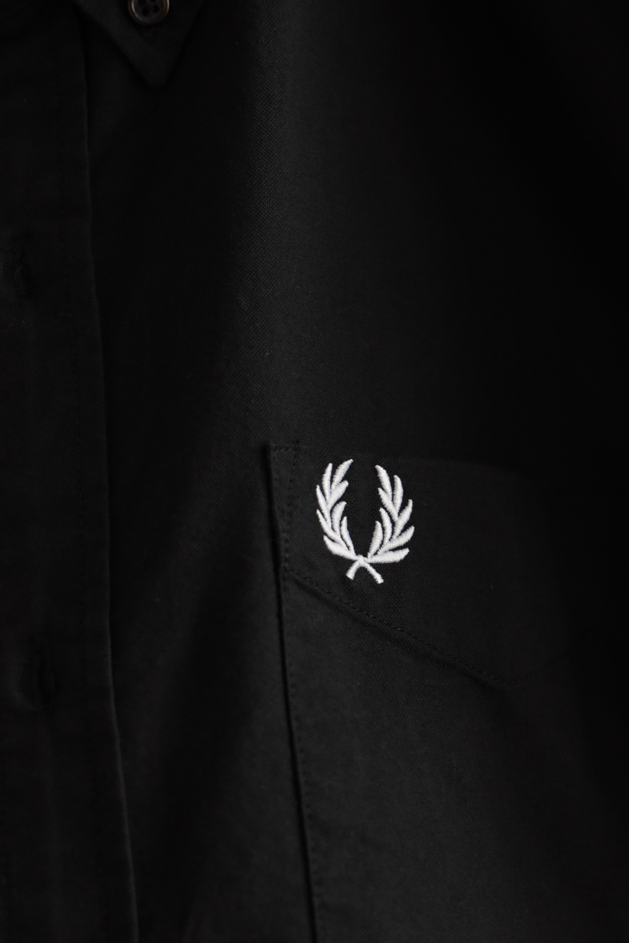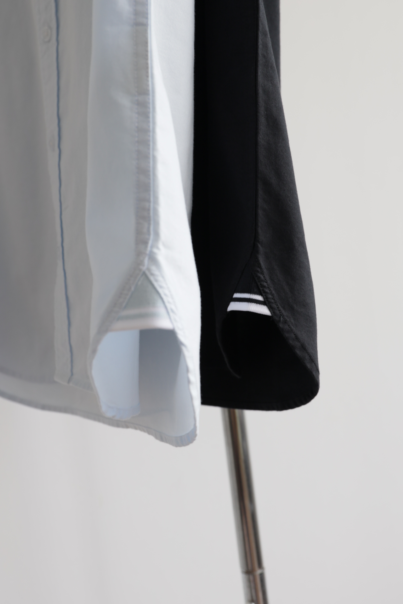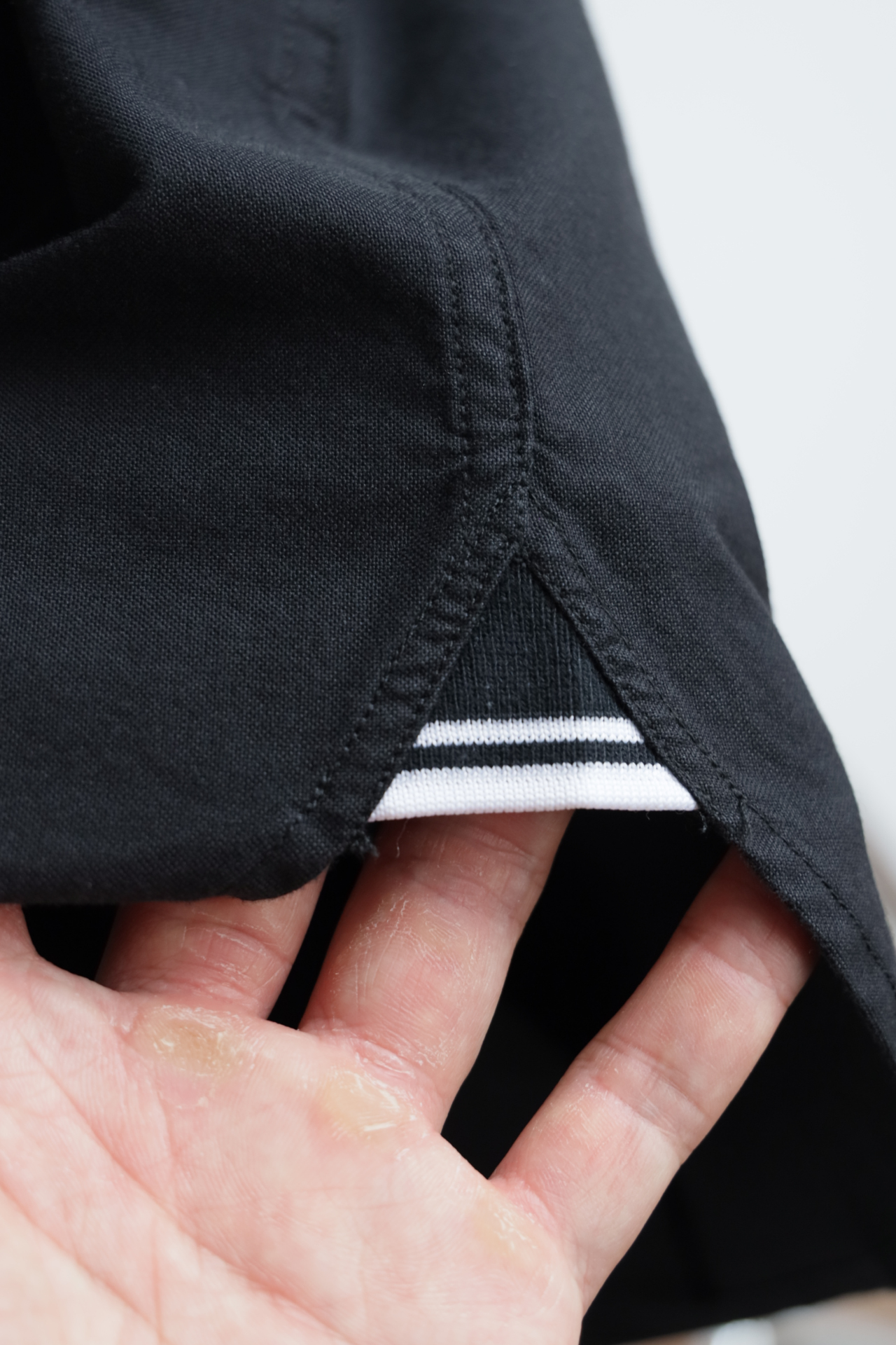 单侧口袋装饰,月桂刺绣点缀,弧形下摆,两侧用拼色螺纹拼边细节