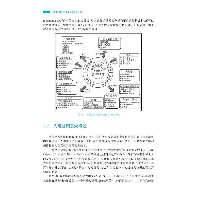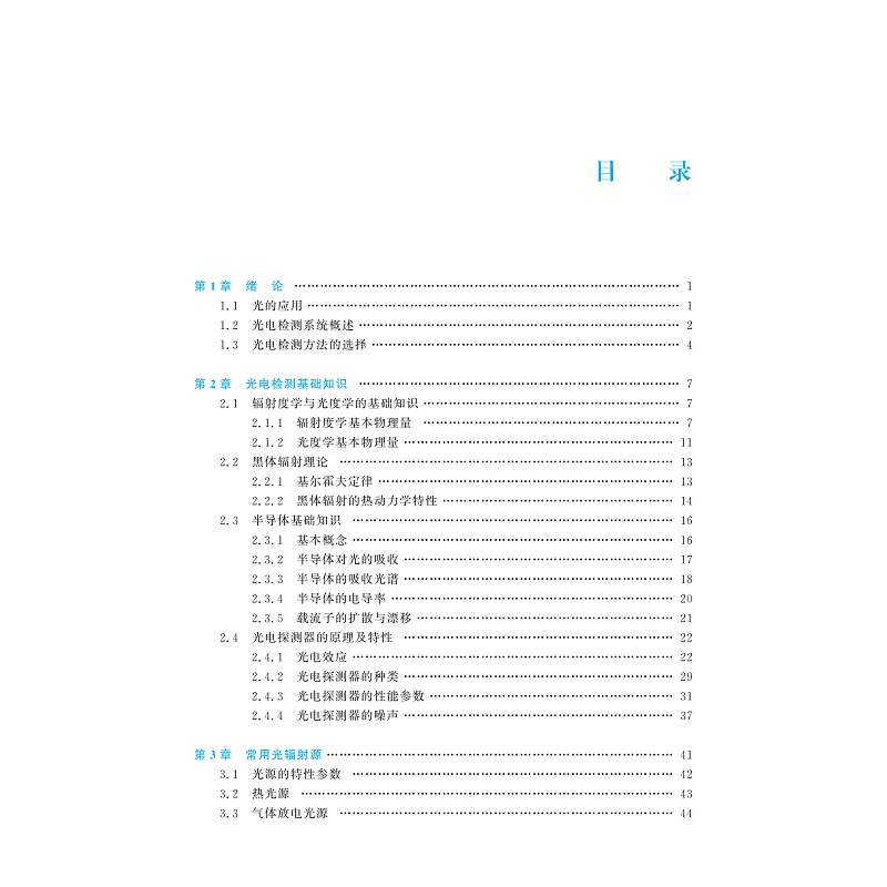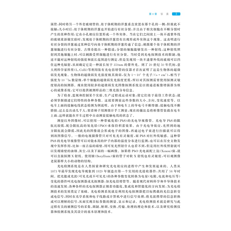 本书主要研究各类光电器件的组成、工作原理、特性参数及光电转换的基本电路和实际应用。本书稿是在前面两个版本的基础上进行修缮,使得整本书更加严谨专业,内容结构上更加完整全面。本书稿共分为12章:第1章为绪论,第2章介绍光电检测基础知识,第3-6章分别讲述常用光辐射、内/外光电效应探测器、红外热探测器的工作原理及其典型应用等,第7章介绍光电信号的调制与扫描,第8章介绍光电检测电路与信号处理,第9章和第10章分别论述光电直接检测技术与系统、光外差检测技术与系统的原理及应用等,第11章是图像检测技术与系统,第12章是光谱检测技术与系统。