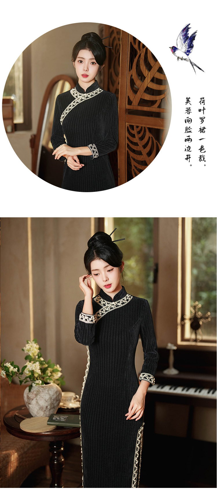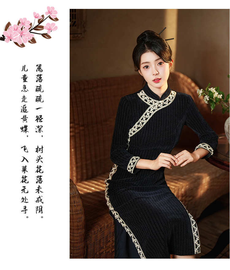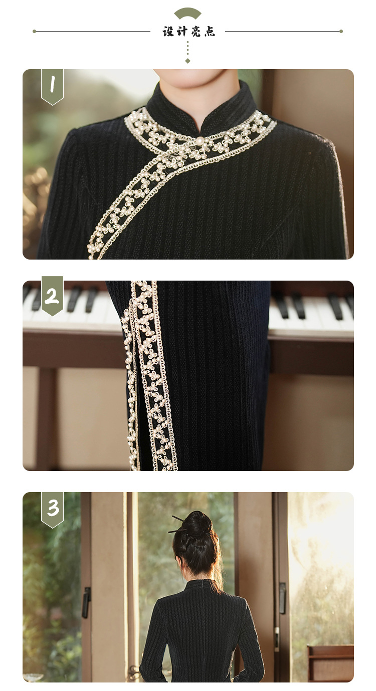 ML3215深海蓝秋冬旗袍长款雪尼尔手工钉珠旗袍单层新款日常复古旗袍