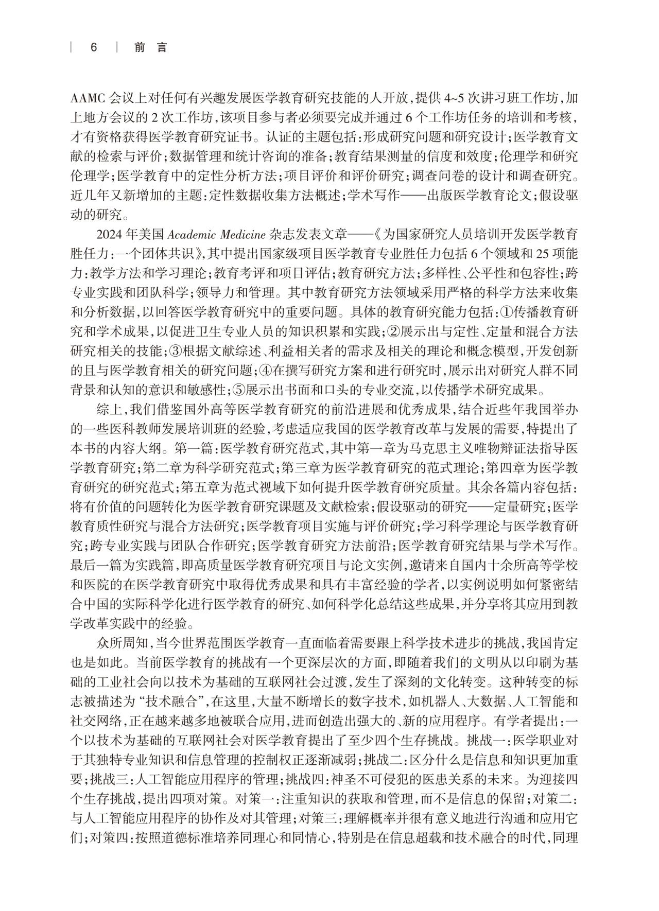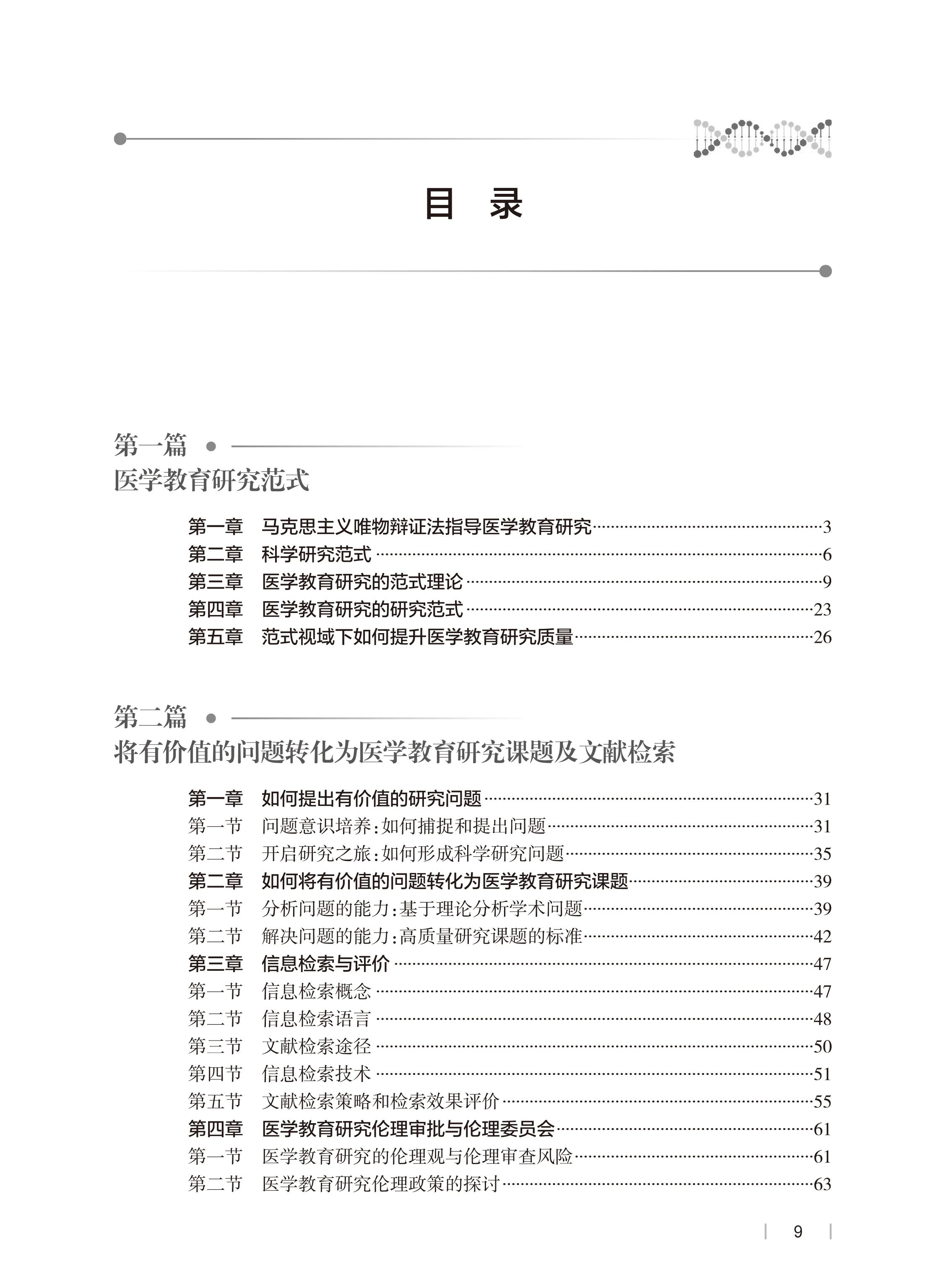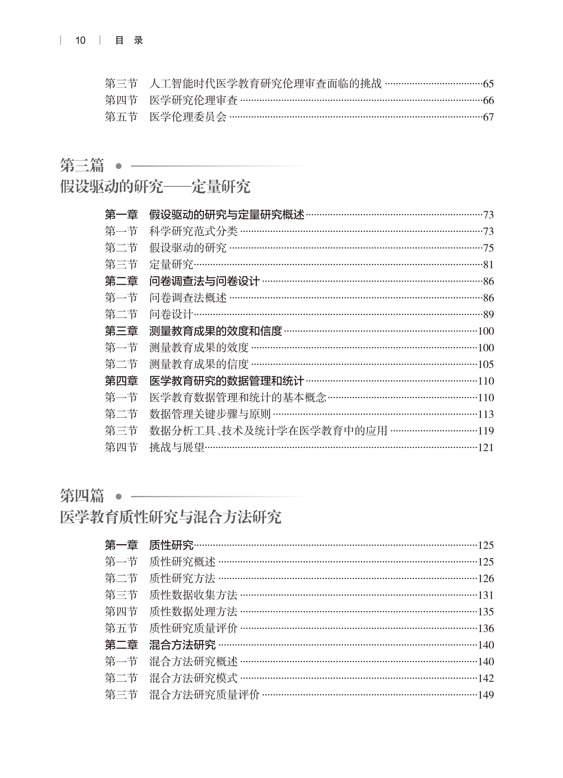 系统介绍医学教育研究的多元方法(定量、质性、混合研究等),从选题设计到项目实施,再到成果总结与学术写作,形成完整的研究闭环,并包含前沿领域。