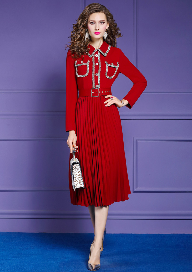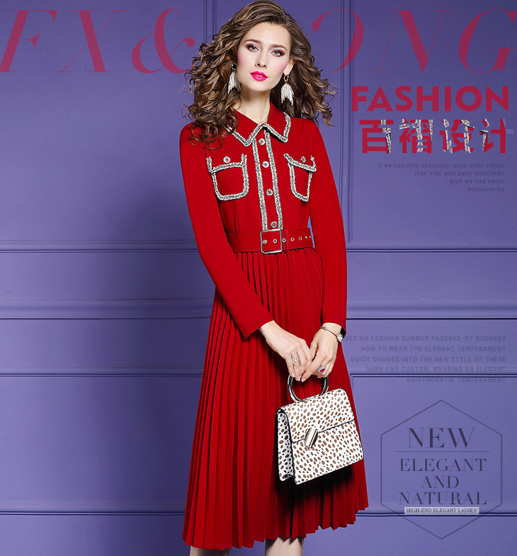FMY-28426春季新款轻熟气质收腰翻领中长款百褶裙