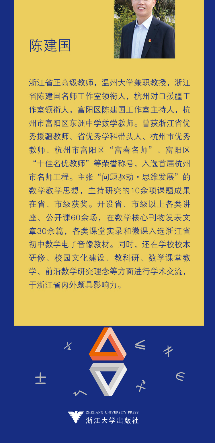 陈建国,浙江省正高级教师,温州大学兼职教授,浙江省陈建国名师工作室领衔人,杭州对口援疆工作室领衔人,富阳区陈建国工作室主持人,杭州市富阳区东洲中学数学教师。曾获浙江省优秀援疆教师、省优秀学科带头人、杭州市优秀教师、杭州市富阳区“富春名师”、富阳区“十佳名优教师”等荣誉称号,入选首届杭州市名师工程。主张“问题驱动·思维发展”的数学教学思想,主持研究的10余项课题成果在省、市级获奖。开设省、市级以上各类讲座、公开课60余场,在数学核心刊物发表文章30余篇,各类课堂实录和微课入选浙江省初中数学电子音像教材。同时,还在学校校本研修、校园文化建设、教科研、数学课堂教学、前沿教学研究理念等方面进行学术交流,于浙江省内外颇具影响力。