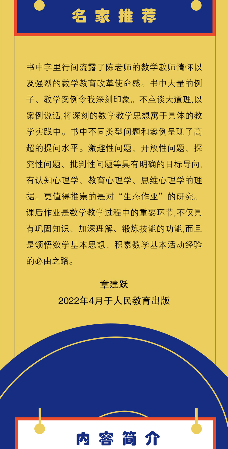 本书从学生思维发展的现状和数学学科发展的时代需求出发,进行了基于问题解决的一般思维发展课堂和高阶思维发展课堂的探索,同时对作业评价与作业设计策略等细节问题也进行了阐述,倡导“以作业为载体”的评价体系及其变革方向。本书不仅是作者近三十年教学实践经验的总结,也是在实践基础上累积的宝贵研究成果,对一线教学教师和致力于学生数学思维培养研究的学者来说,具有非常高的启发、借鉴和参考价值。