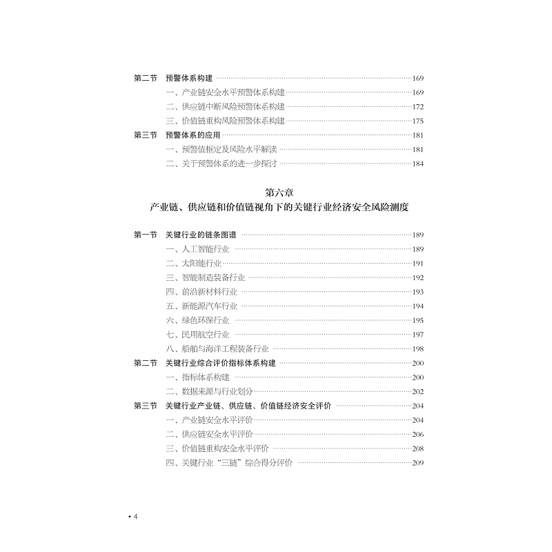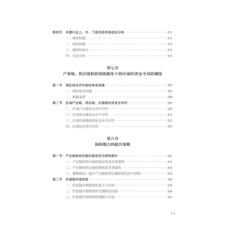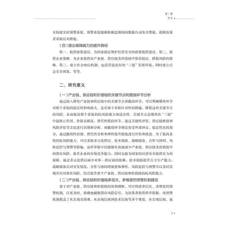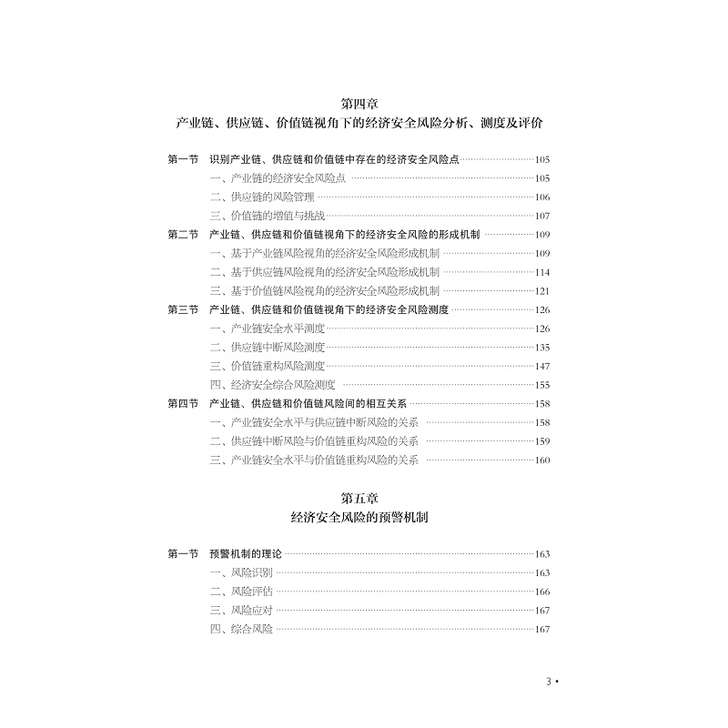 本著作首先对产业链、供应链和价值链的概念进行了精准界定,并深入探讨了这三者的构成特征及其相互之间的复杂关系与影响机制。其次,聚焦于经济安全风险,对产业链、供应链和价值链中的风险点进行了识别,并深入剖析了其形成机制;基于三链的视角,对经济安全风险进行了全面测度,包括产业链安全水平、供应链中断风险、价值链重构风险及经济安全综合风险评估,并深入探讨了这三链风险之间的内在联系与相互影响。最后在全面评估风险与预警机制的基础上,提出了提升保障能力的策略,包括增强产业链供应链的稳定性与韧性、推动价值链的升级转型、提升危机应对能力,以及加强经济安全监管与风险防范。