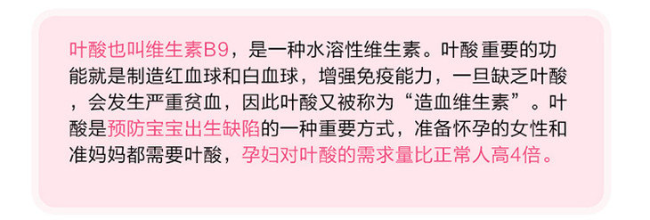 2、预防孕妇贫血,孕妇的身体需要叶酸来制造正常的红细胞