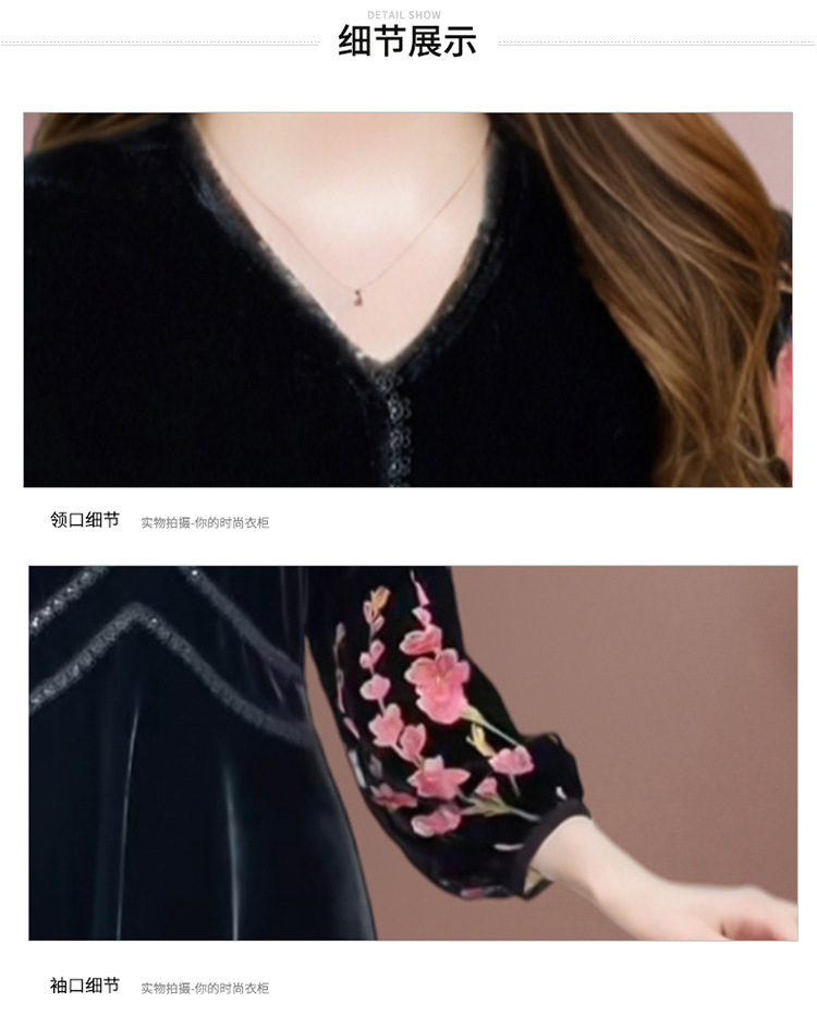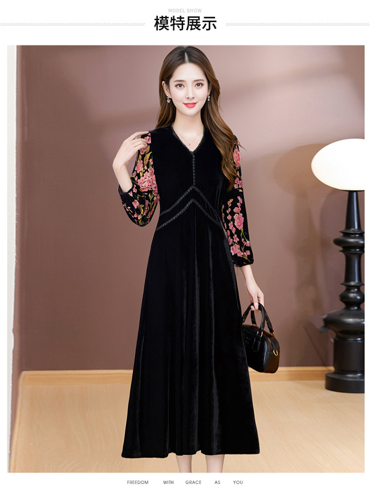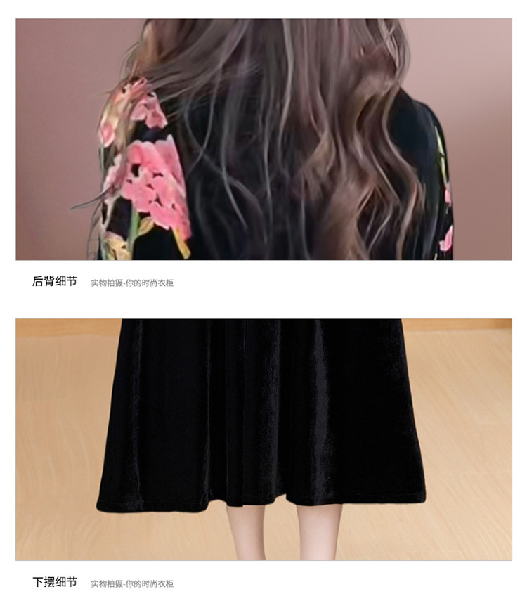 QYM SMAT100通勤风V领印花金丝绒连衣裙A字裙收腰显瘦气质裙 商品图3