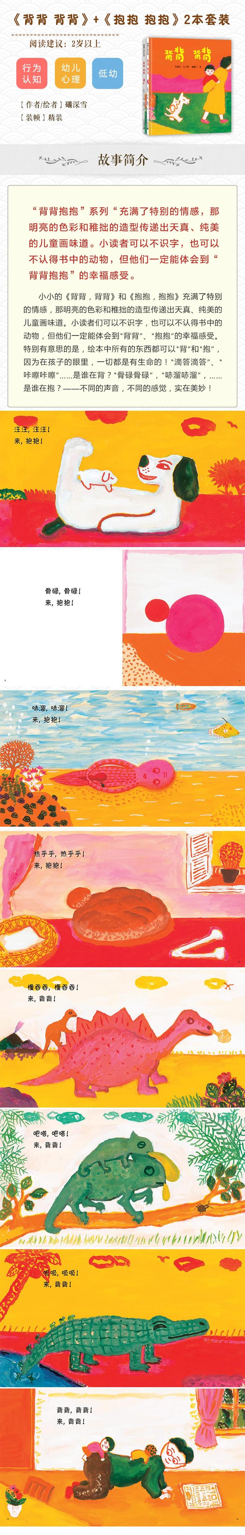 小小的《背背,背背》和《抱抱,抱抱》充满了特别的情感,那明亮的色彩和稚拙的造型传递出天真、纯美的儿童画味道。小读者们可以不识字,也可以不认得书中的动物,但他们一定能体会到“背背”、“抱抱”的幸福感受。特别有意思的是,绘本中所有的东西都可以“背”和“抱”,因为在孩子的眼里,一切都是有生命的!“滴答滴答”、“咔嚓咔嚓”……是谁在背?“骨碌骨碌”,“哧溜哧溜”,……是谁在抱?——不同的声音,不同的感觉,实在美妙! 也许,“背背”、“抱抱”早已是我们特别熟悉的场景,但是每个人都会相信,对于宝宝和他们的亲人来说,那绝不仅仅是两个简单的动作,更是内心情感的温馨表达。“来,背背——”“来,抱抱——”在亲切的呼唤声中,宝宝们准会一边伸出小手,一边漾起发自内心的微笑,他们知道:后背上和臂弯里永远住着力量、安全、抚慰……还有很多永远说不尽的深情和甜蜜。读了《背背》、《抱抱》,一定要记得常跟宝宝“背背”,“抱抱”!这样,长大的宝宝一定会拥有坚实有力的背,一定会懂得向别人敞开爱的怀抱!