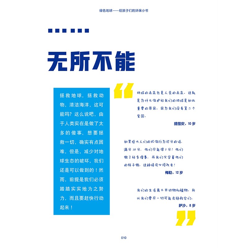 3. 22个孩子生动鲜活的环保宣言,增强阅读地参与度、亲切感。