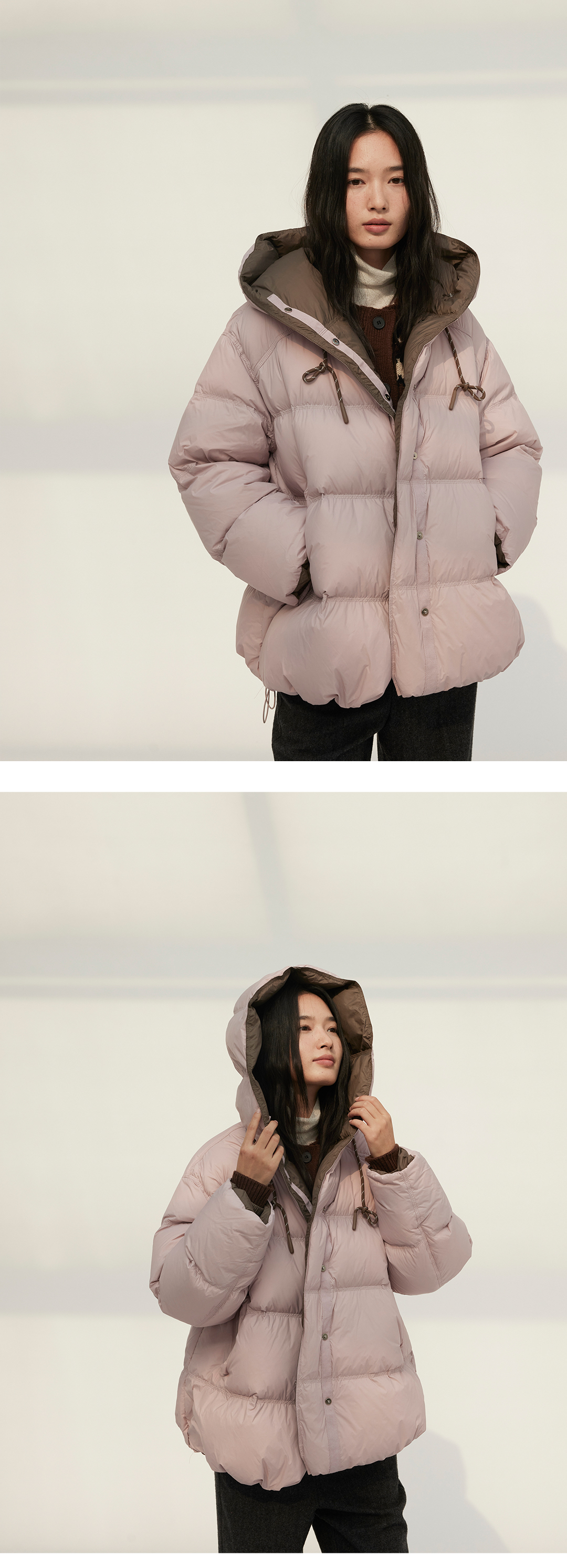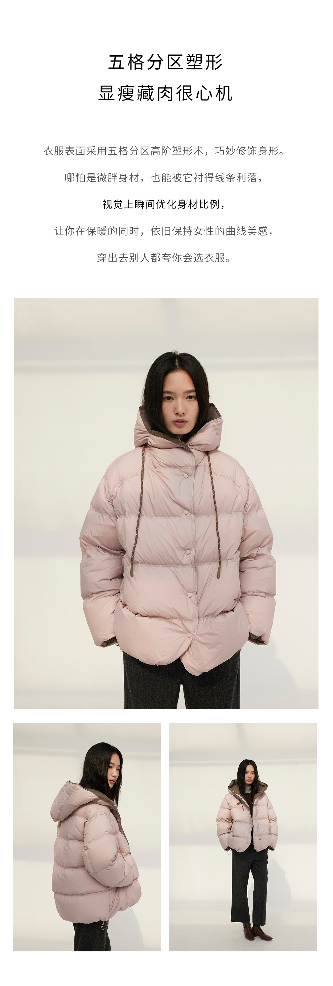 HeyDress撞色宽松连帽抽绳羽绒服