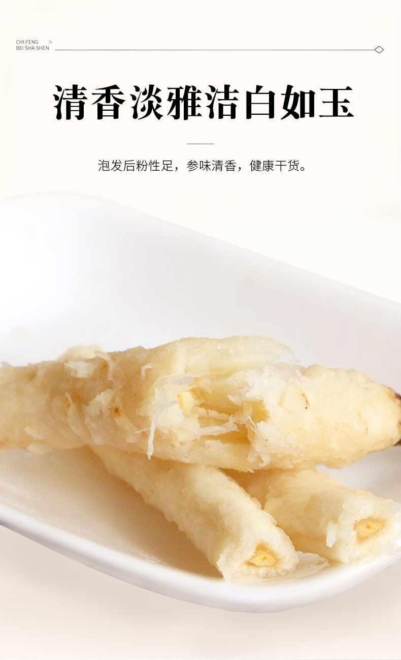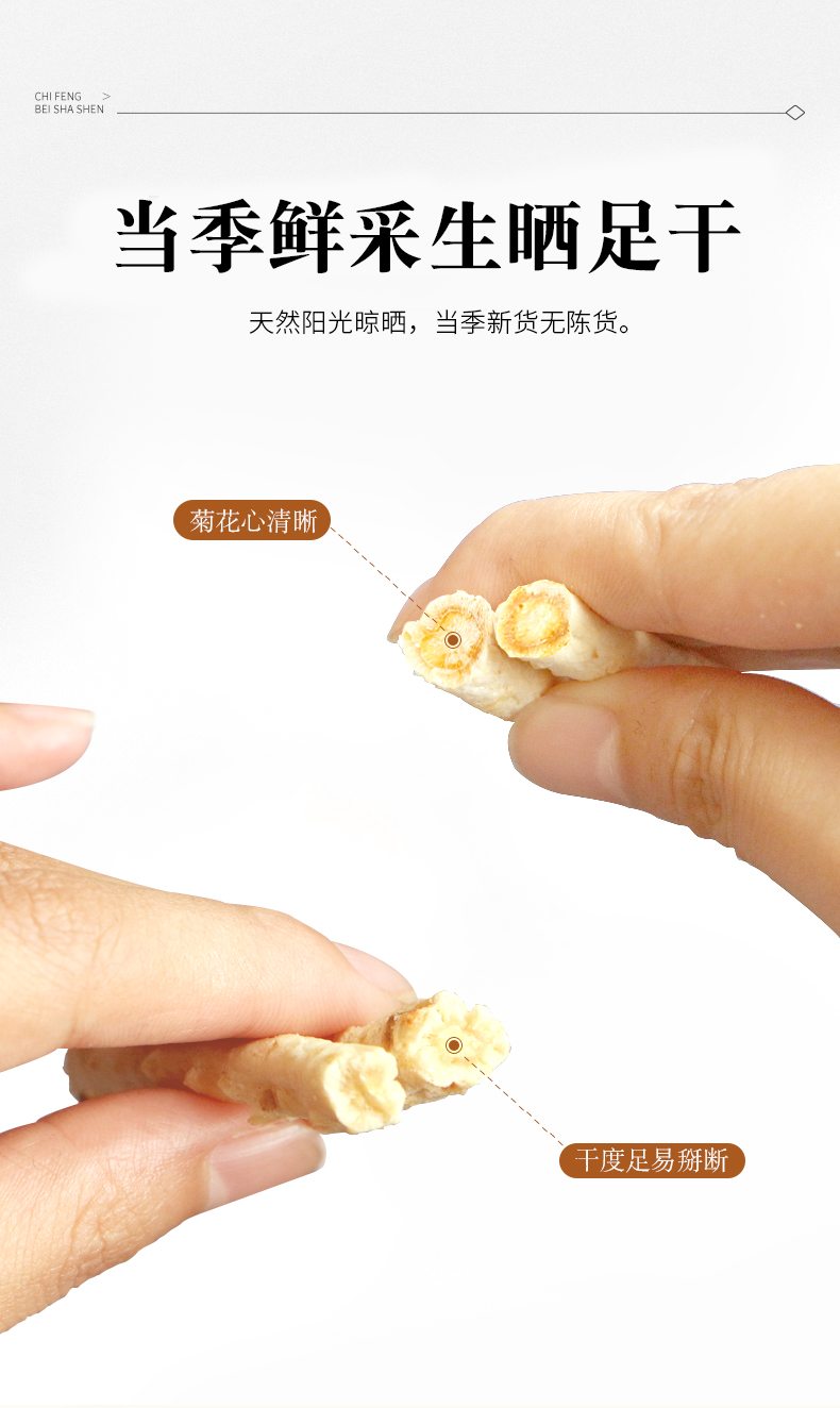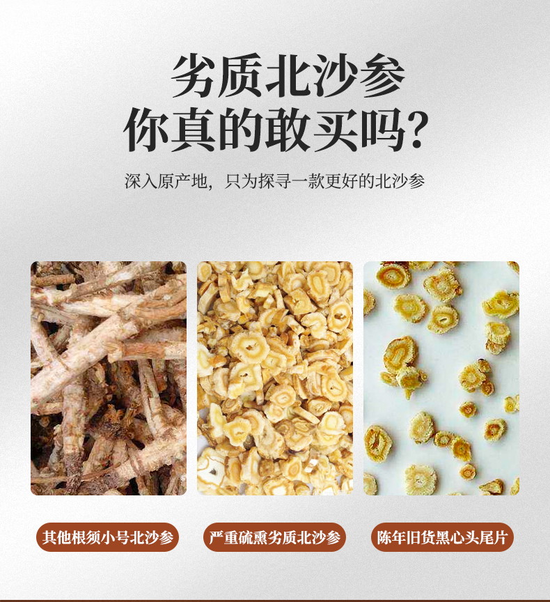 采访当地药材协会领导,了解一些行业信息,所以咱们采购的北沙参为营养更为富集的整根产品,仿制切段产品有腐烂的情况除外,不要陈货。整根北沙参外观呈现黄白色,掰开有明显的菊花纹,拒绝熏硫更安全的呈现给养生的观众。