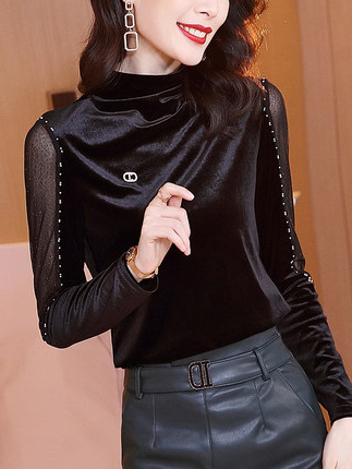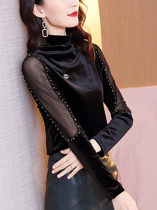 TGG-金丝绒打底衫内搭气质半高领黑色网纱钉珠长袖T恤