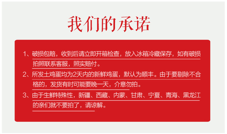 每日13:30截单,24-48小时发货。所发鸡蛋均为两天内新鲜鸡蛋,因筛选严格,可能会有所延迟,敬请谅解。