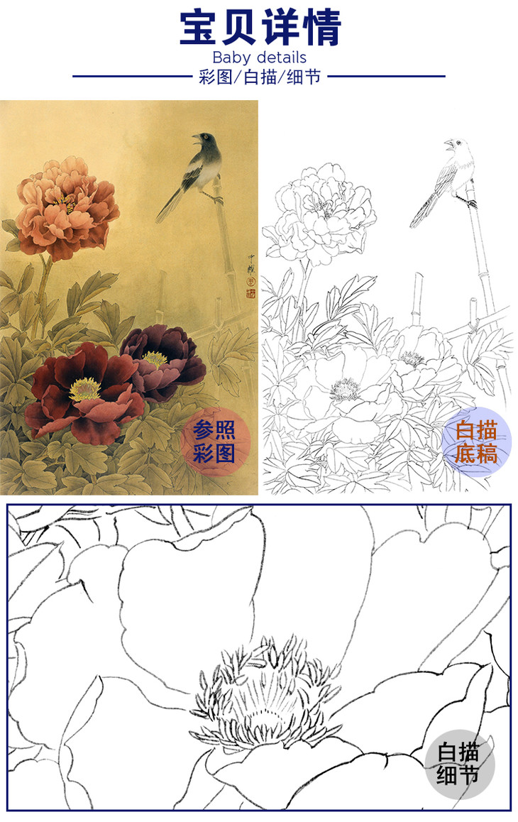 竖幅工笔花鸟白描底稿-周中耀-牡丹《天香驻喜》-多种白描尺寸可选-ZT09