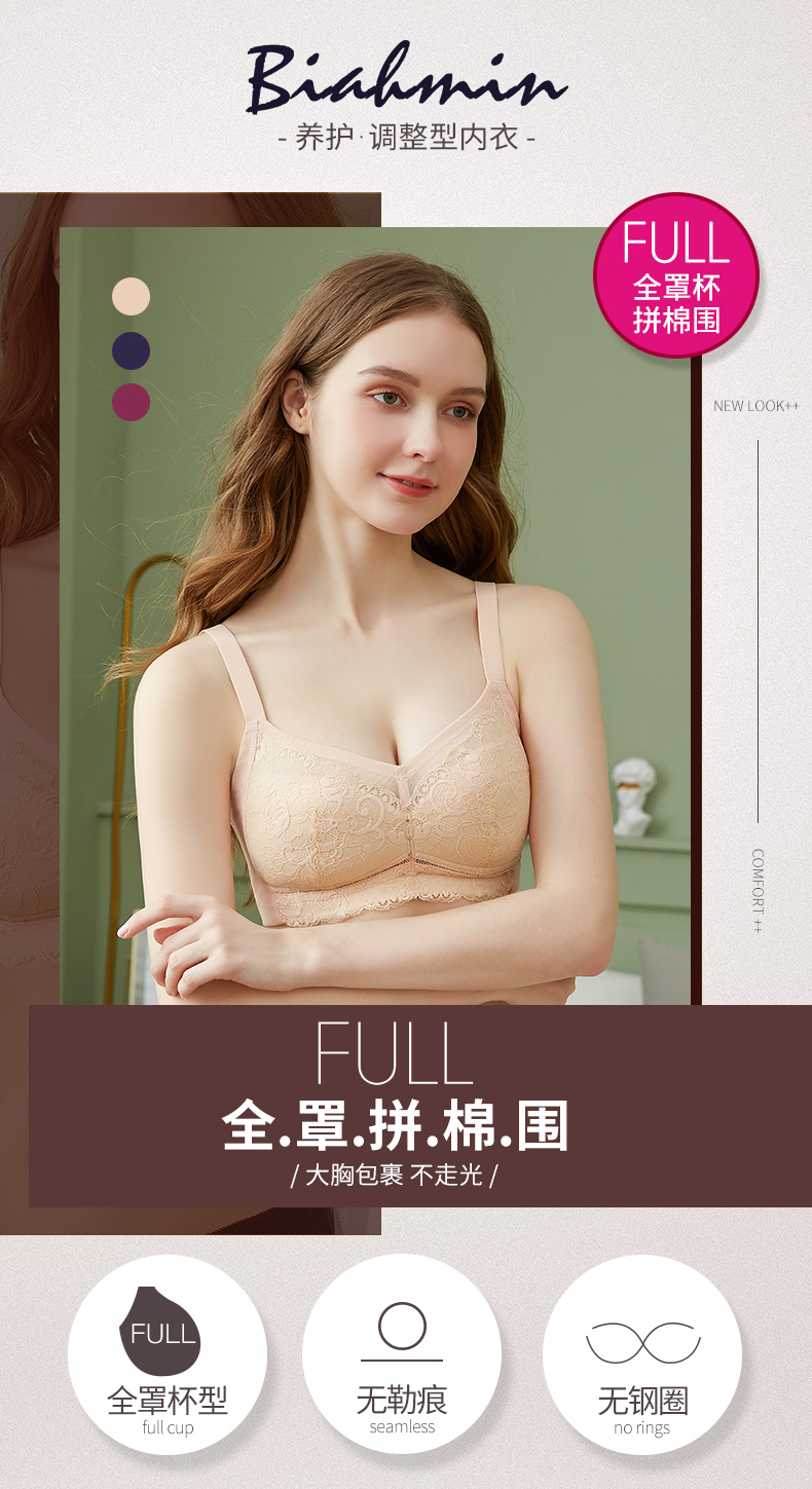 蕾丝薄款全罩杯大胸显小防外扩无钢圈全杯型E杯文胸BW95701
