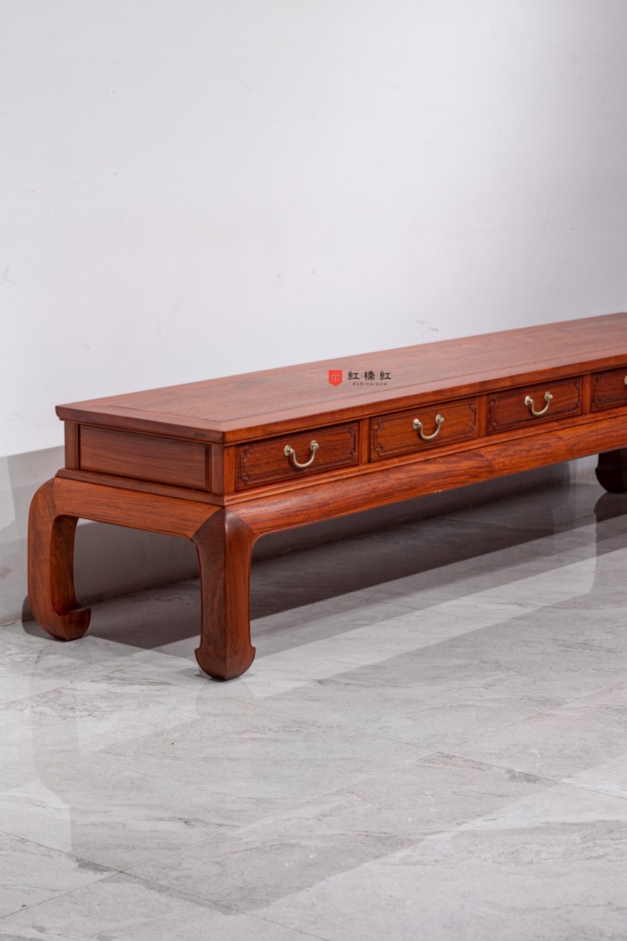 随着时代的发展,生活习惯的改变电视柜被广泛作电视柜使用,这是市面上常见的一款电视柜,造型端庄大方,电视柜面攒框镶独板面,设五具抽屉一字并列,抽屉面铲底起委角线,装铜拉手,腿足厚实做鼓腿彭牙内翻马蹄腿,造型大气,承重好。