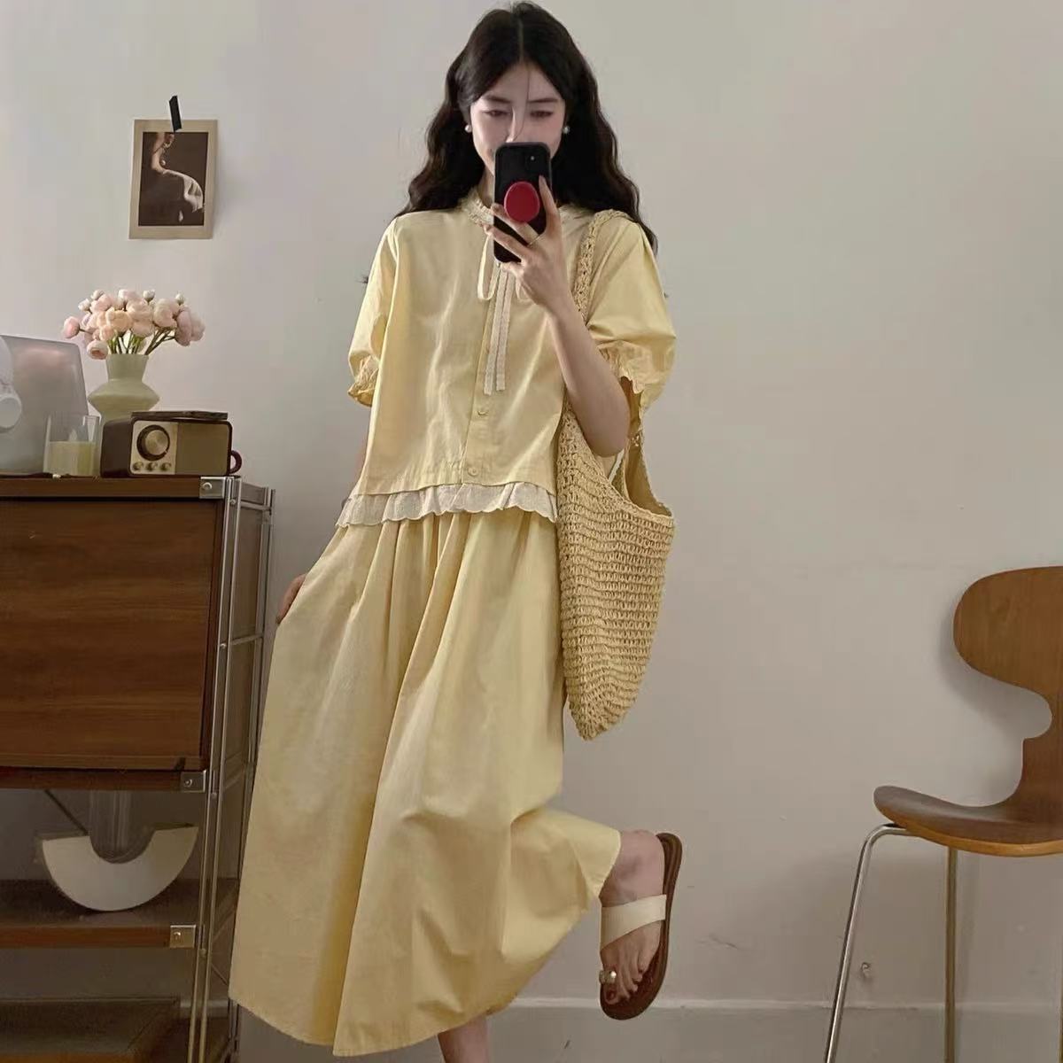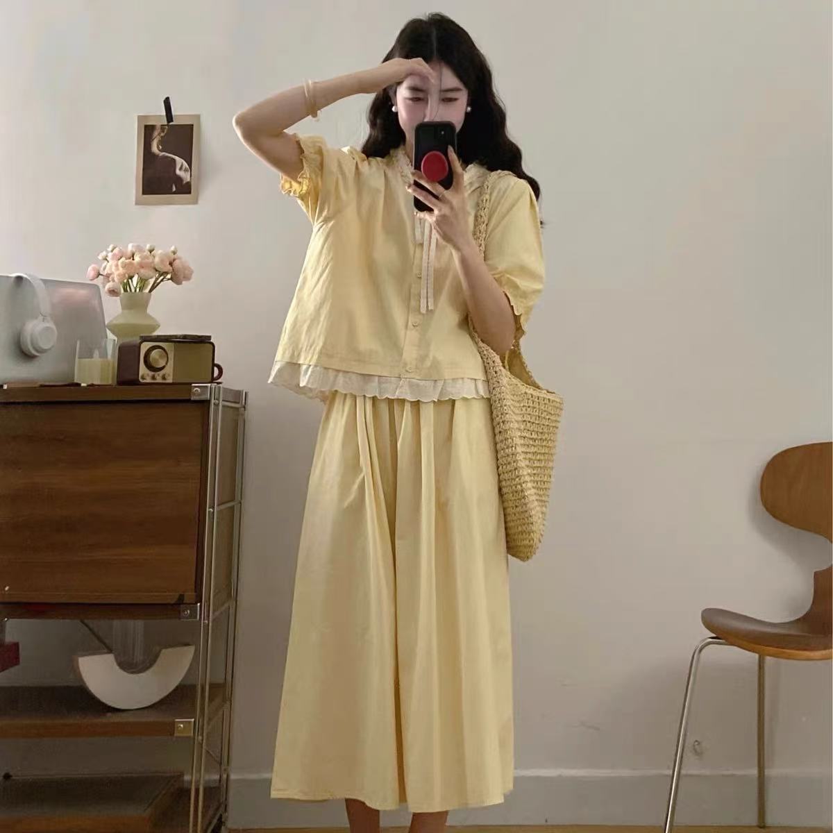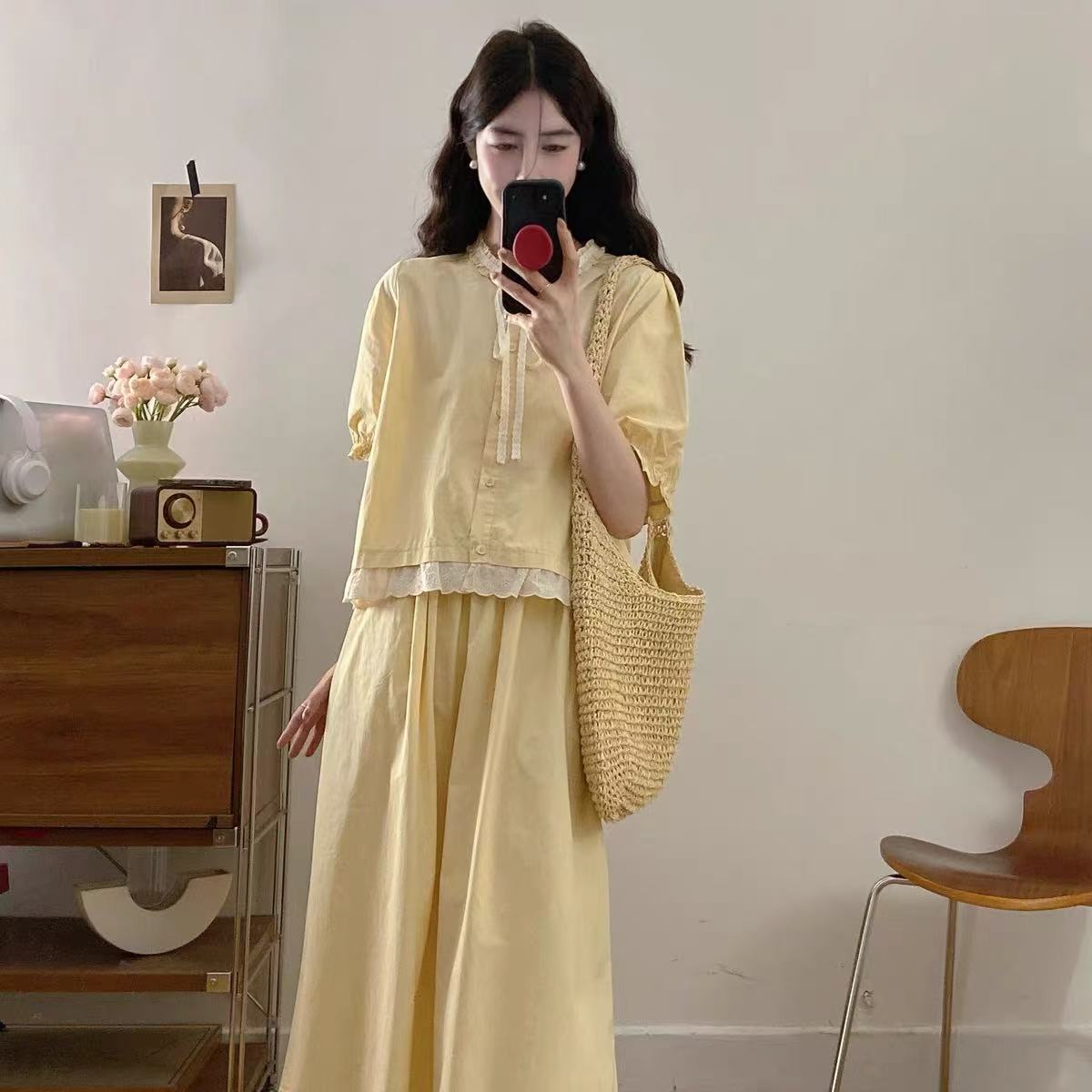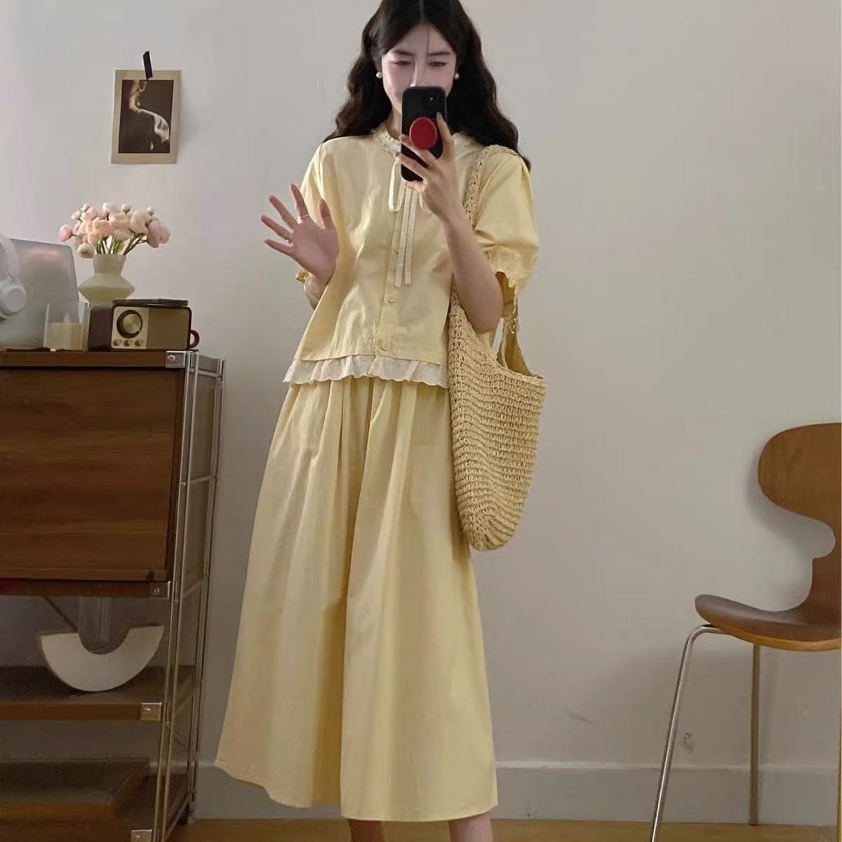 套装【韩系2025】黄色拼木耳边蕾丝上衣➕半身裙两件套-喜出