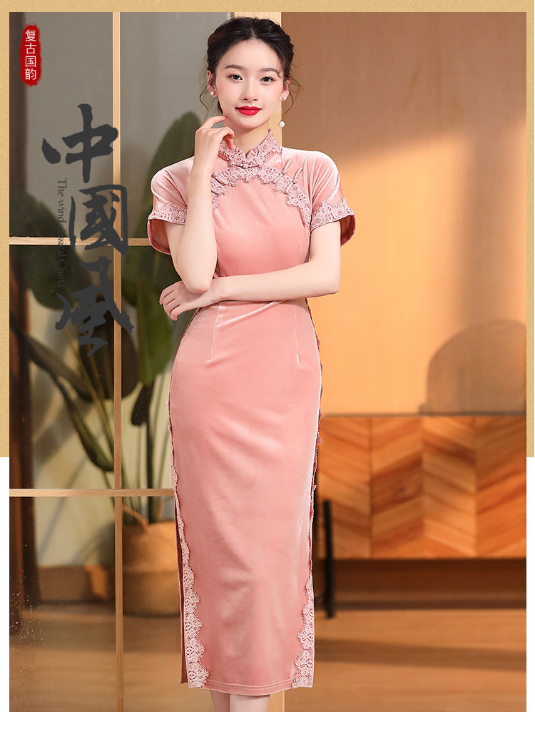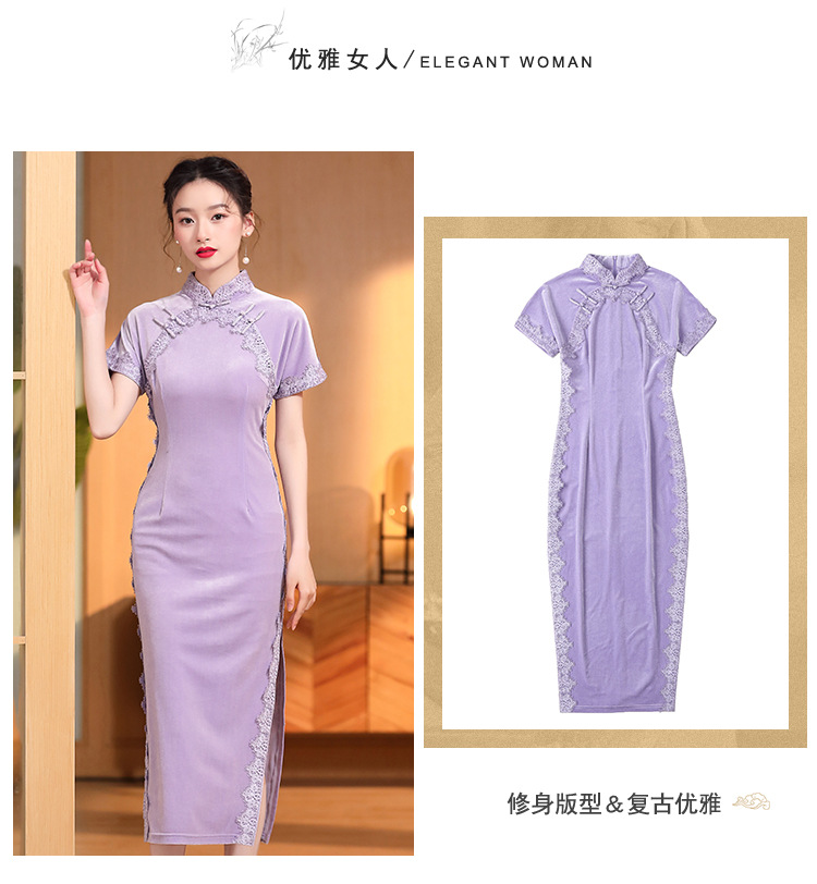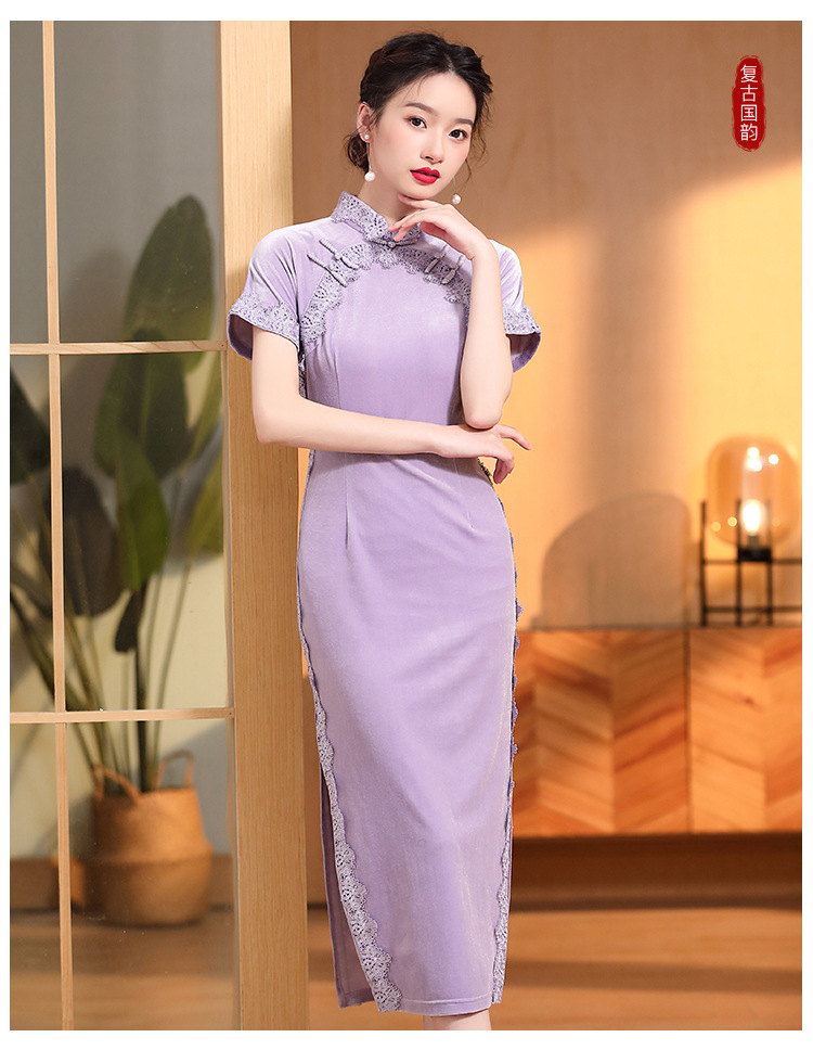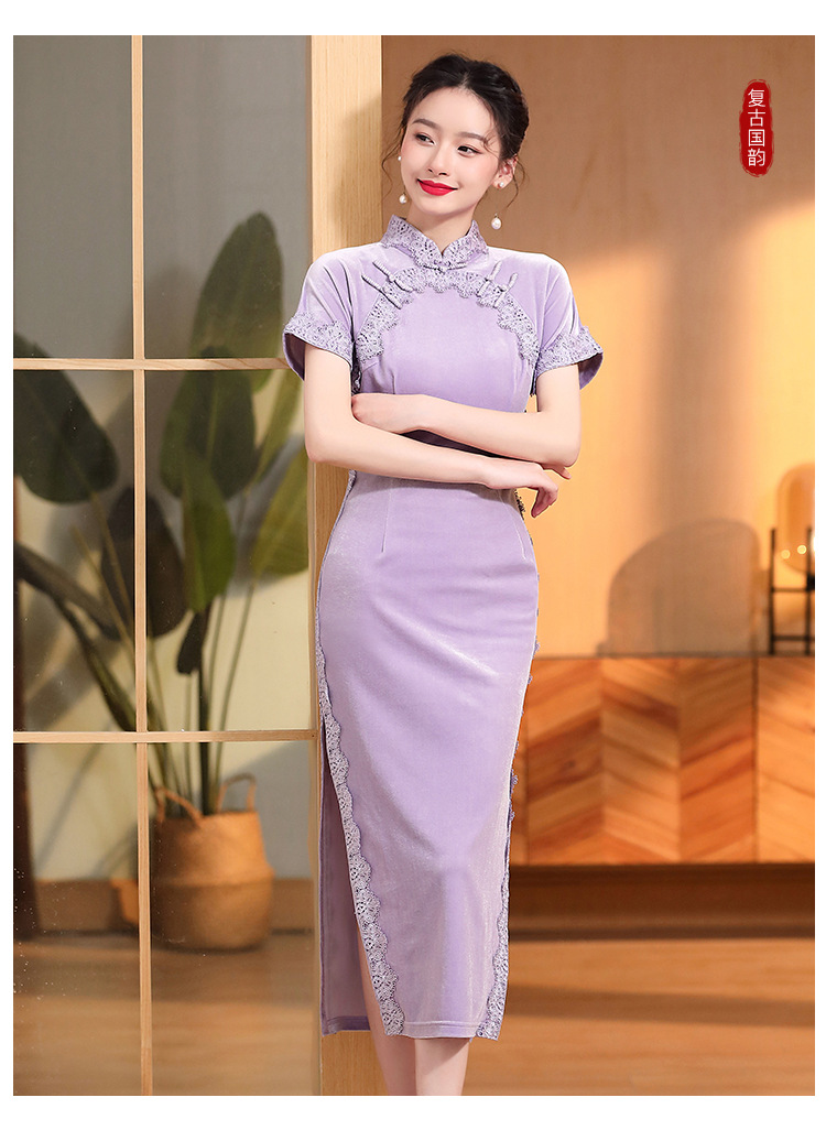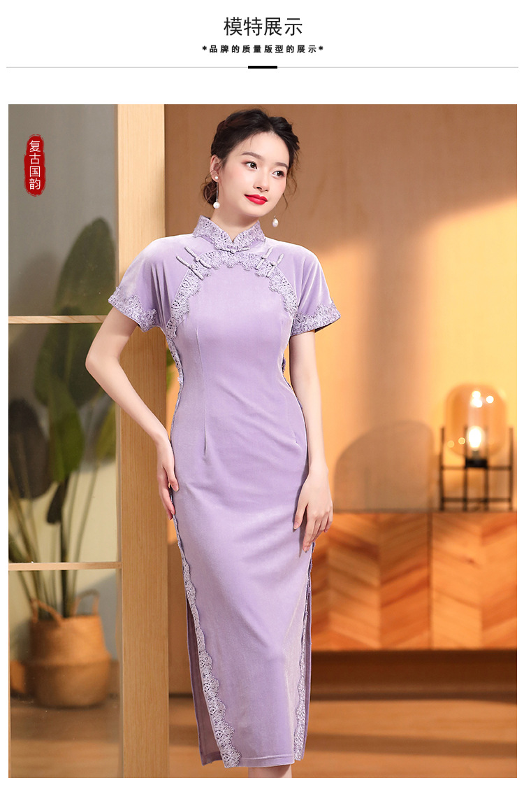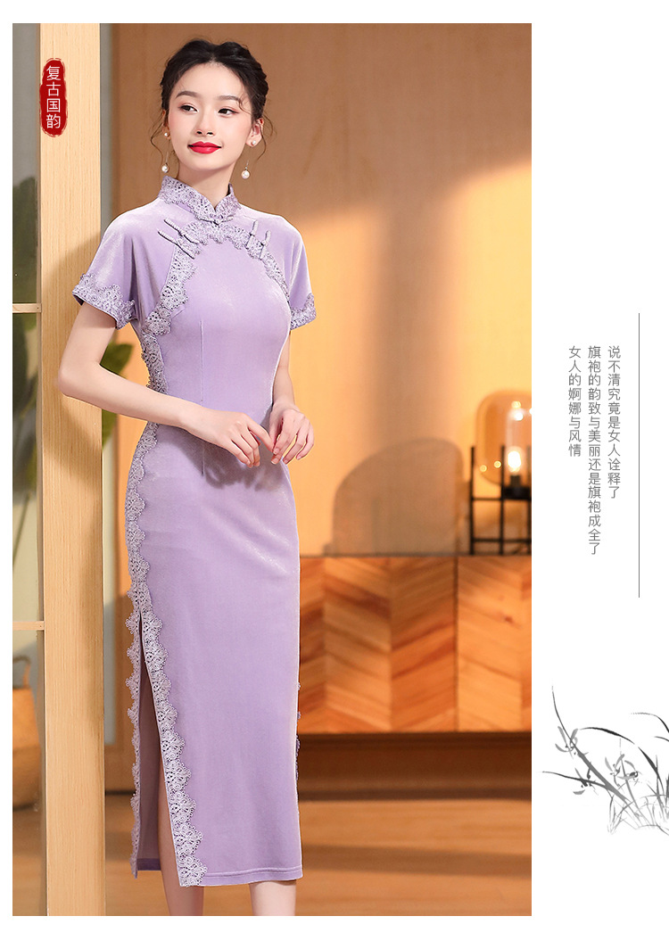 立领国风短袖旗袍裙,净色丝绒花边长款修身开衩旗袍AYK-QF-2210058