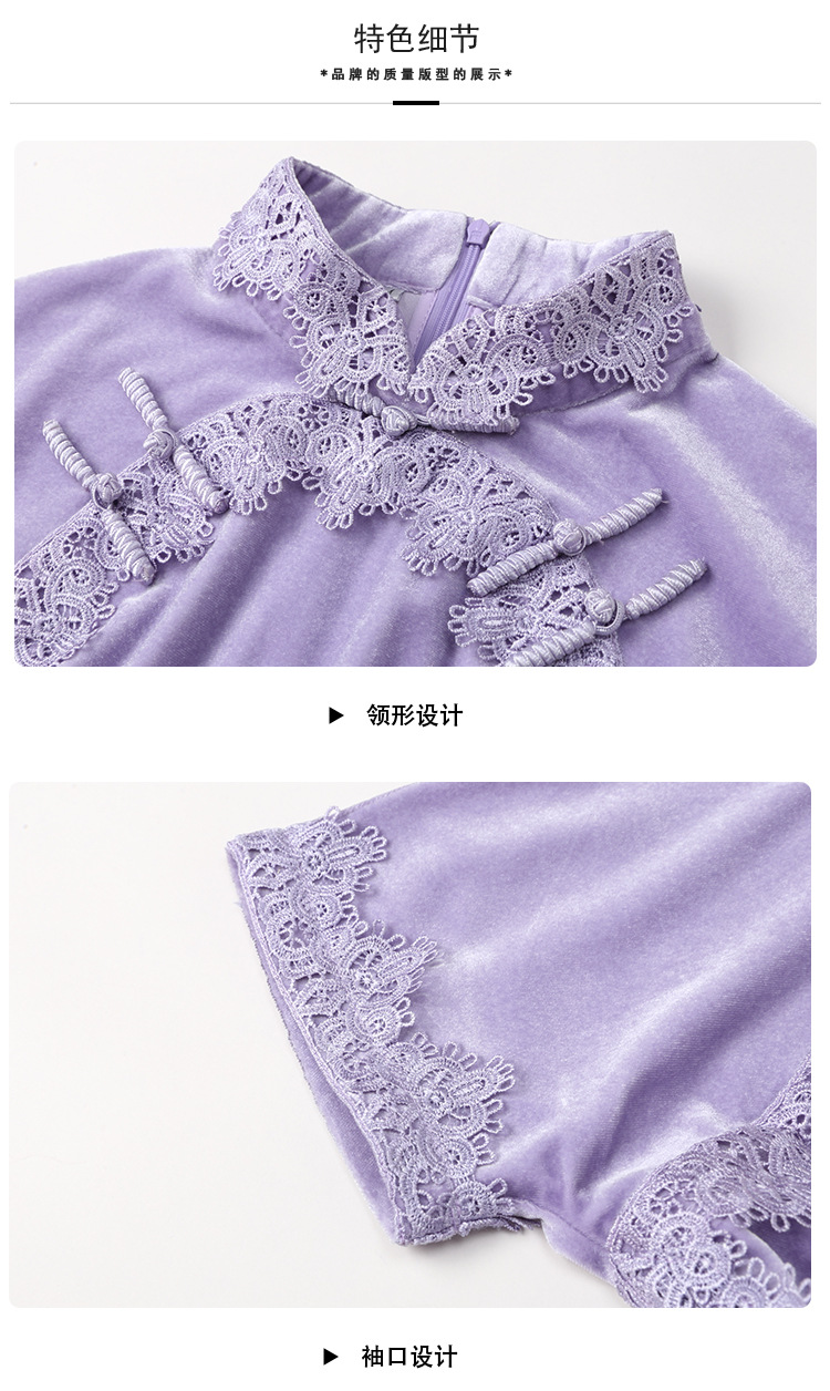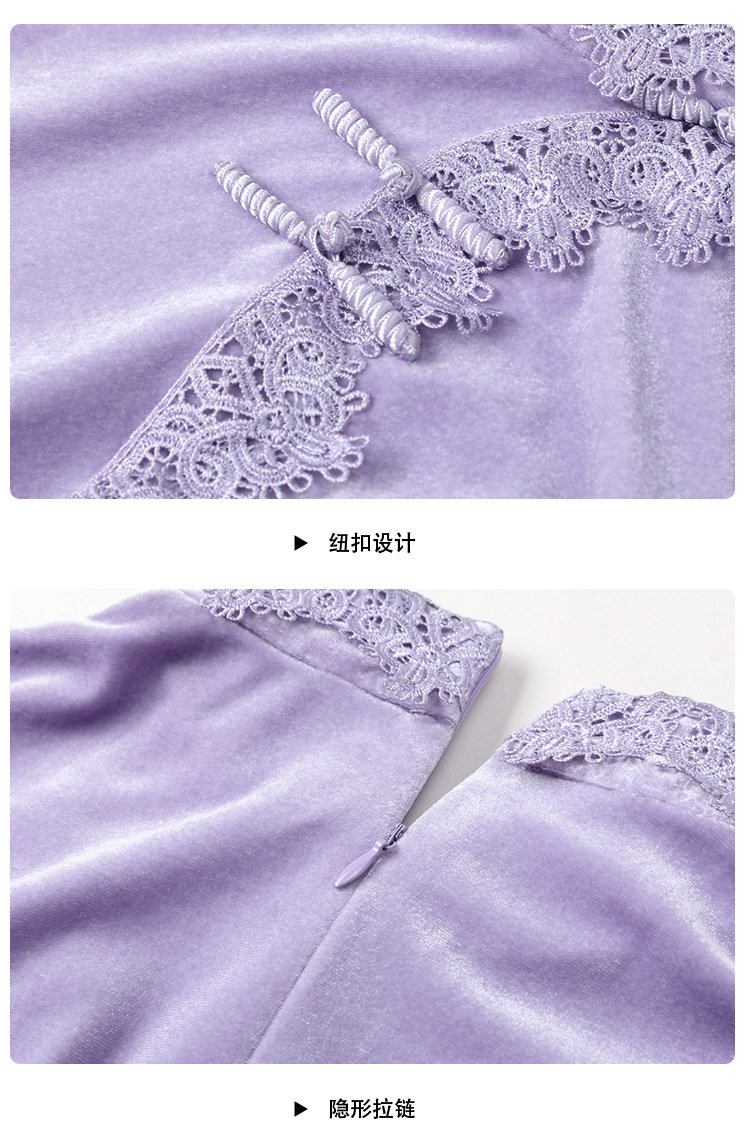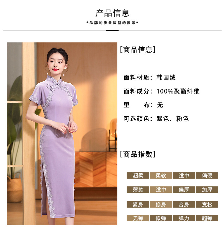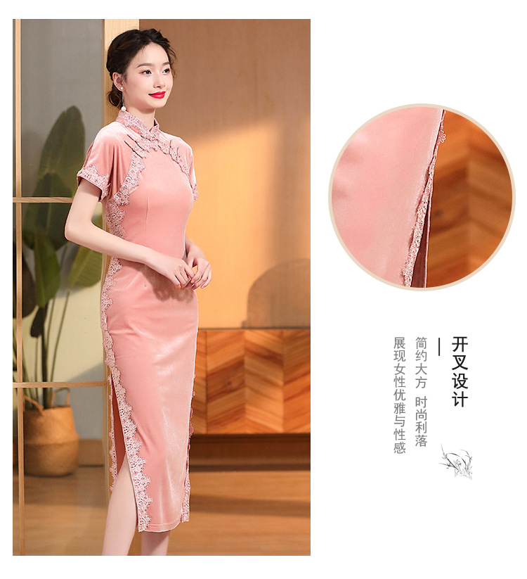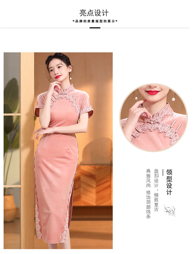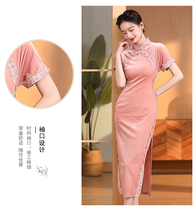 立领国风短袖旗袍裙,净色丝绒花边长款修身开衩旗袍AYK-QF-2210058