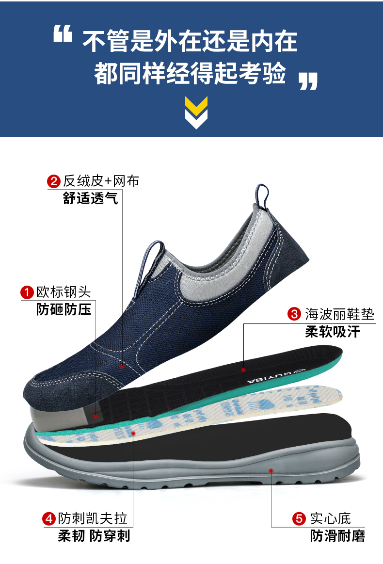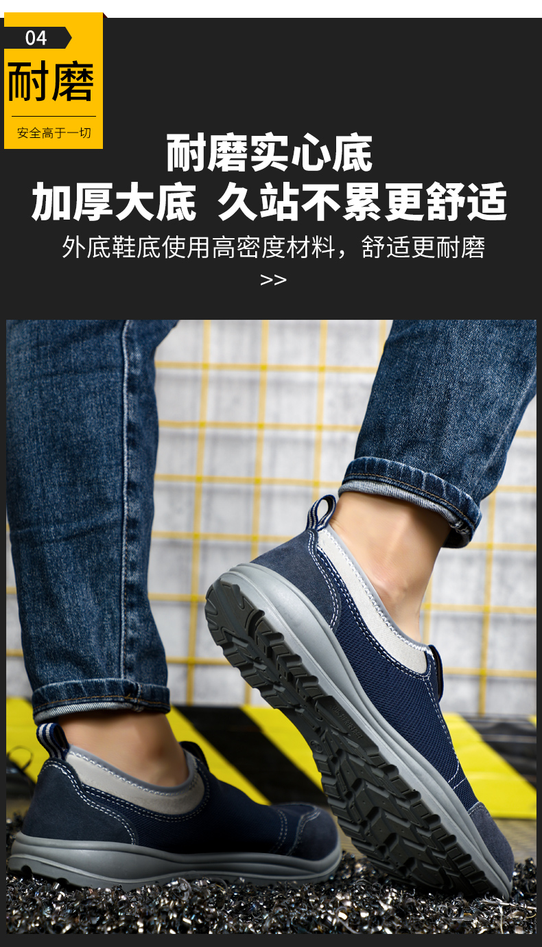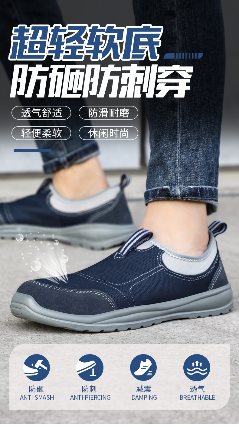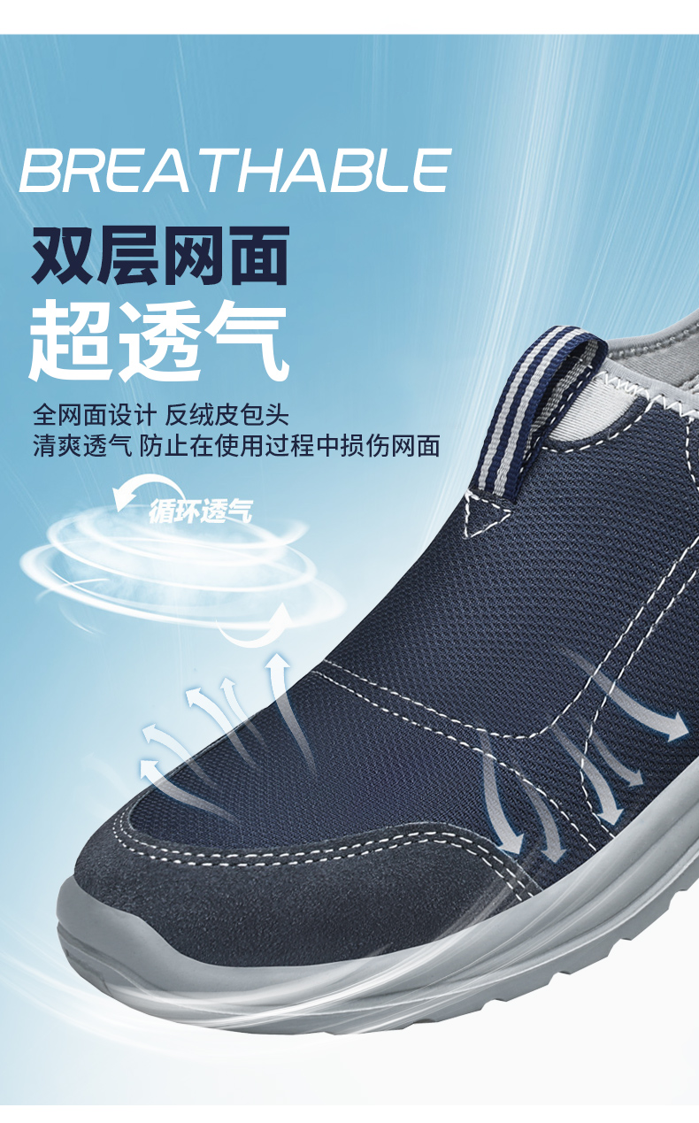 夏季四季款低帮蓝色透气劳保鞋耐磨实心底反绒皮网布拼接透气