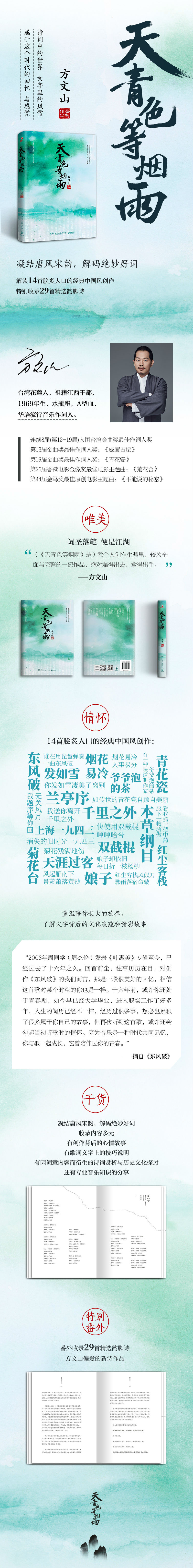 这本书名为《天青色等烟雨》,顾名思义,这是一本跟我的歌词作品有关的书籍。是的,此书所探讨之主题与内容,即源于歌词作品。这本书所表达的内容相当多元,有创作背后的心情故事,有歌词文字上的技巧说明,更有些是因词意内容而衍生的诗词赏析与历史文化之探讨。当然还有专业音乐知识的分享,全都截录于《方文山的音乐诗词课》,以及番外篇所收录的素颜韵脚诗,是我自己相当偏爱的新诗作品。也因此本书内容相当多元,可谓之不掺水分的干货。这本书可谓我个人创作生涯里,较为全面与完整的一部作品,绝对端得出去,拿得出手。