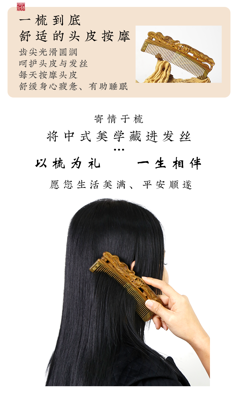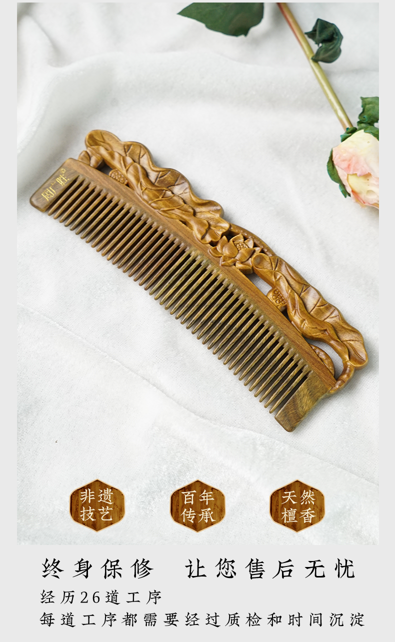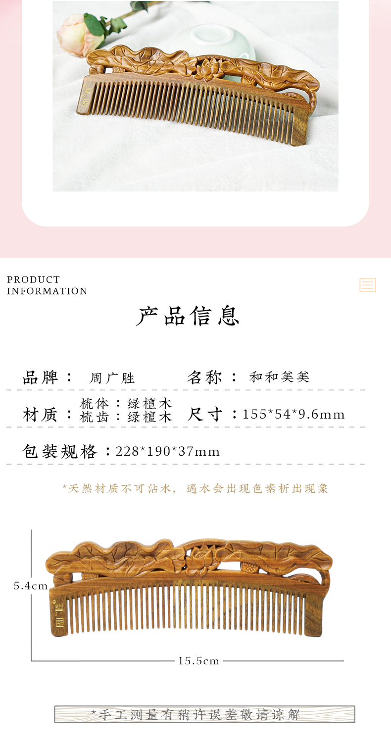 周广胜正品榫卯拼接和和美美天然绿檀护发梳女士便携长发直发顺发