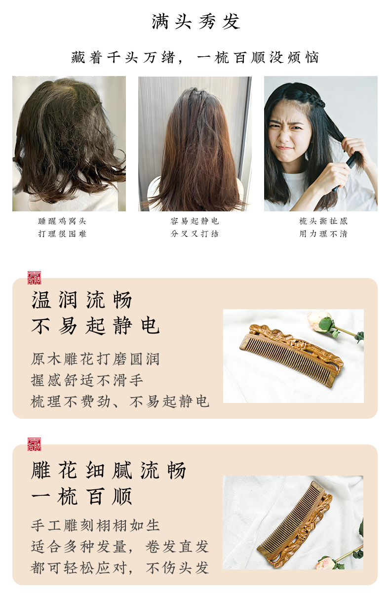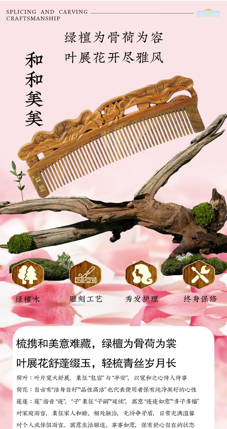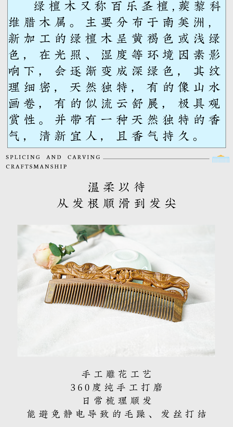 周广胜正品榫卯拼接和和美美天然绿檀护发梳女士便携长发直发顺发