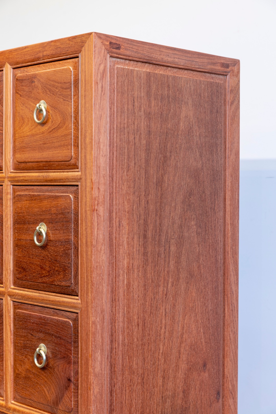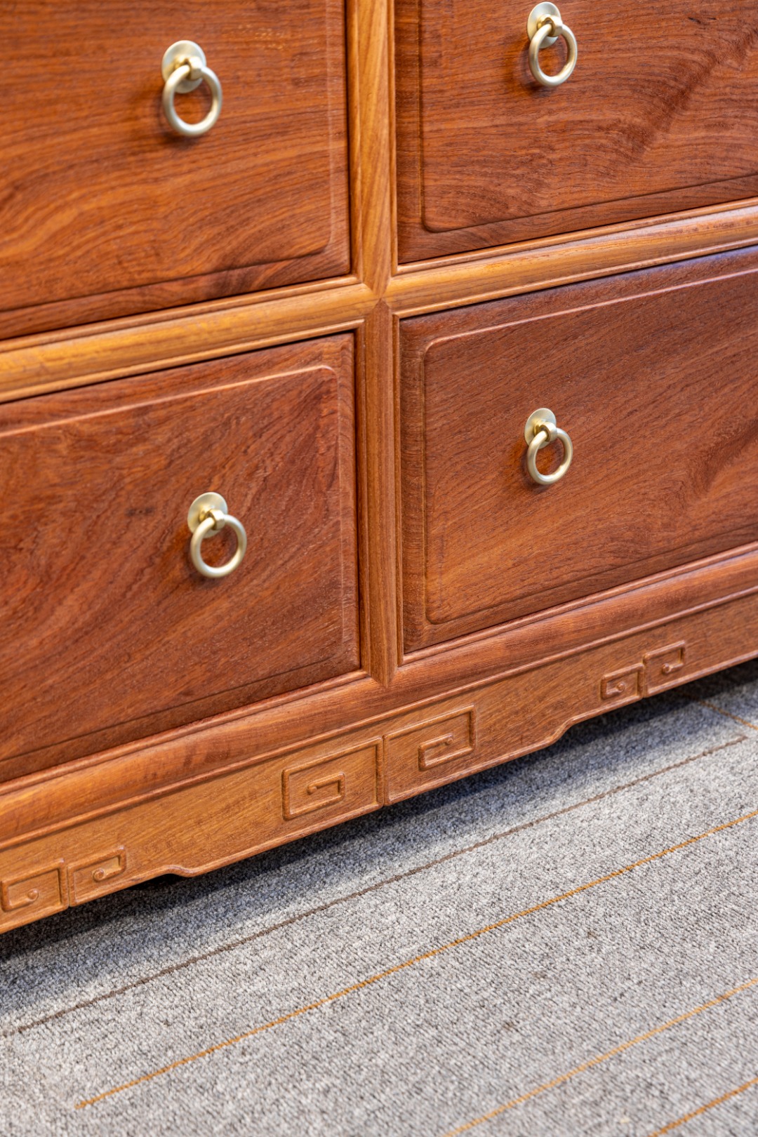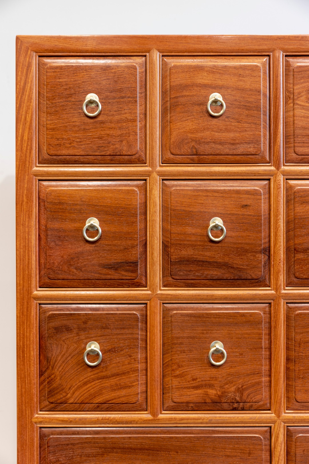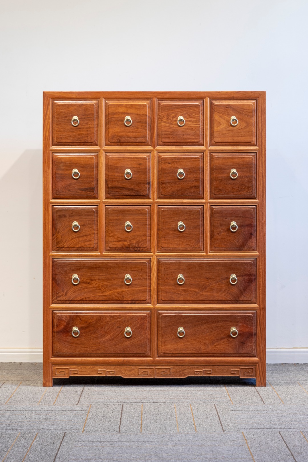 此柜全器独板取料,正面满列抽屉:上部三层,十二具小抽屉,分格收纳,归置有序;下部两层,每层两具抽屉,整齐划一。此柜高度适中,器型周正规整,采用全榫卯结构,整器共十六具抽屉,布满抽屉空间,储物空间大,实用性强。抽屉脸纹路清晰,圆形拉环。柜顶、柜侧均独板制,底部腿足间三面设有牙条,浮雕回形纹。此柜充分利用每个空间,考虑当代生活实用性,存取物方便。