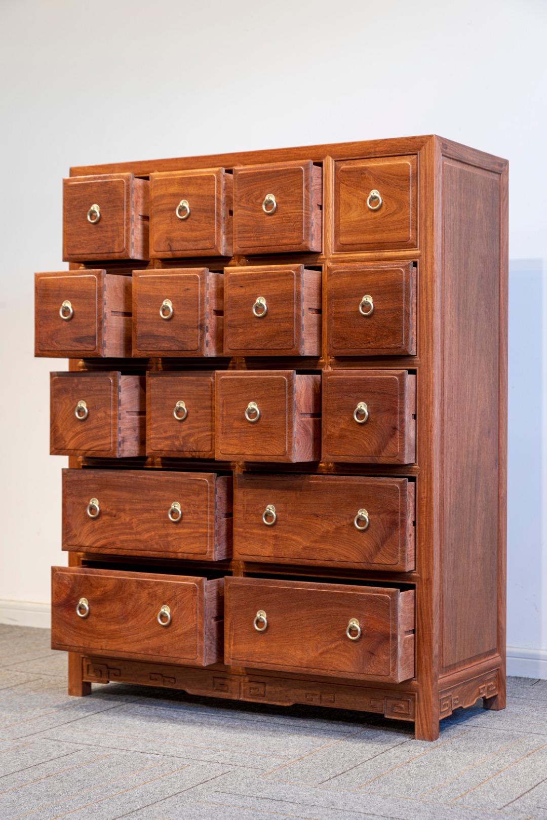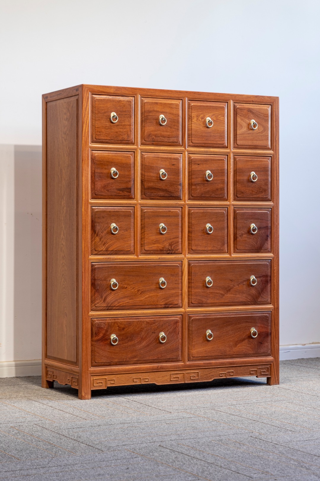 此柜可作药柜、收纳柜使用,除放置药品外,也可存放文玩,信札等,是用途灵活的家具,是家居实用器物。日常用的小物件找起来总让人头疼不已,收纳柜可对家里的小物件进行分类摆放,达到很好的收纳效果,是居家收纳的好帮手。