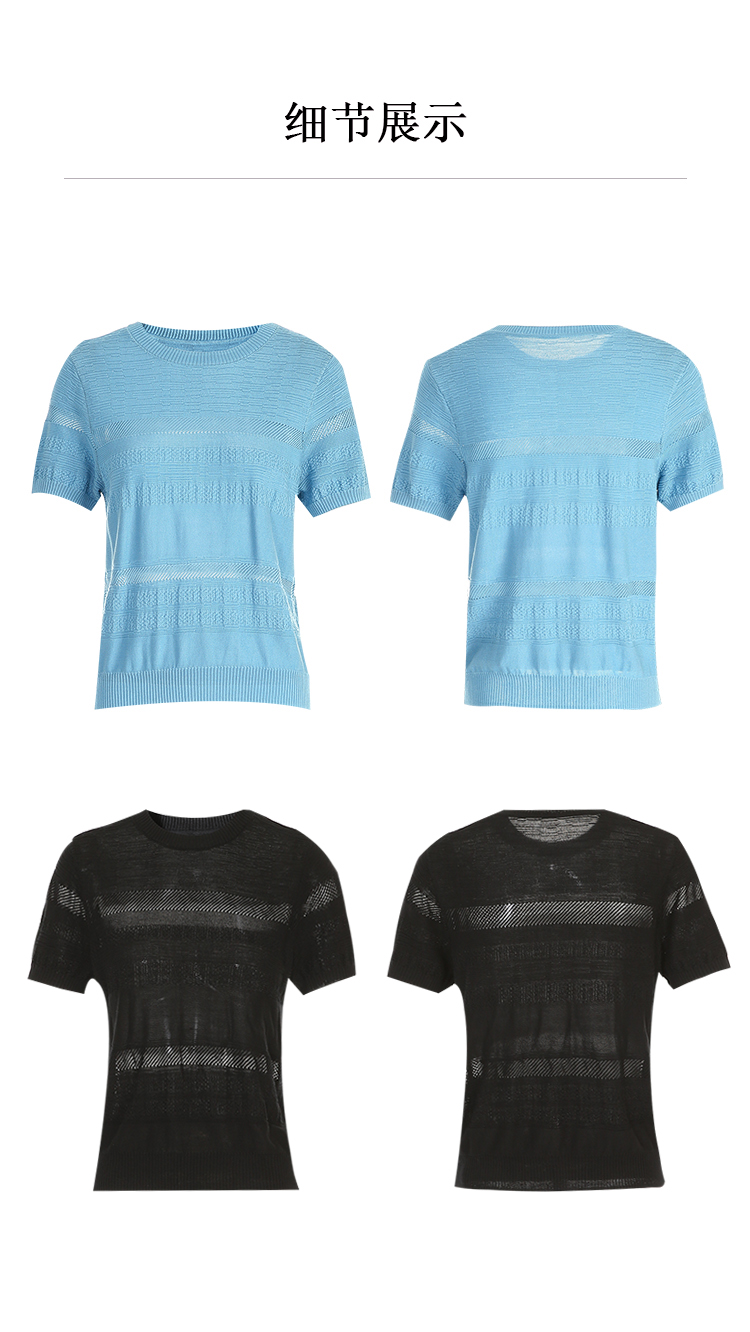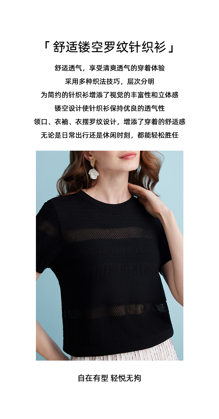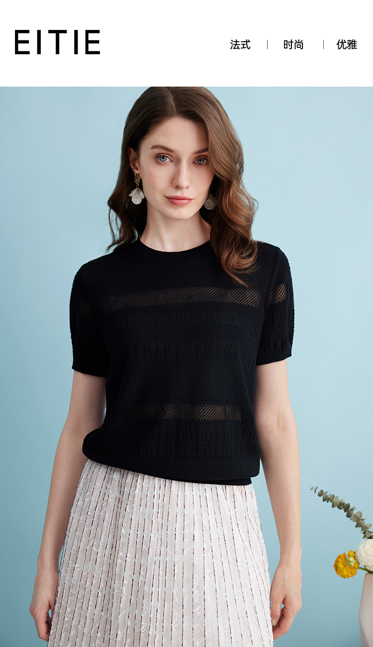 EITIE爱特爱夏季新款舒适弹力修身短袖薄款镂空针织衫上衣B2401320