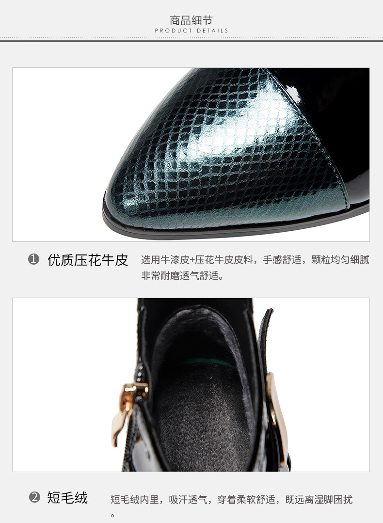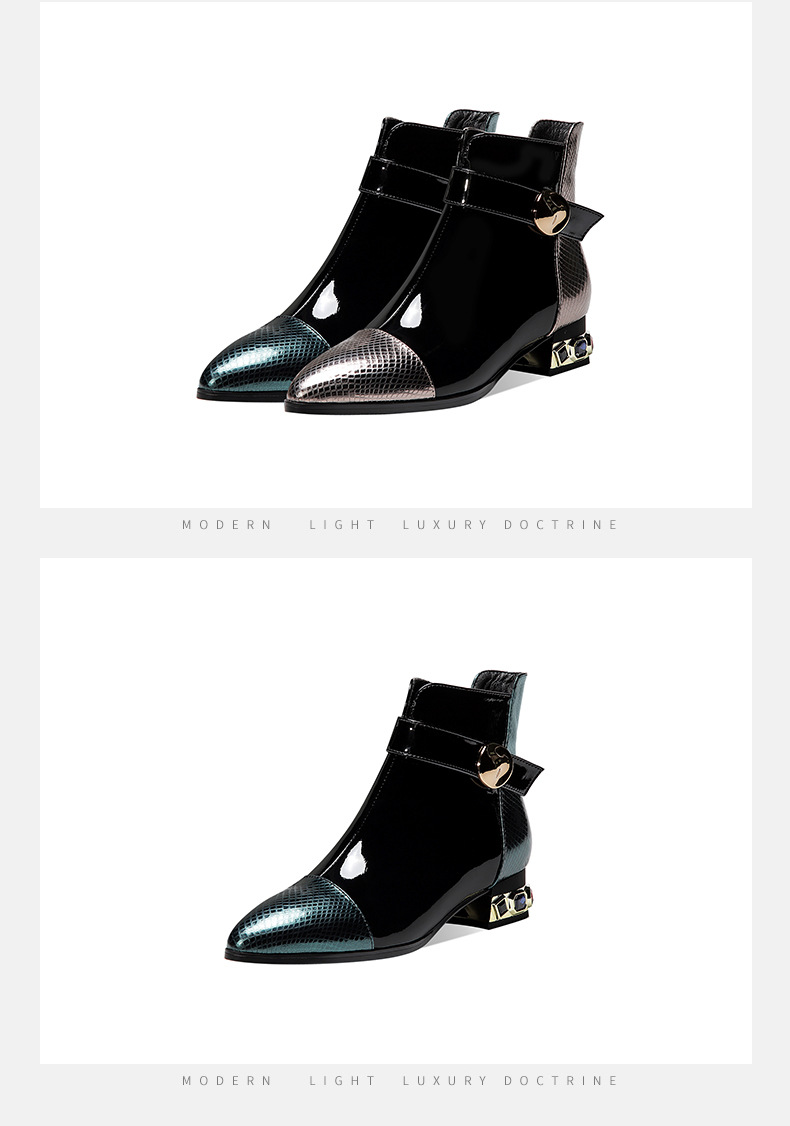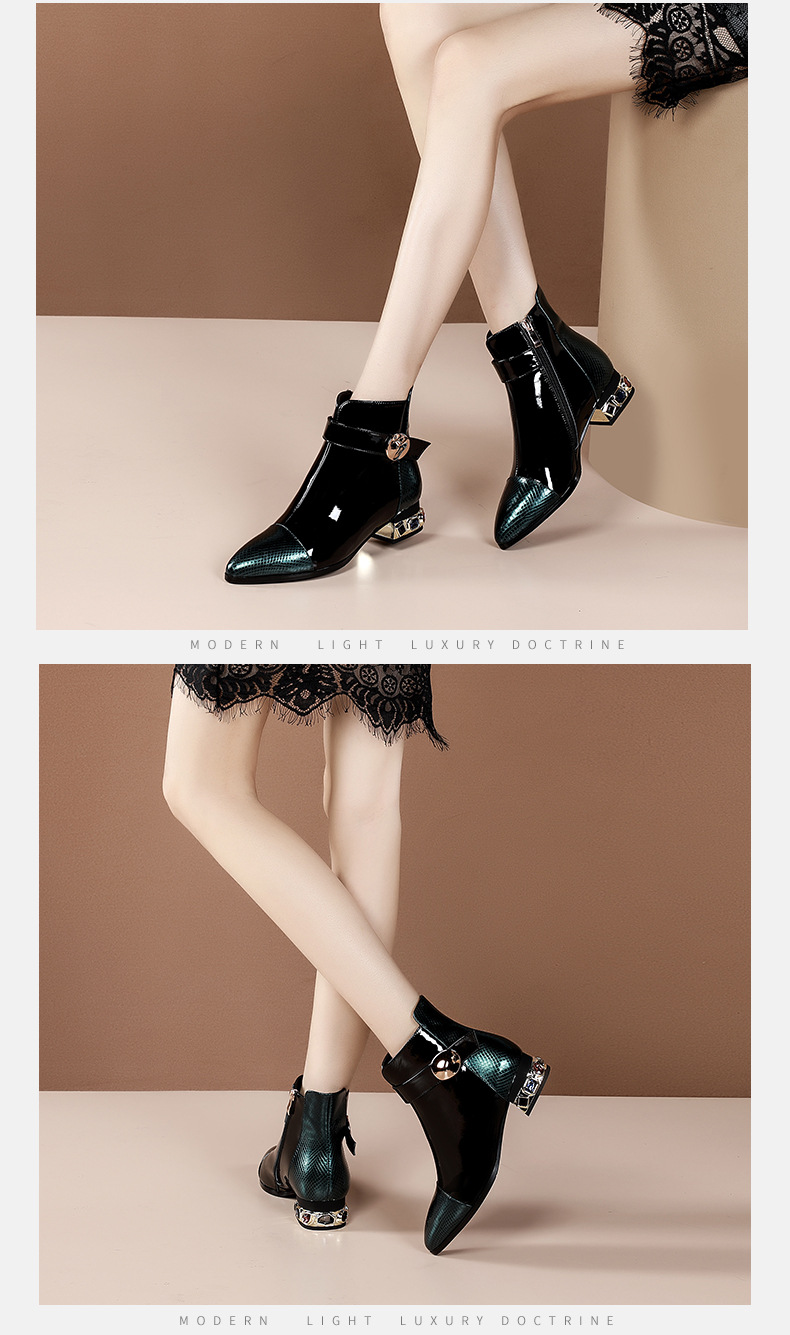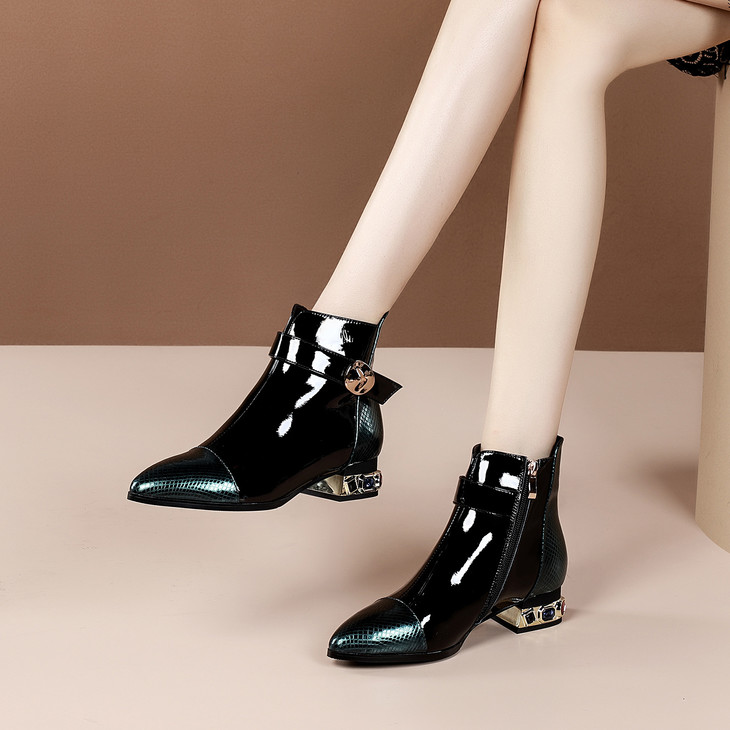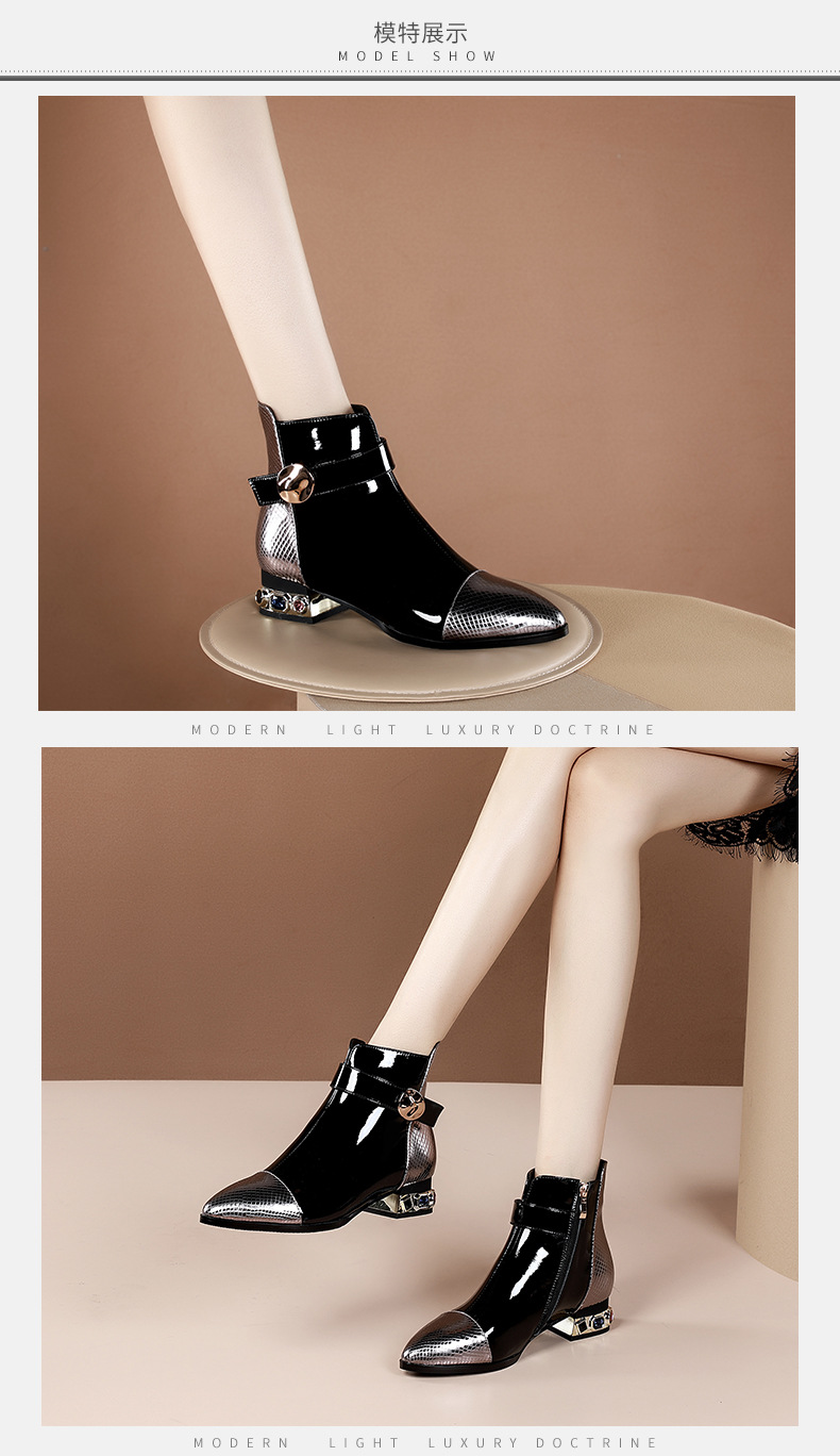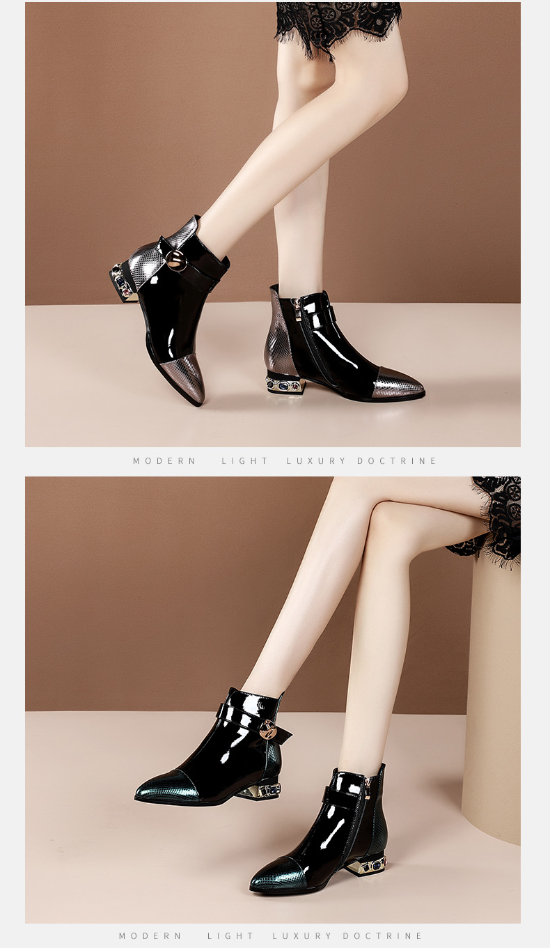 OLD-9597新款时尚气质百搭英伦风漆皮尖头低跟粗跟短靴