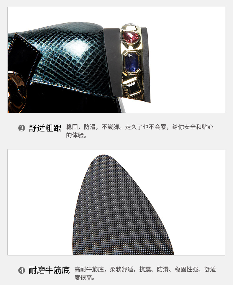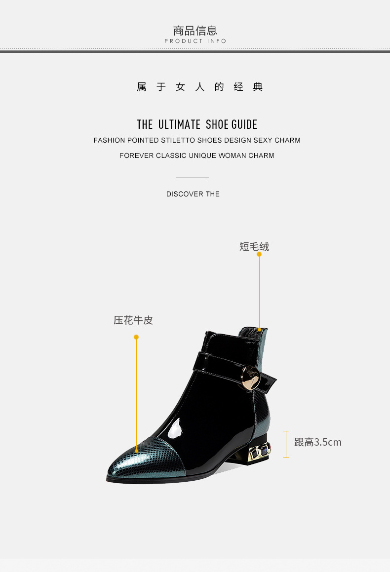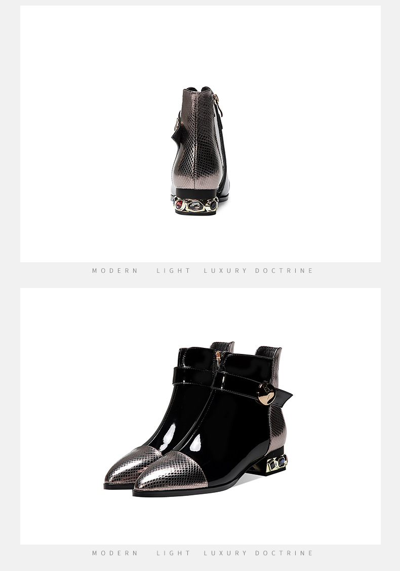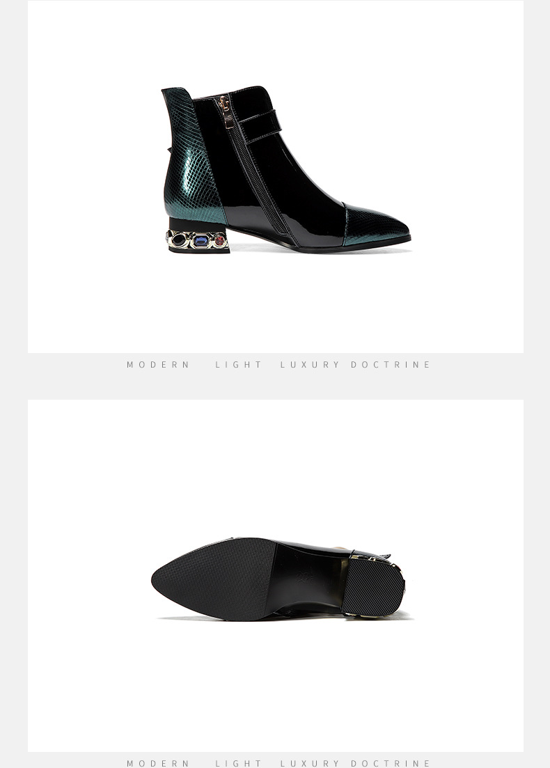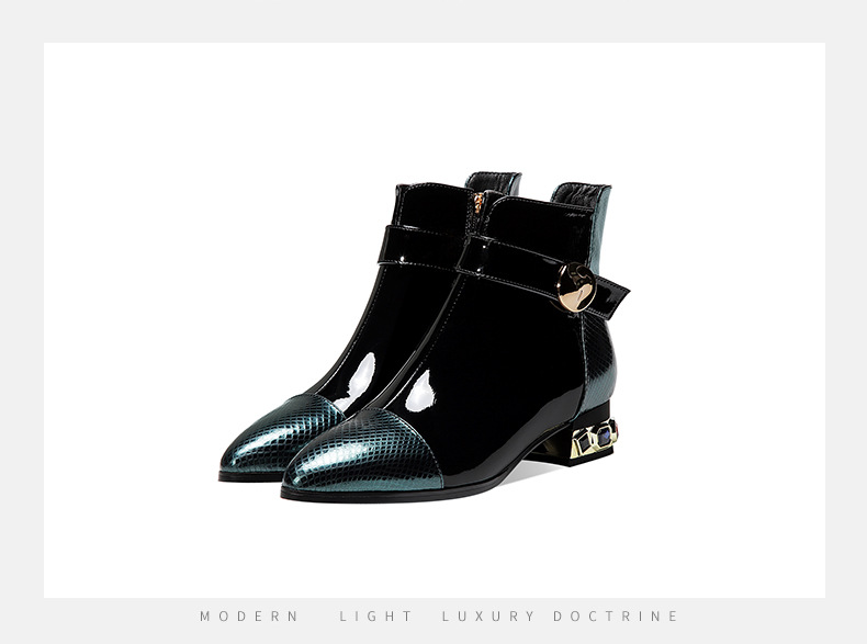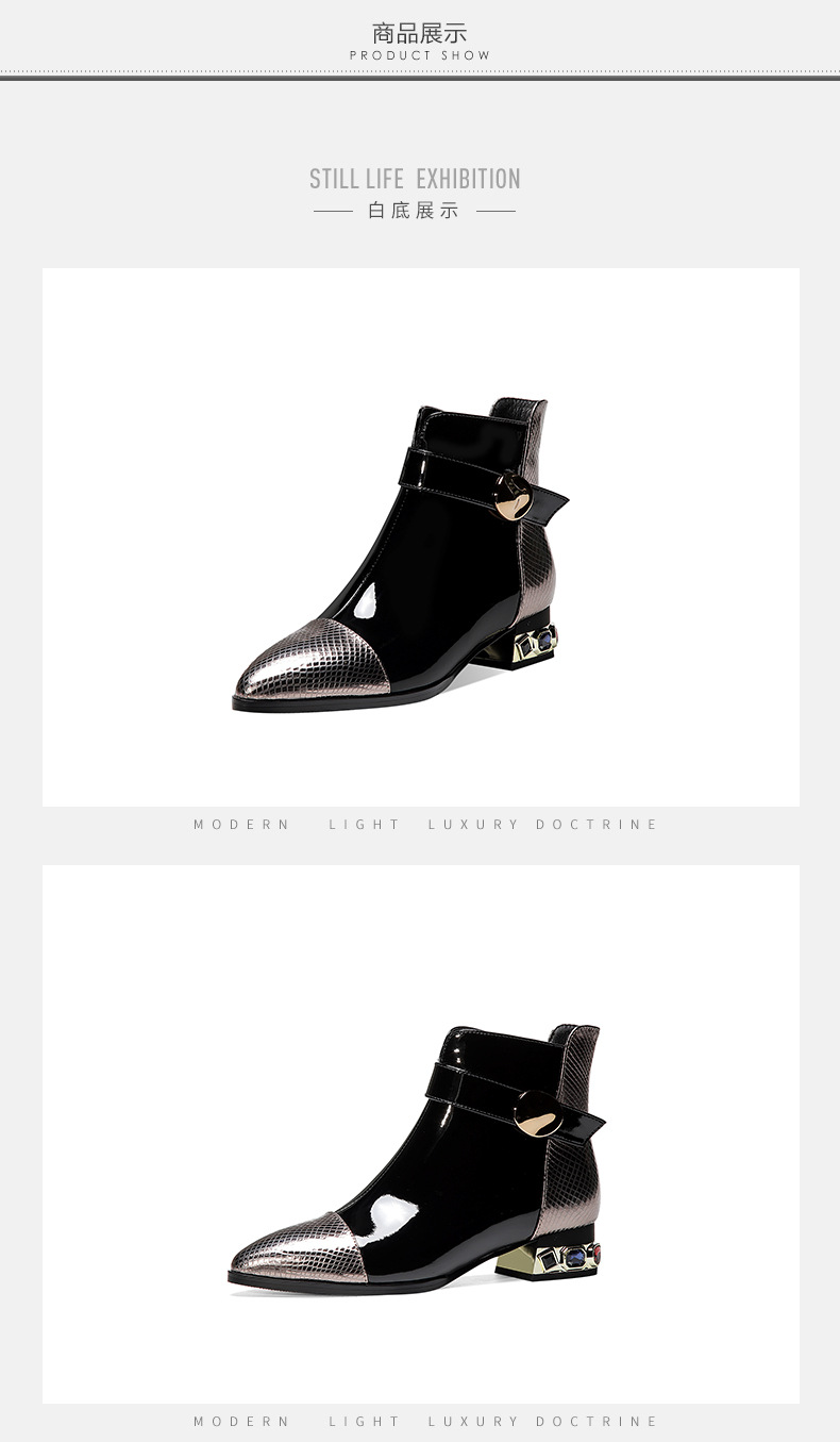 OLD-9597新款时尚气质百搭英伦风漆皮尖头低跟粗跟短靴