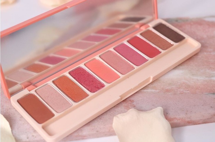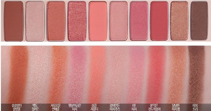Etude house爱丽小屋 蜜桃盘 十色眼影盘 ,★先来说下配色★ 💋盘的配色整体颜色比西抽盘的饱和度要低一些,❤️没有特別深的颜色很适合新手手残党画 ,里面有三个哑光色🔥五个珠光色2个亮片色 ,🌿其中有兩人魚姬色,颜色的显色度也适中不容易下手过重 ,🦋粉质和以往的差不多,不是很飞粉 ,很适合画少女系的妝容,⭐️谁画谁減龄真人也自带滤镜效果超显白哈! 画完就是一个元气少女!