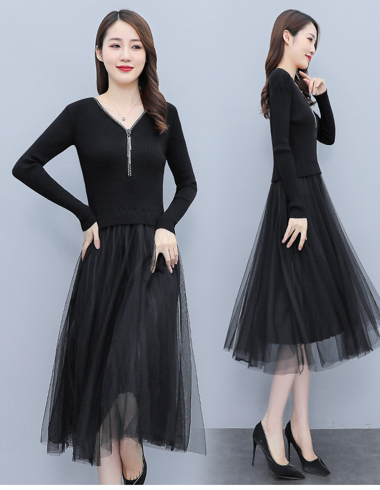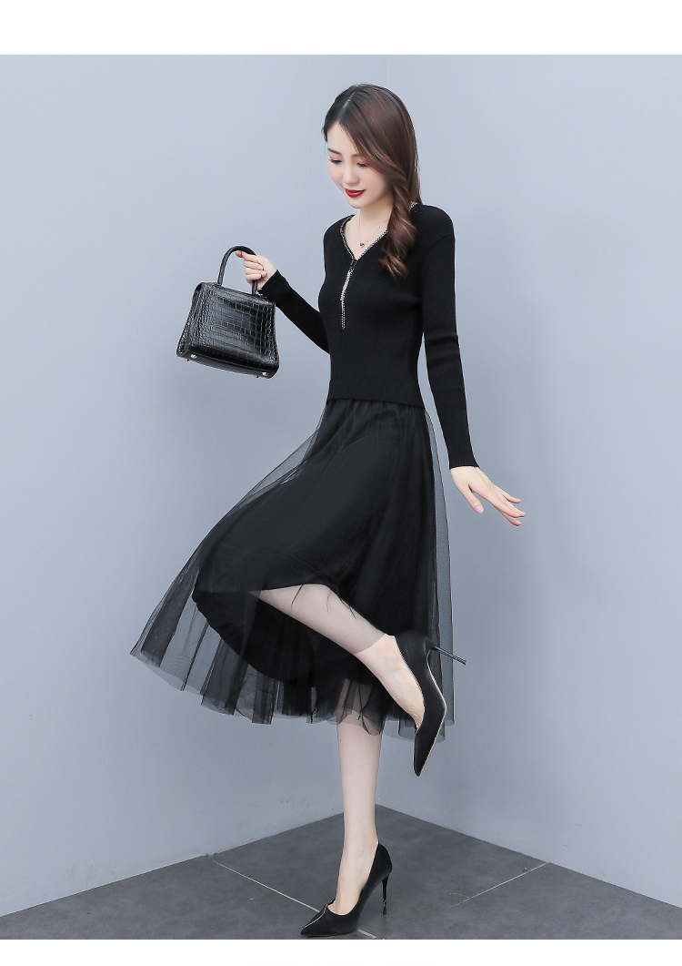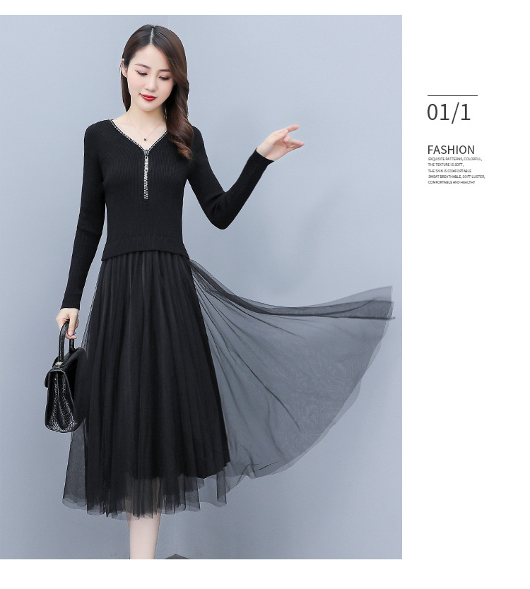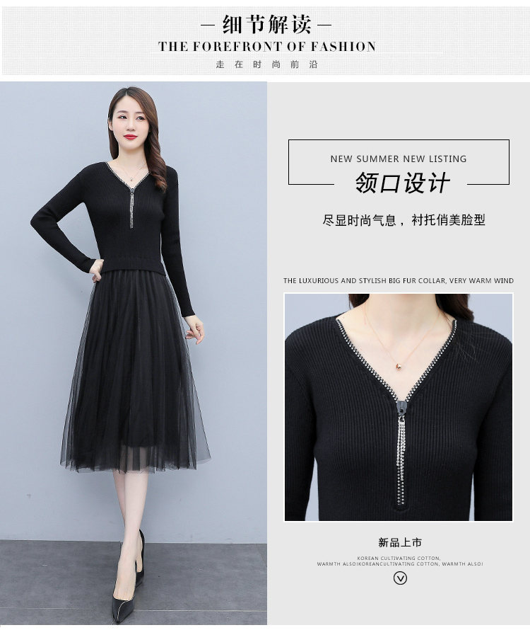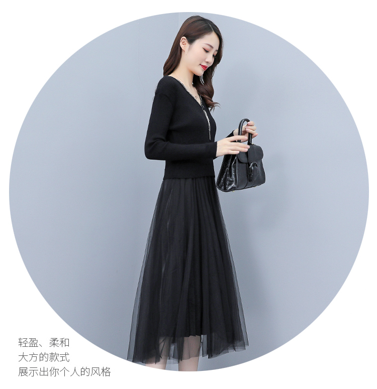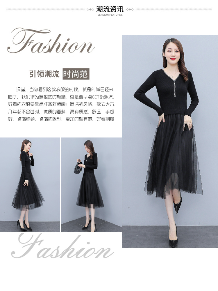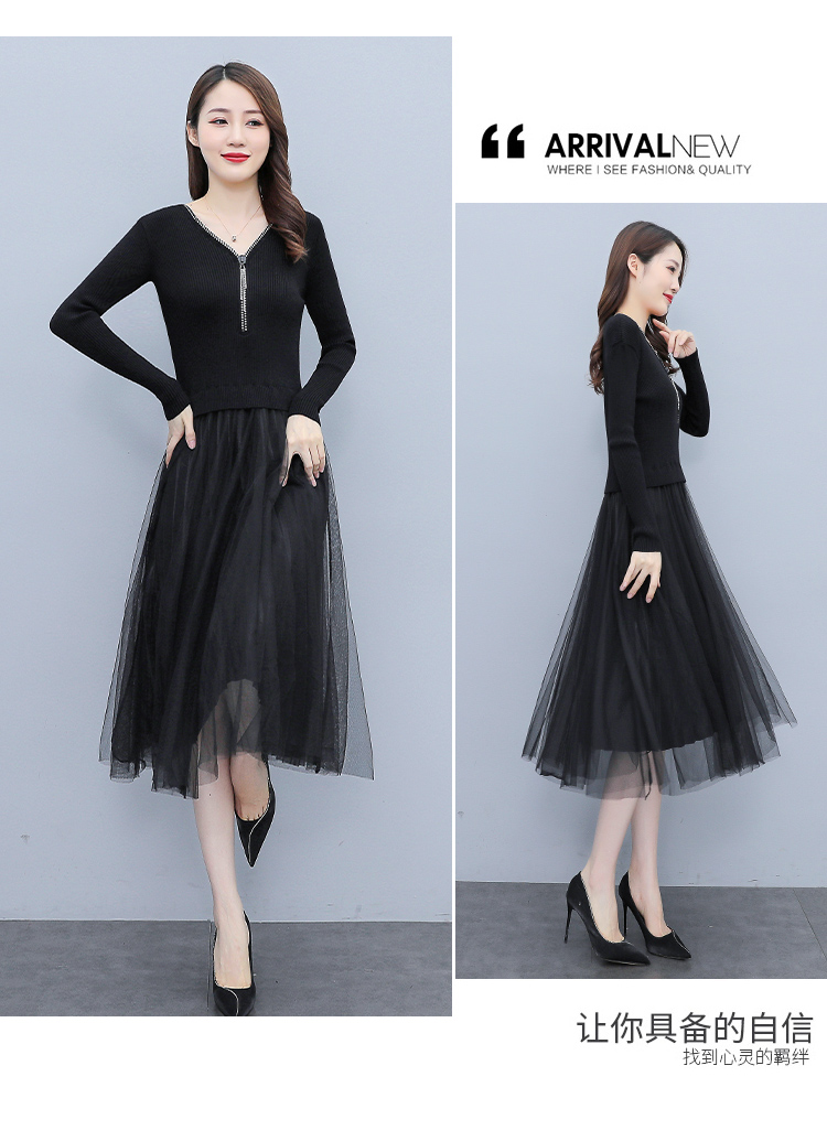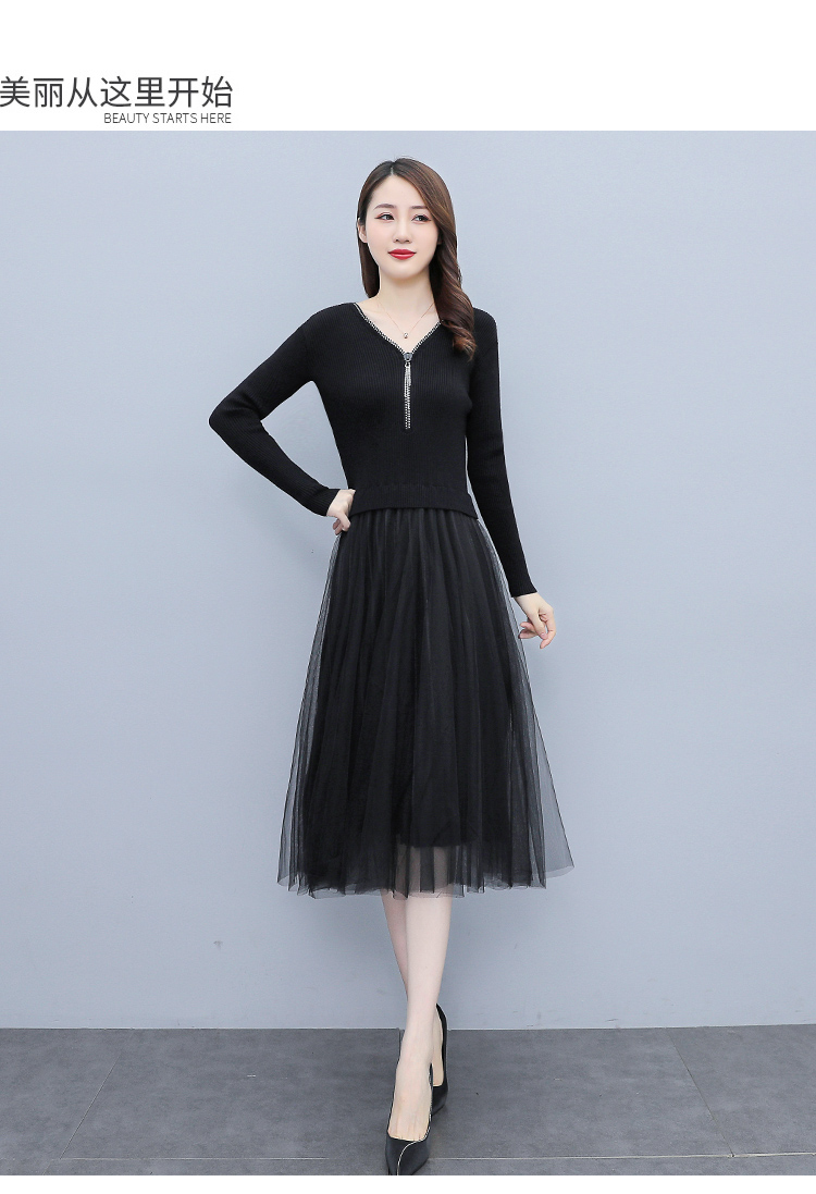 XS-93378 连衣裙女2023春季新款女装韩版收腰弹性大码针织V领网纱连衣裙女