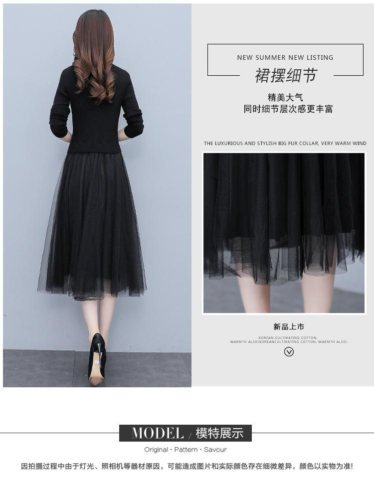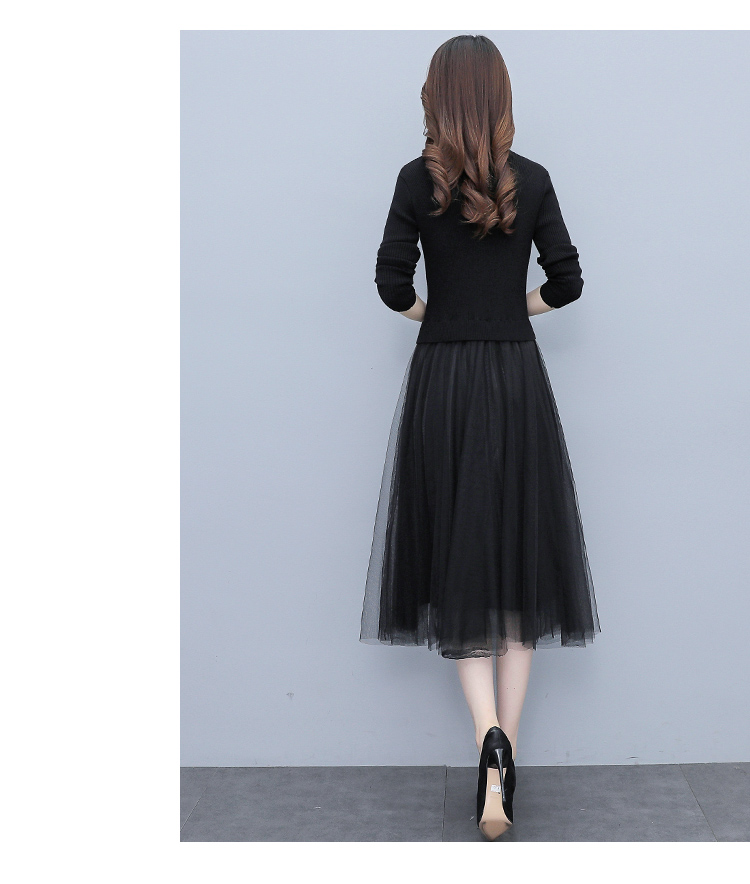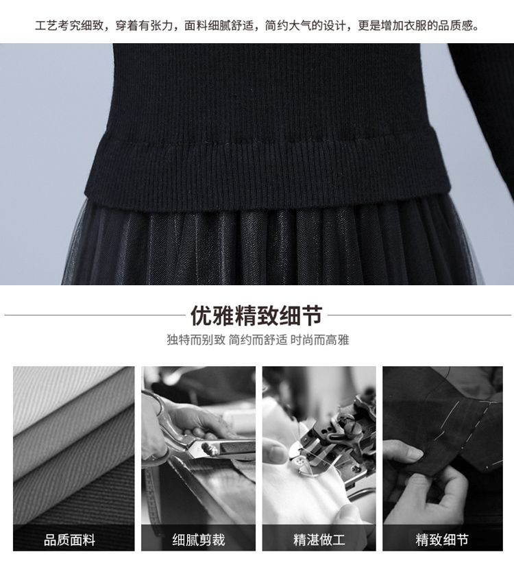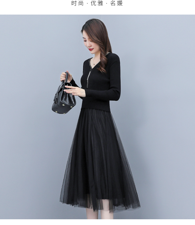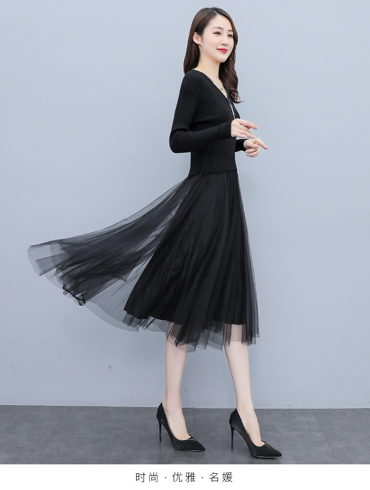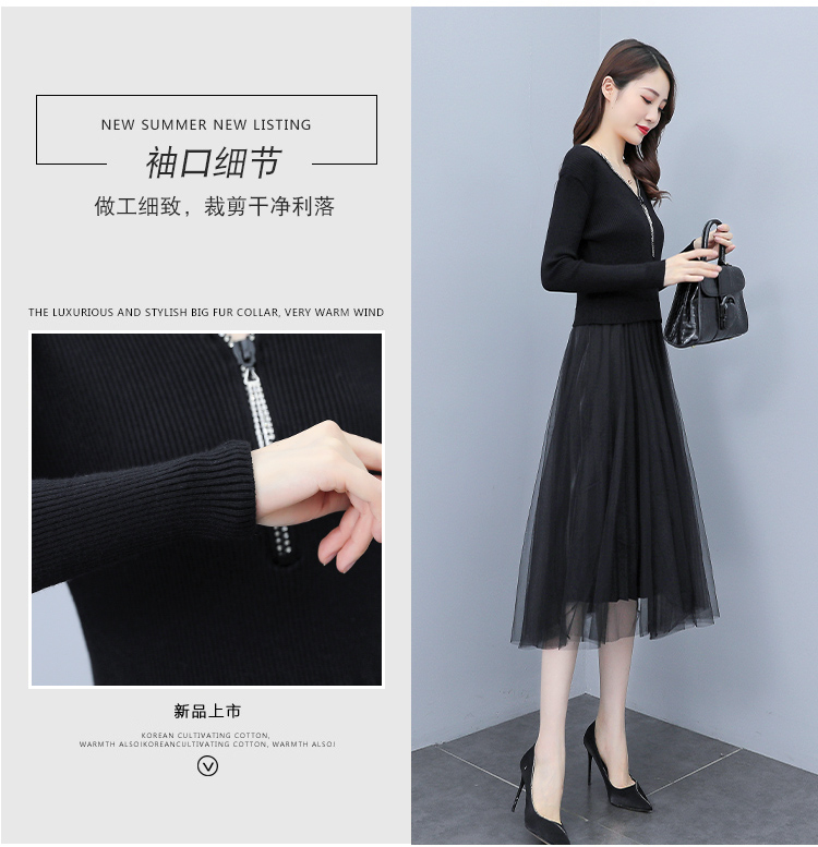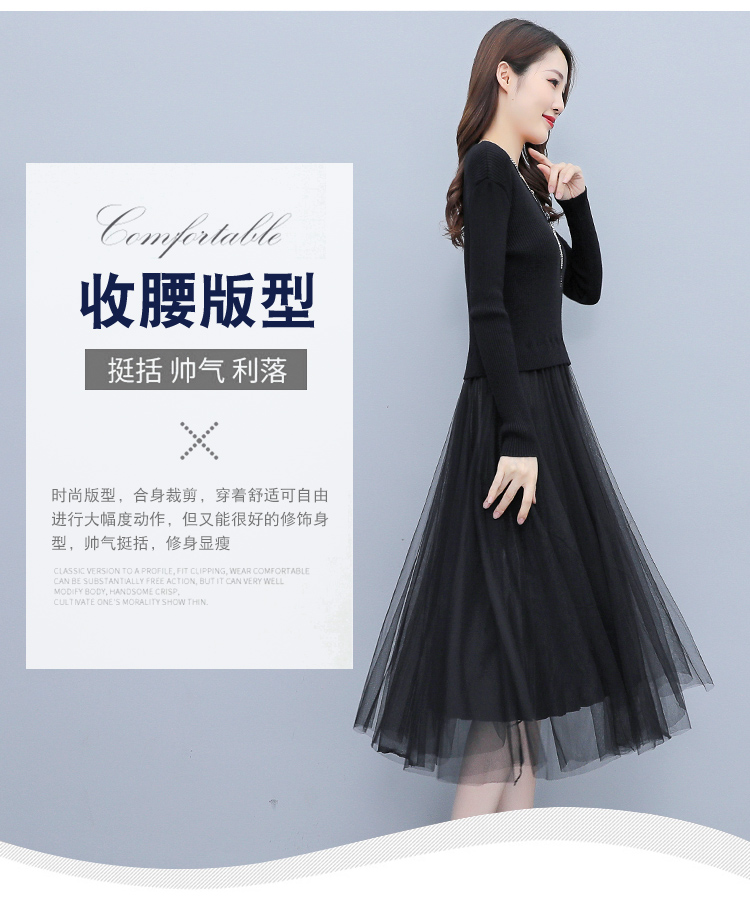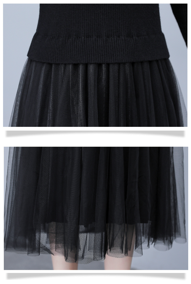XS-93378 连衣裙女2023春季新款女装韩版收腰弹性大码针织V领网纱连衣裙女