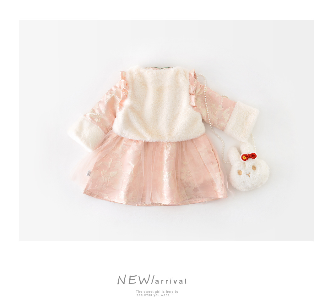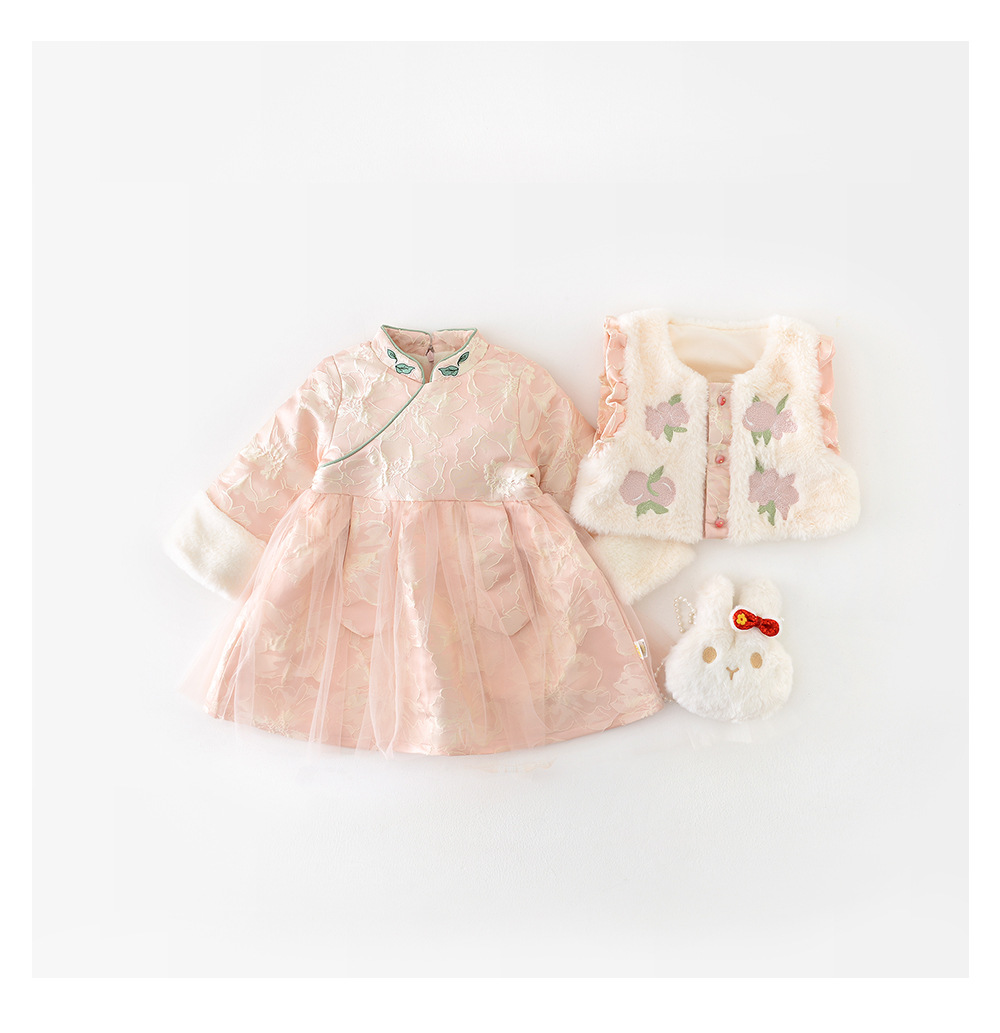 【中国风洋气套装,精致而美观】女宝宝秋冬装连衣裙 新生儿毛毛刺绣马甲两件套,柔软舒适的面料 穿脱便利