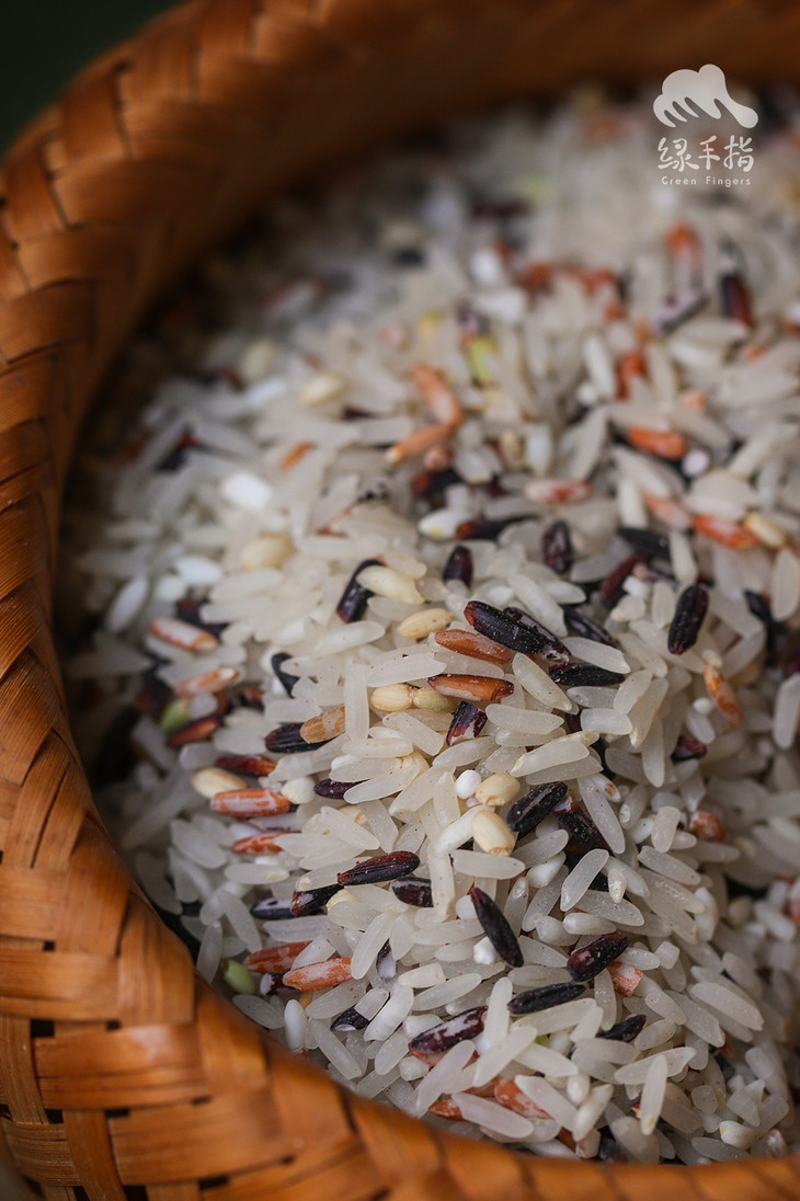 五彩宴米由5种老品种牛耕米组成,分别是胭脂紫米、小麻红米、绿香珠米、香禾糯米、净水香米(白米)按固定比例搭配,色香味俱全。这里面紫米和绿米是糙米,其他三种是胚芽米。按这个特定比例煮出来的米色、香、味俱佳。
