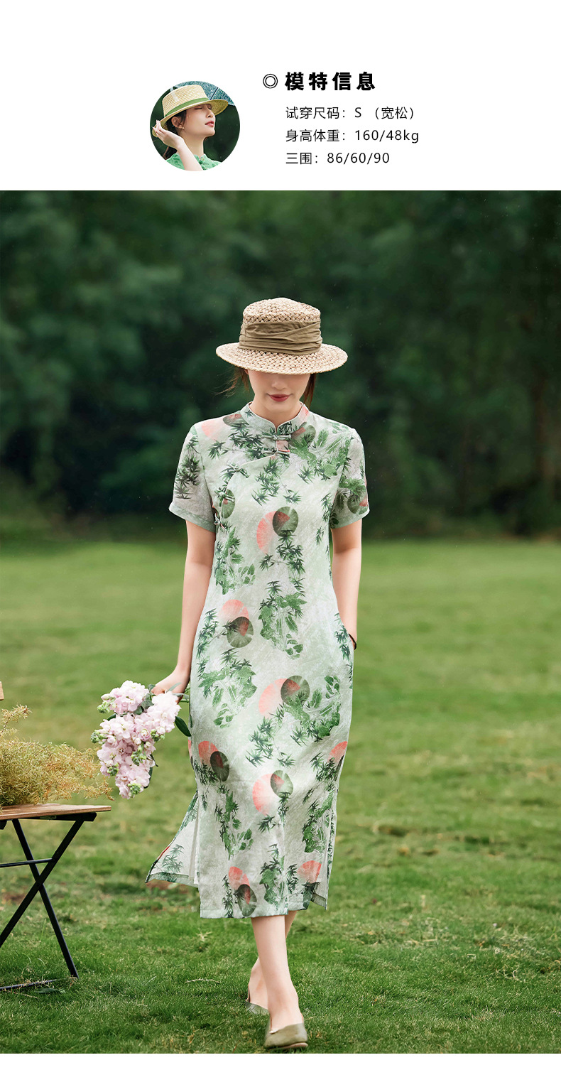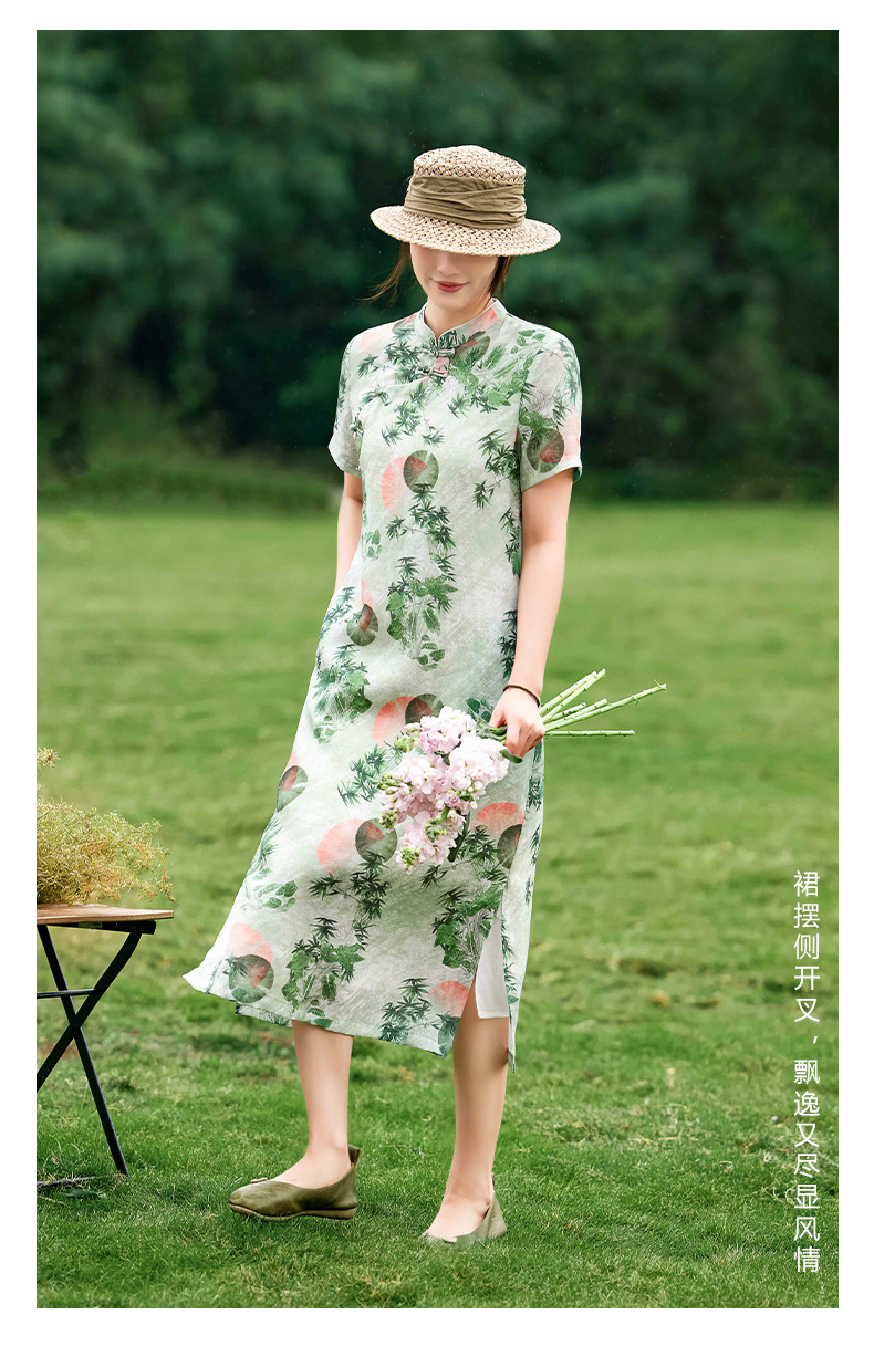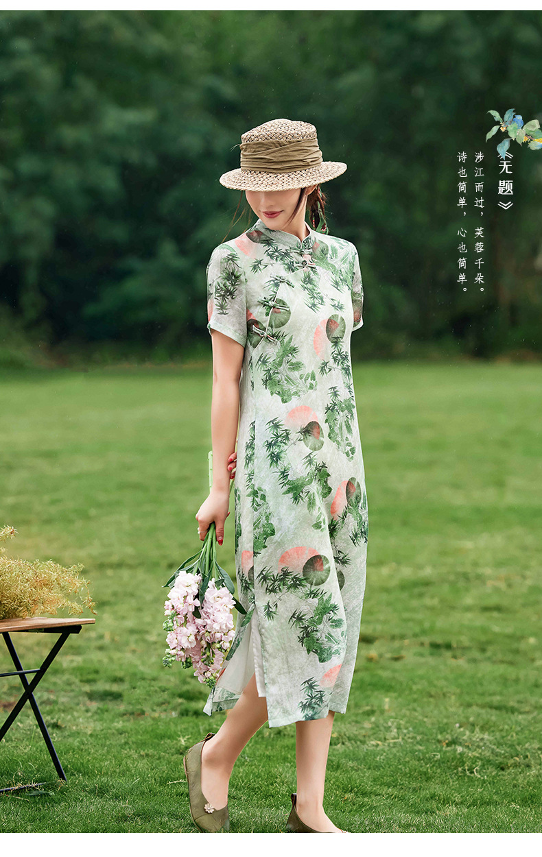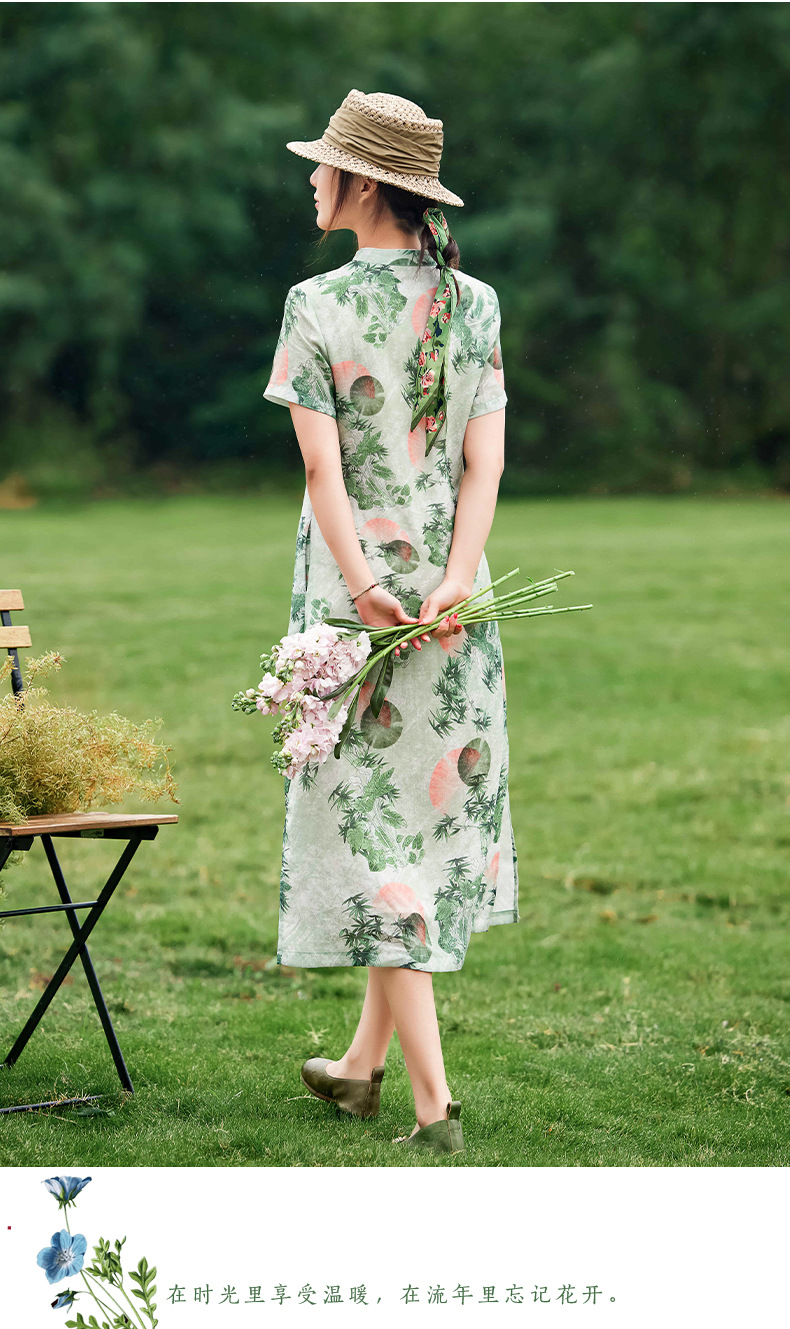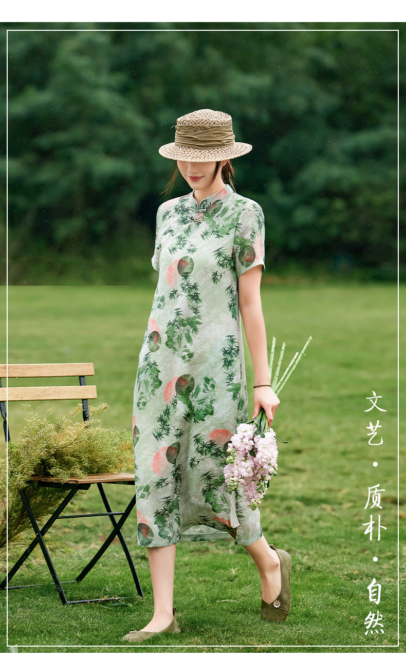 HM-S351苎麻印花改良式旗袍裙立领 夏季新款短袖文艺复古竹子花色连衣裙