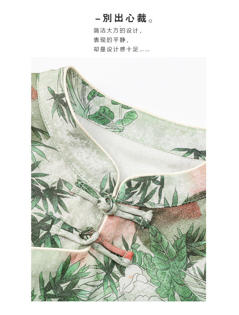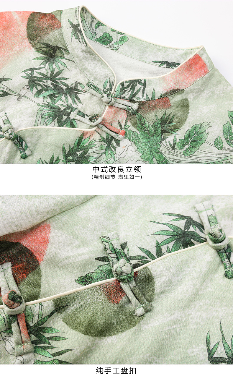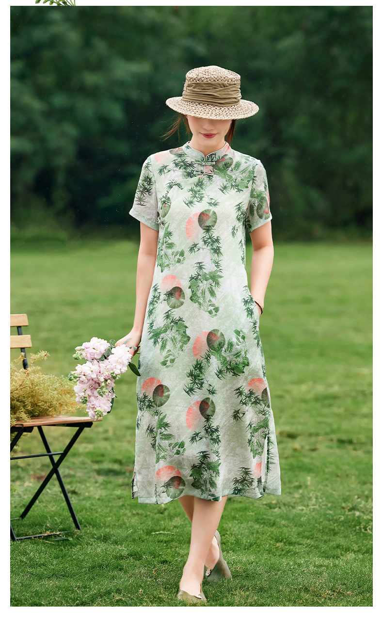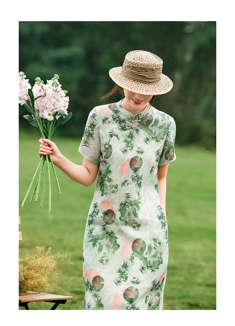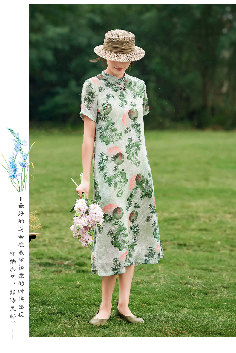 HM-S351苎麻印花改良式旗袍裙立领 夏季新款短袖文艺复古竹子花色连衣裙