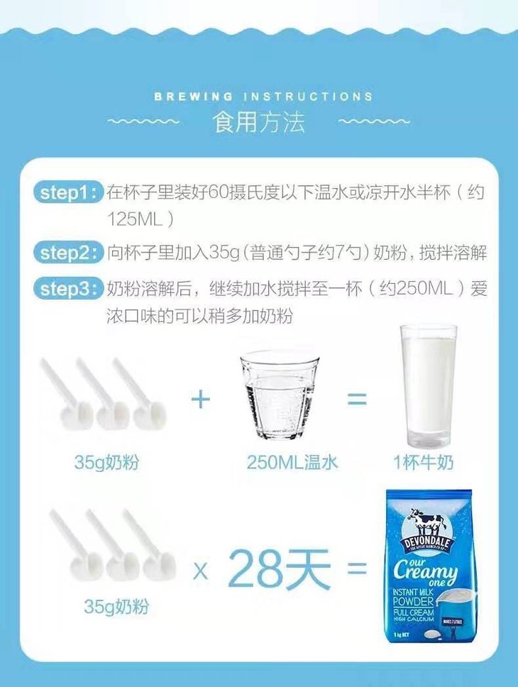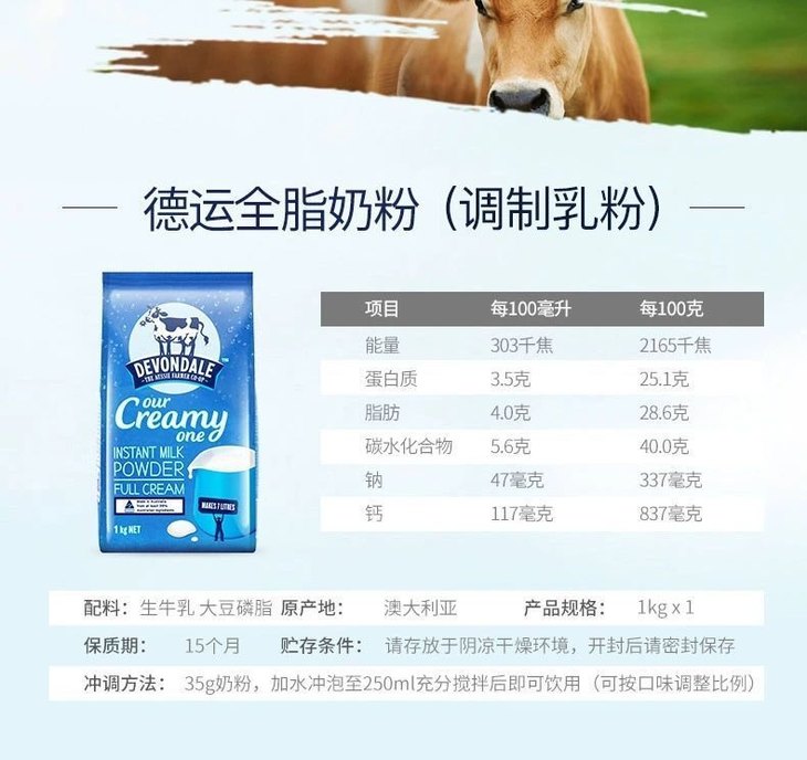 澳洲进口德运全脂高钙成人 老人 学生 牛奶粉1kg【一般贸易】