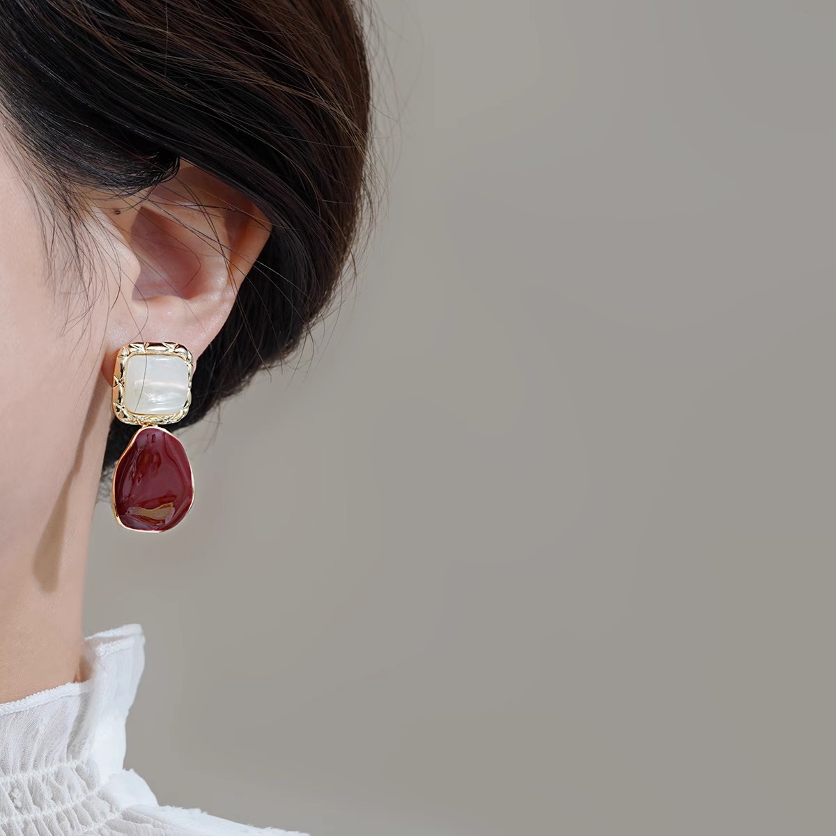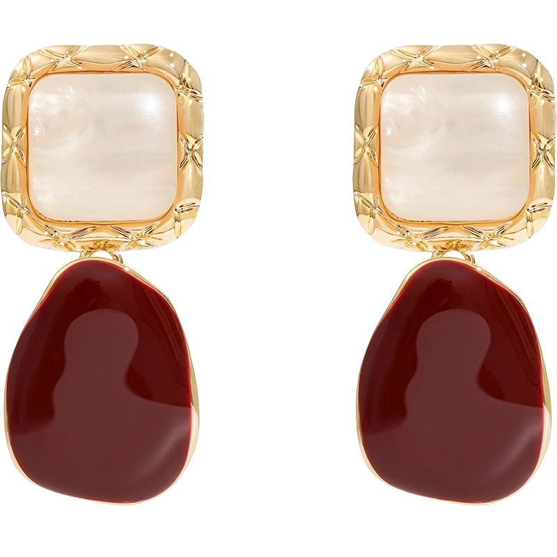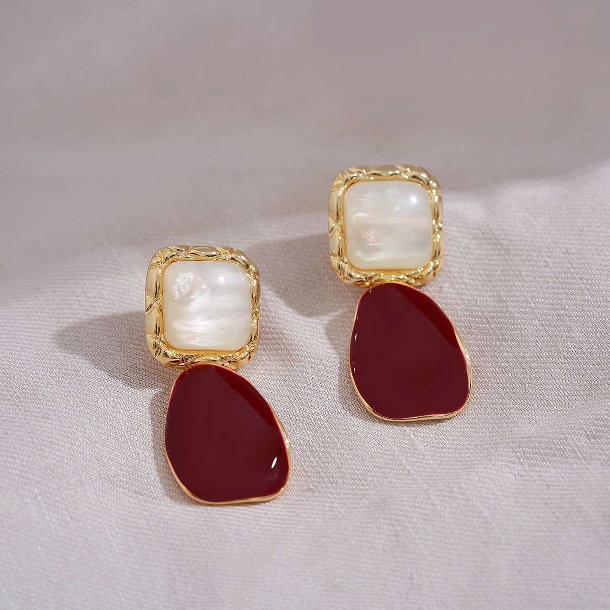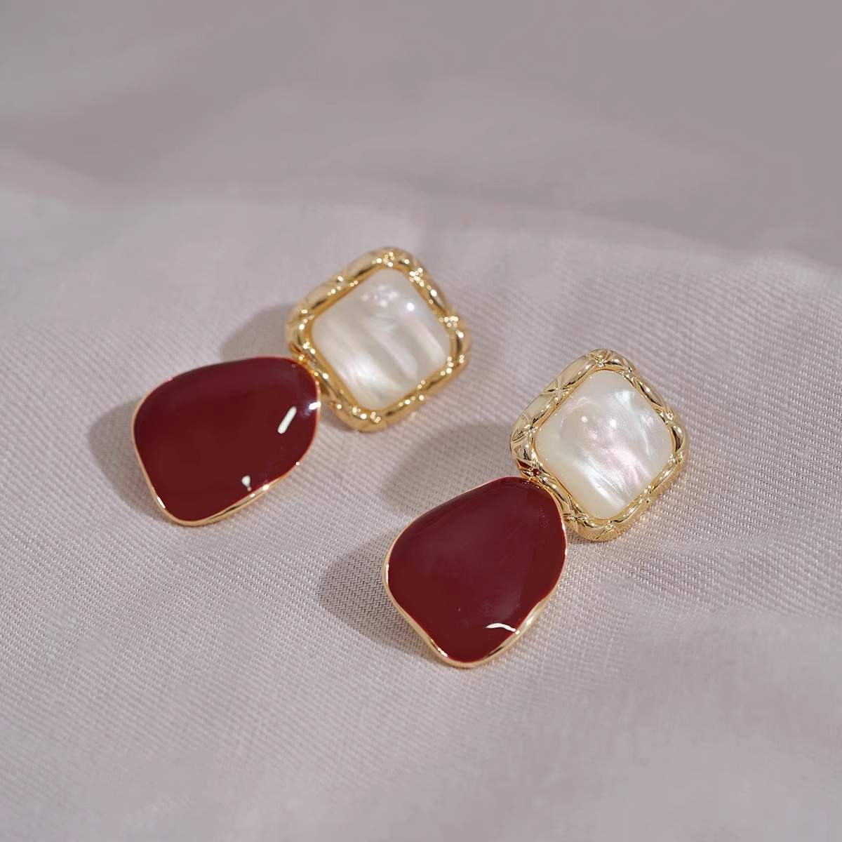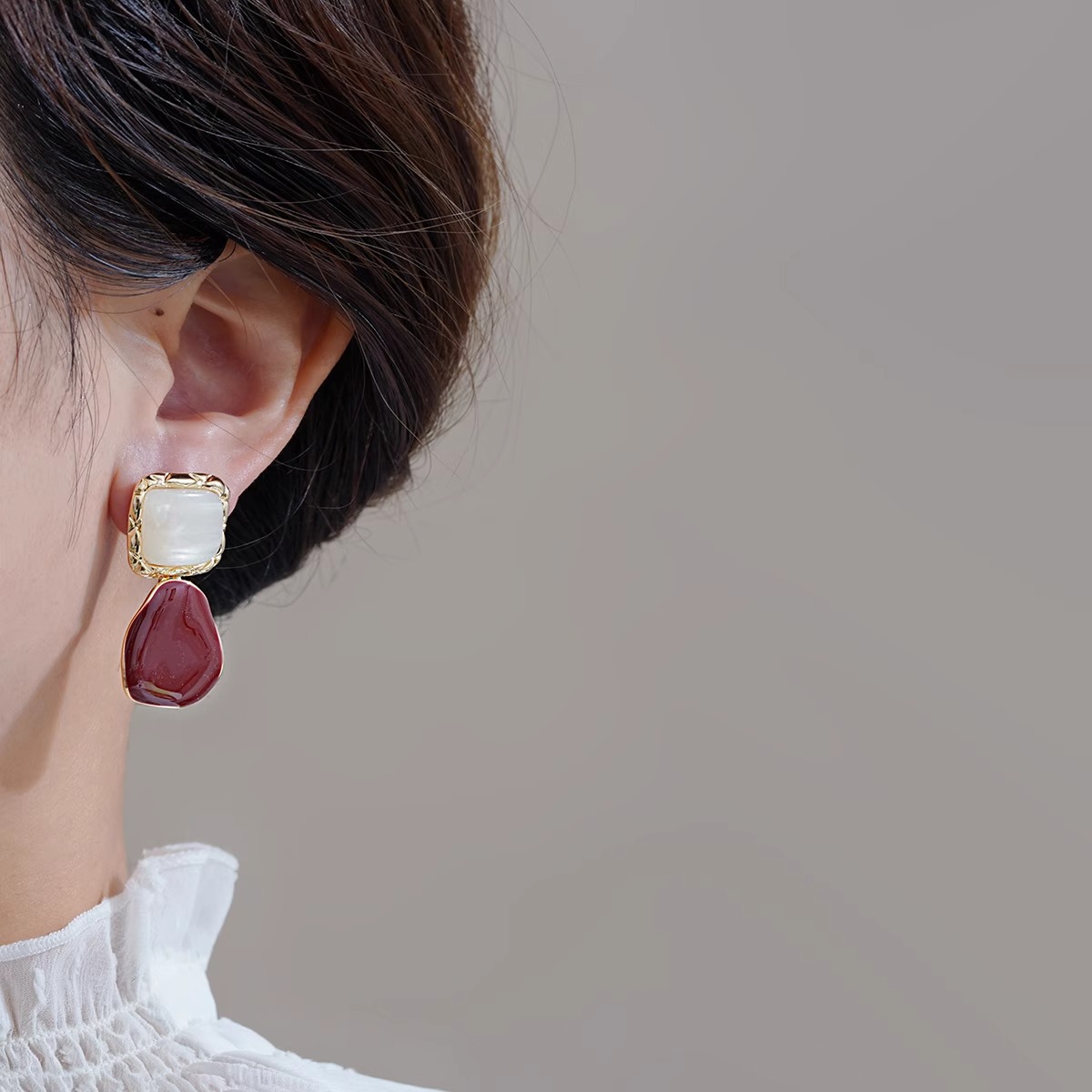 雀说高级感仿贝复古耳坠法式赫本风酒红色耳环气质名媛港风耳饰新款AL0879