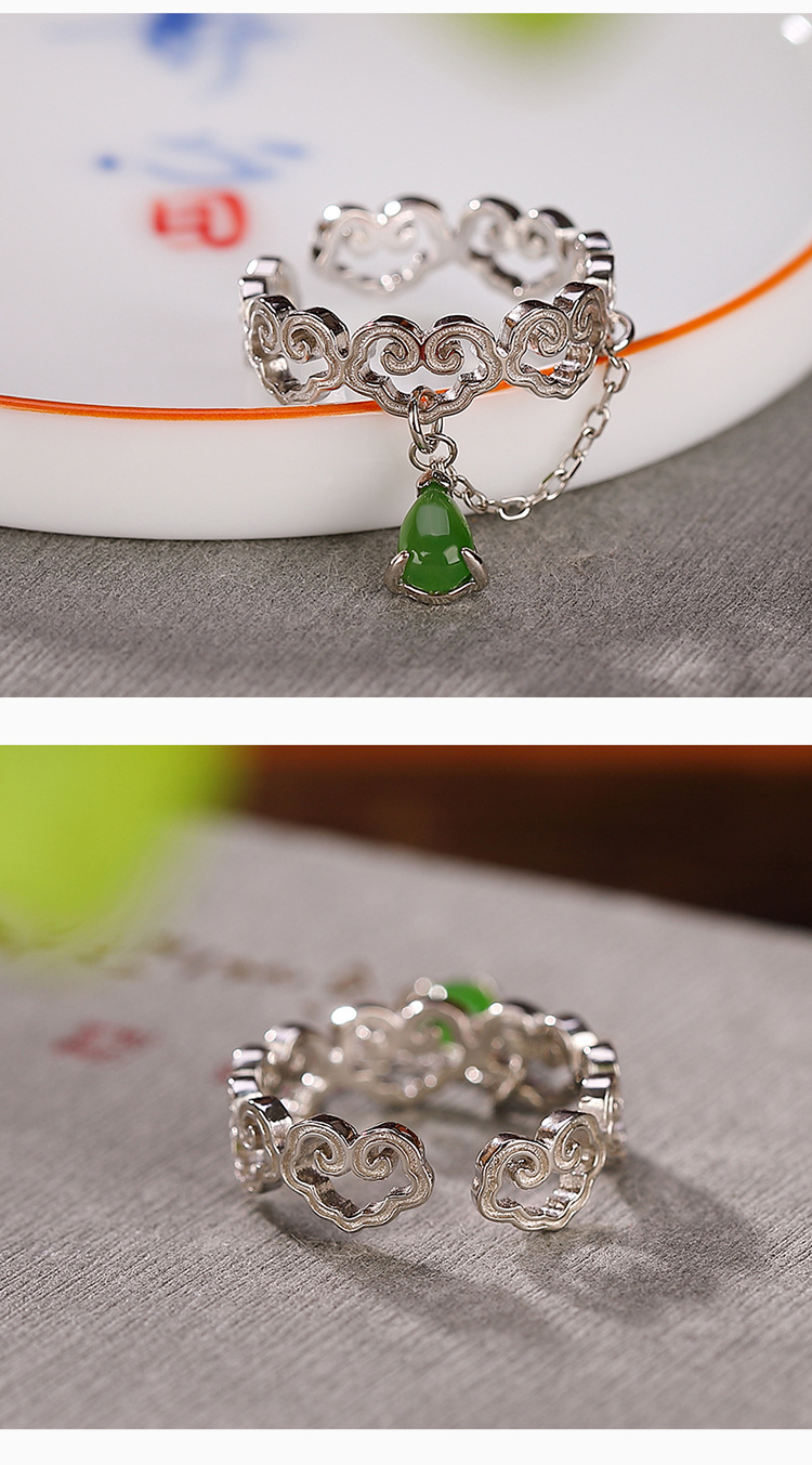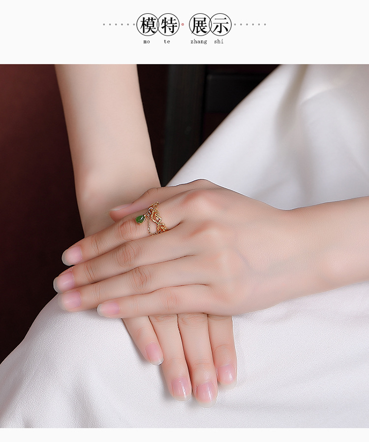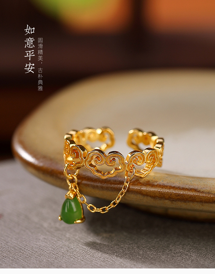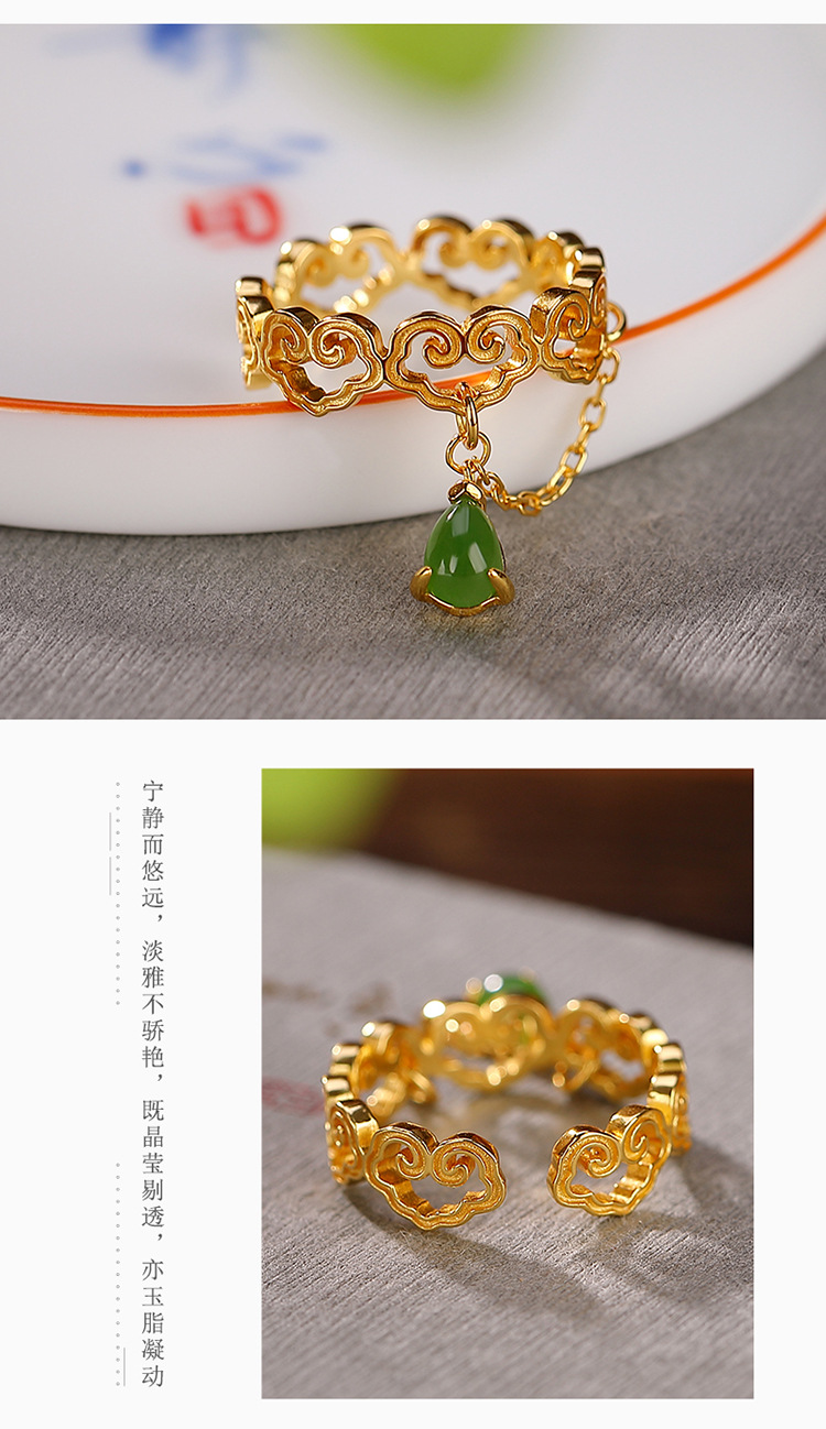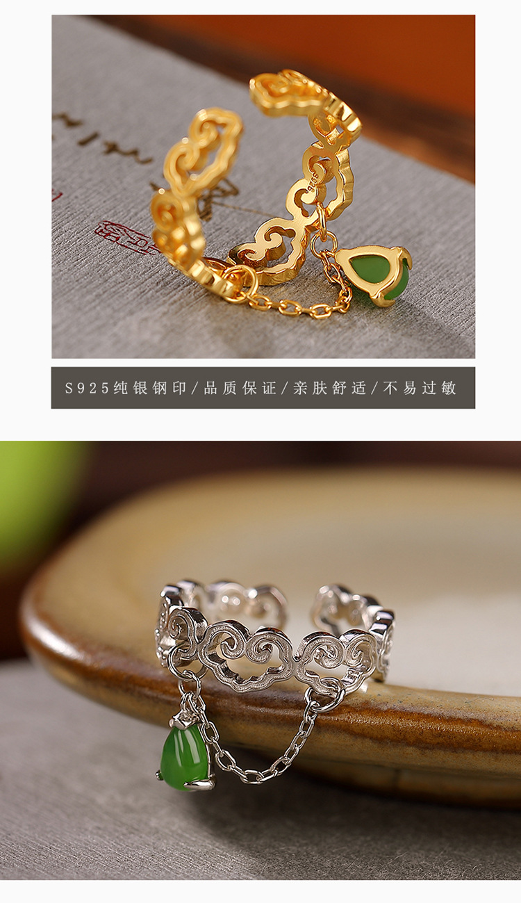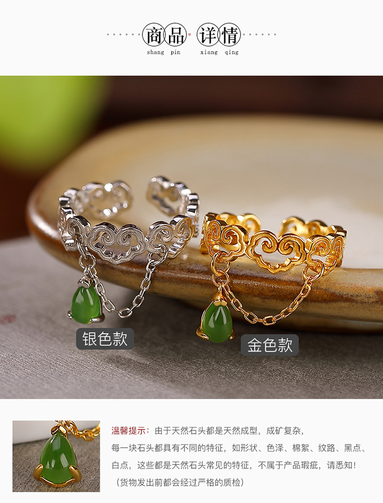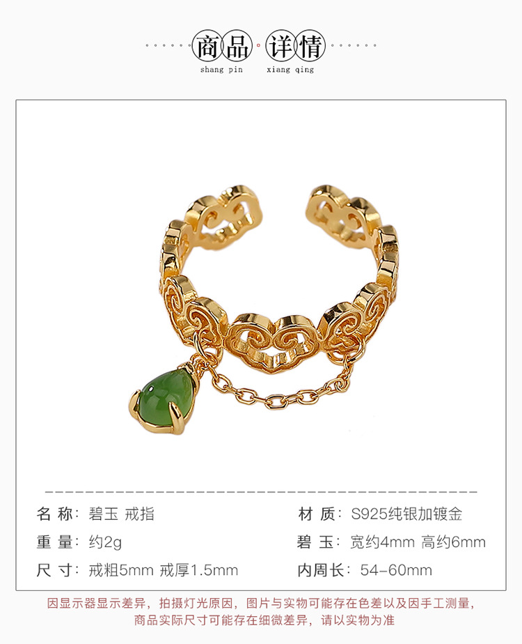 S925纯银镀金和田玉碧玉,如意水滴ins风链条戒指指环CW-JZ05512