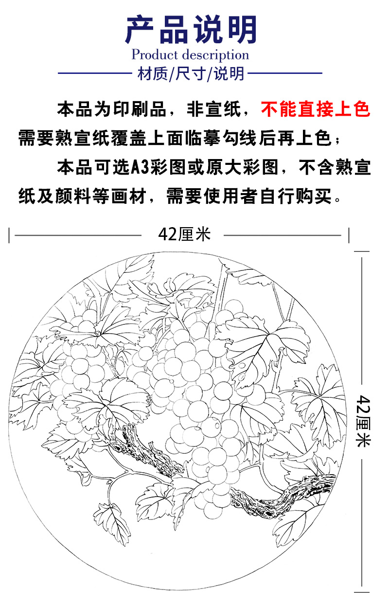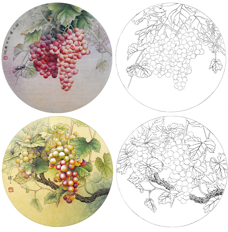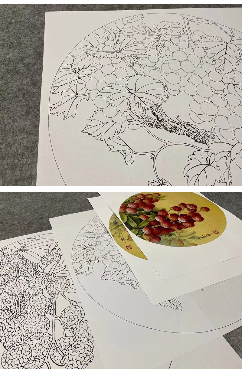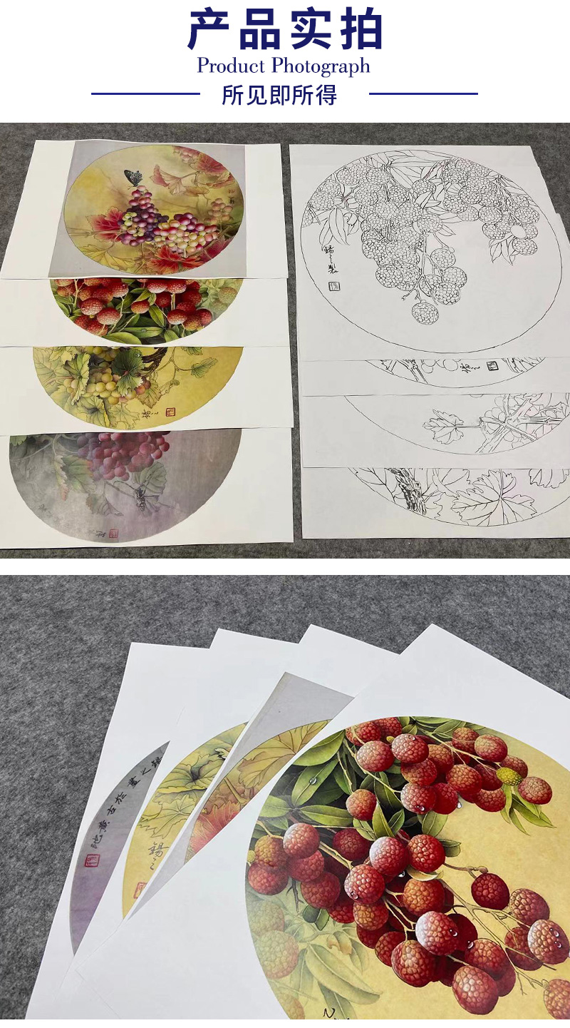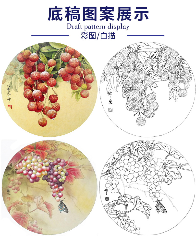 孙锡之工笔花鸟画白描底稿葡萄荔枝小品一套四幅册页初学者尺寸42×42厘米TA01
